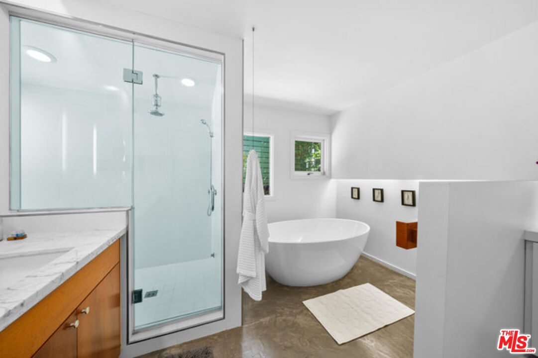 AVAILABLE MARCH 1st, 2026 | A one-story, Mid-Century Modern Home located in Malibu, minutes from the beach and the Paul Getty Villa. The front walkway, a twisting pathway, leads you to the front door. The front yard is landscaped with exotic cactus plants. This house offers 3 bedrooms, 3.5 bathrooms, and a den. An open floor plan that connects the Living room, dining room, den, and kitchen to the back yard and the side yard. There are Concrete floors throughout the house. A bright house that offers floor-to-ceiling glass doors and skylights. Minimal, modern furnishings to evoke a sense of space. The kitchen has walnut cabinets with Blue walls, a Viking oven, and Carrara marble countertops, with plenty of counter space for preparing food and cooking. The kitchen opens up to the side yard with a seating area, a water fountain, and an outdoor gas oven/BBQ. The den/TV room is open to the kitchen. The primary Bedroom features high ceilings, glass walls, and a queen-size bed. The main bathroom includes a white oval bathtub and a white shower stall with a steam bath. The dual sink Mahogany cabinets create a mid-century vibe. A private patio with an ornamental wall is in front of the primary bedroom, featuring beautiful landscaping and a hammock for relaxation and to enjoy the sounds of the birds, offering complete privacy. There are two additional bedroom suites. One of the rooms is being used as an office with bookshelves and a long desk. The sofa bed in this room turns into a full bed. The third-bedroom suite features a queen bed and a full bathroom, opening to the backyard with beautiful landscaping, mountain views, and an Endless pool for swimmers. There is an emergency generator that, upon power failure, automatically starts and powers the home to full capacity indefinitely.