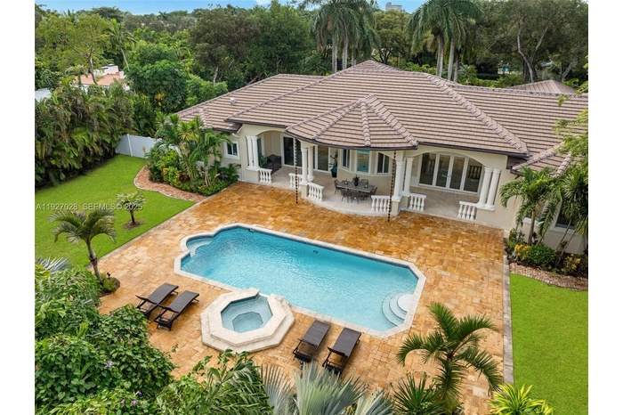 Step outdoors to your private tropical sanctuary: a sparkling pool and spa surrounded by lush greenery, covered terraces, and ample lounging areas perfect for both relaxation and entertaining. A long brick driveway, manicured grounds, and elegant entryways further elevate the property’s impressive curb appeal.