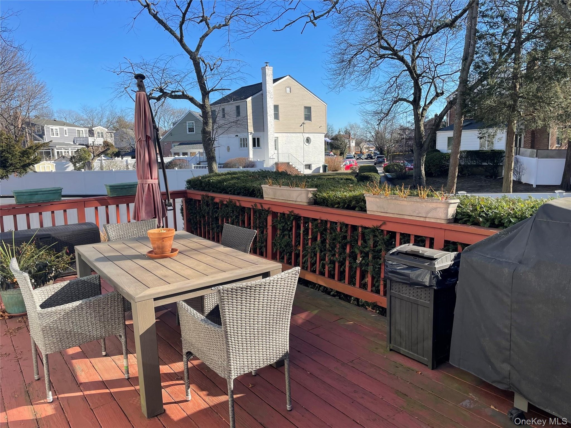 The backyard is equipped with a large wooden deck, ideal for outdoor entertaining and relaxation.