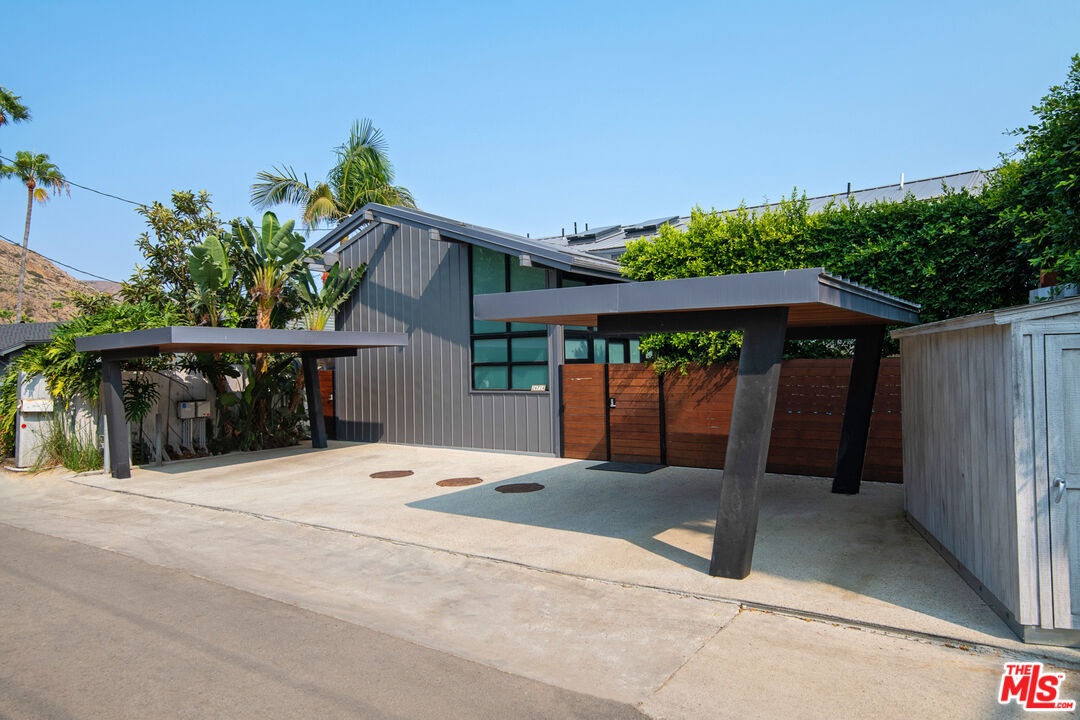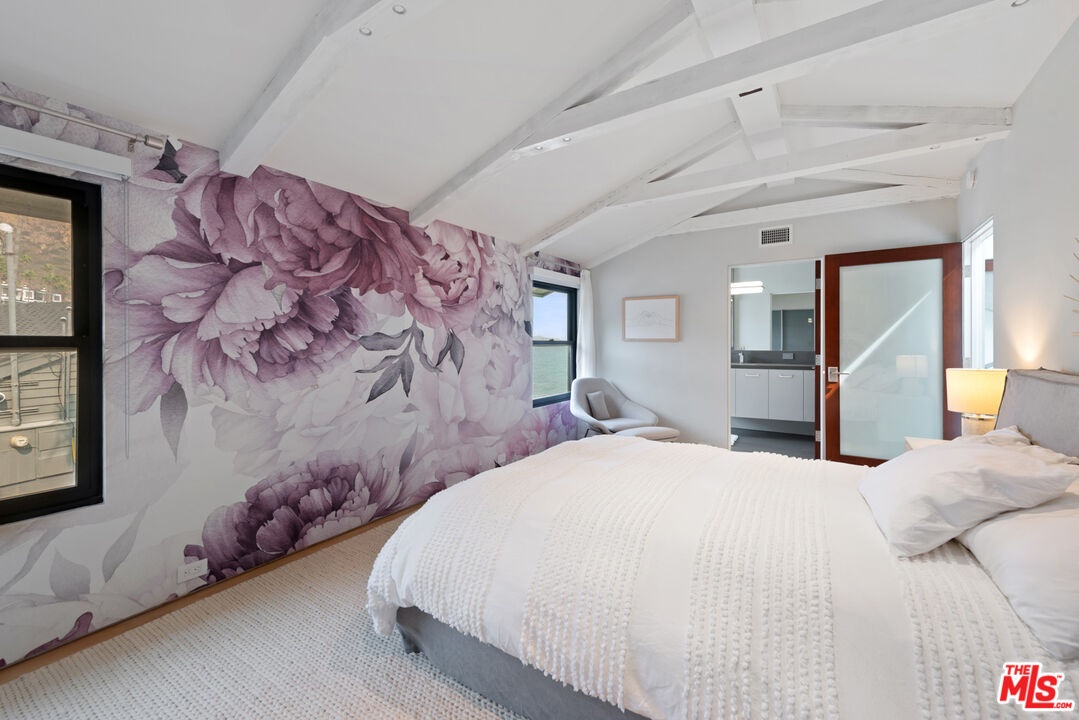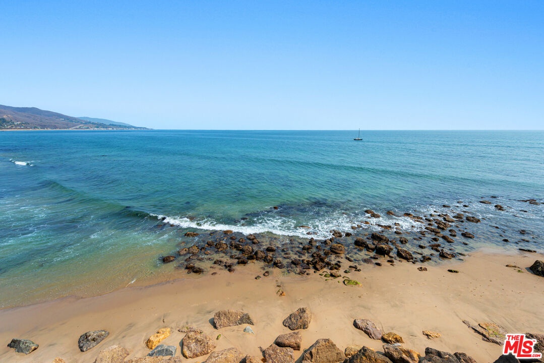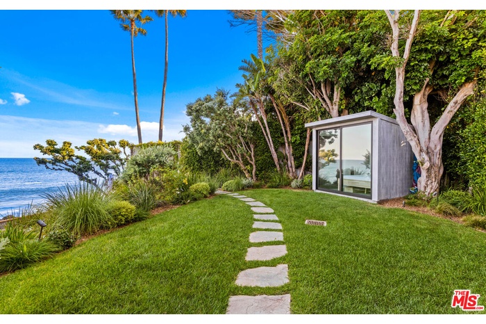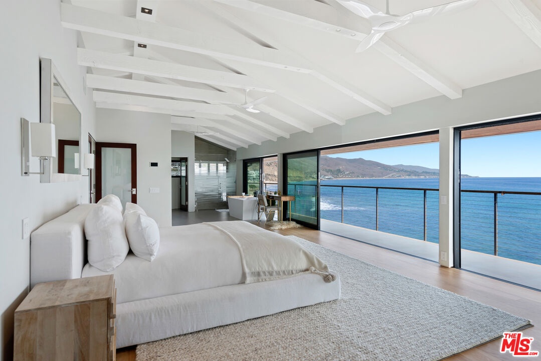 Updated contemporary on a double lot with rare 100 ocean frontage and a large landscaped lawn with hammock and a wood-and-glass sauna, perfect for lounging, dining, or working, and a detached guest room with a queen-sized bed and a 1/2 bathroom. A luminous entry hall to the surf break and non-stop ocean panorama, this stunning beach home with seamless indoor-outdoor flow, sensational views, and gorgeous open-plan design has everything you could possibly want for living the Malibu lifestyle. A private haven that is ideal for tranquil relaxation and sophisticated entertaining on a gorgeous cove with direct beach access, this special corner of paradise features wraparound decks, exceptionally high ceilings, skylights, enormous walls of glass facing onto the views, and beautiful wood floors. Step down from the entry to a sleek and sparkling great room with living, dining, and kitchen areas that open onto a beachfront deck through huge glass accordion doors, and to the entertainer's deck at the side of the house. The living room area has built-in shelving, a ceiling fan, an enormous flat screen, and a chic hanging fireplace in the corner. The open kitchen has a large island with bar seating, marble countertops, quality appliances, and temperature-controlled wine storage. There is one bedroom and a bath on the entry-level and two ocean-view, en-suite bedrooms, and a laundry room on the upper floor. The majestic master suite is enormous, with exposed beams, two ceiling fans, a fireplace, built-in shelves, a huge custom closet, a spa-style bath, and a wall of glass opening onto a full-width oceanfront balcony with ample room for seating and star-gazing. Accessible from the kitchen and from the lower-level deck, the entertainer's deck is furnished with a beautiful stone-clad outdoor kitchen and barbecue, a Jacuzzi brand spa, and ample seating and dining. Two steps down from the deck is a beachfront gravel area with additional seating, a fire pit, and steps leading to the beach. This amazing shoreline property also has air conditioning, automatic window shades, a speaker system, a carport, under-deck storage for surfboards and bikes, and breathtaking views over the mountains, coastline, ocean, and islands.