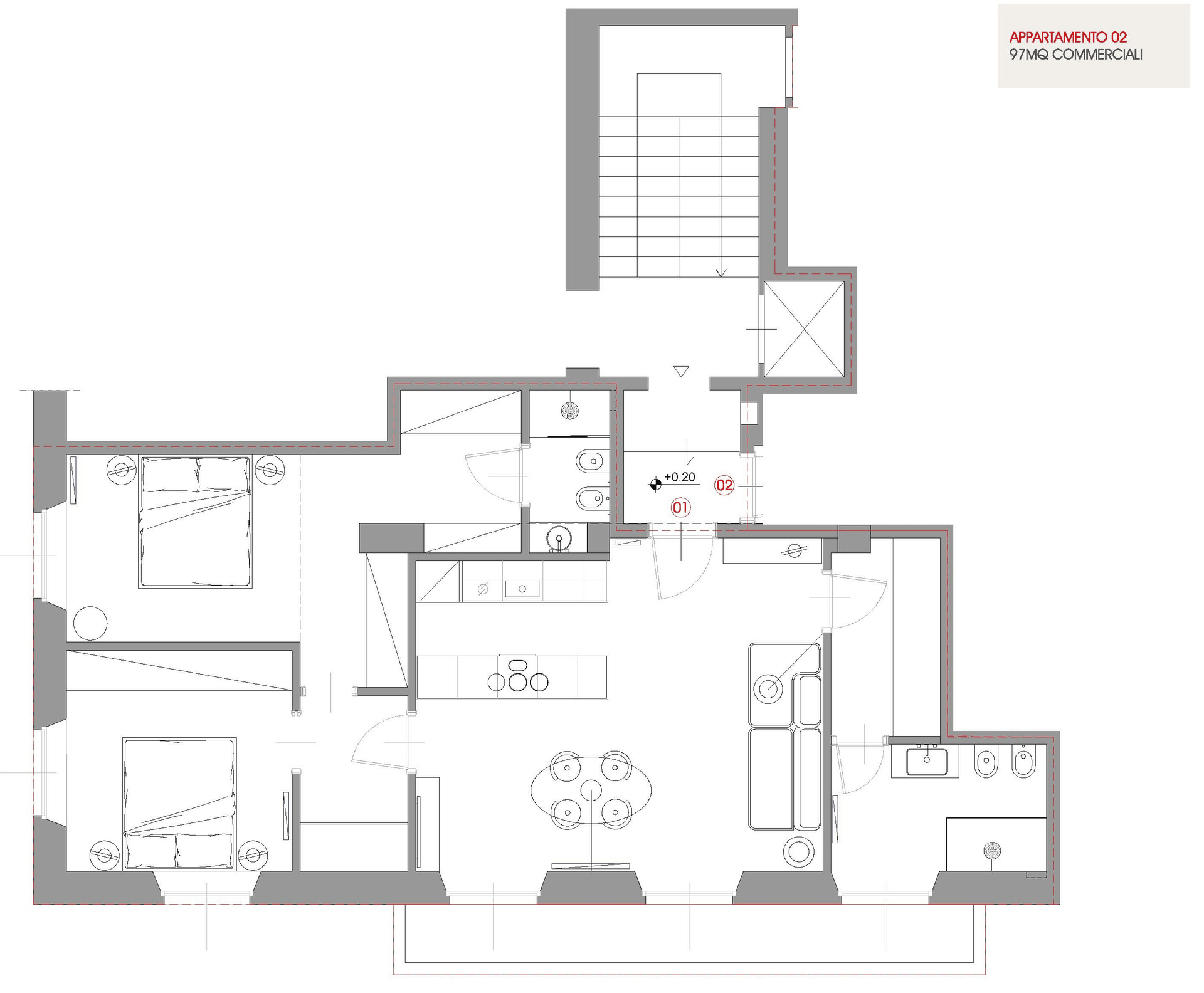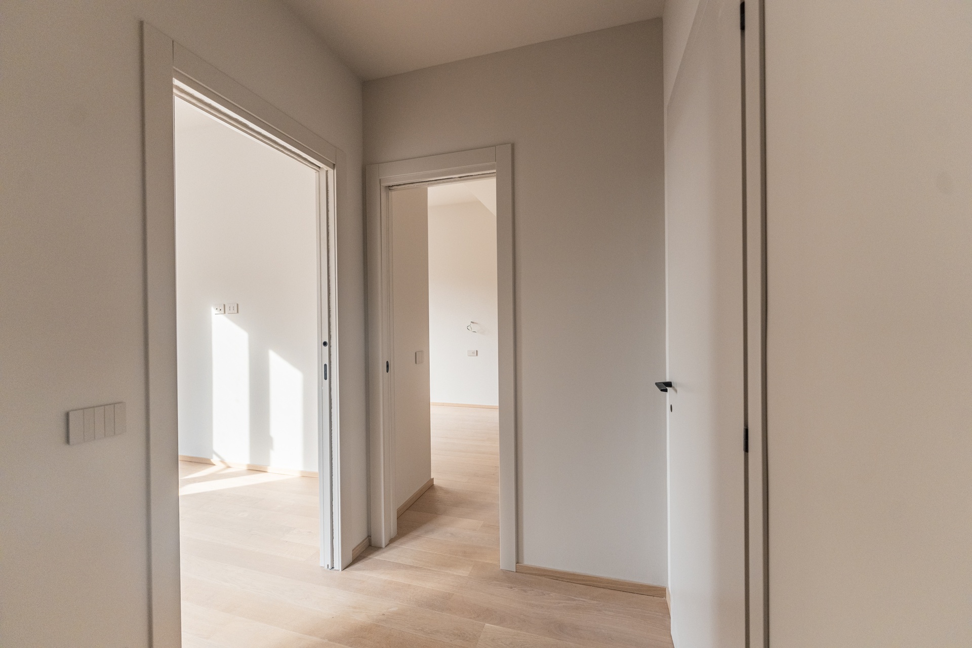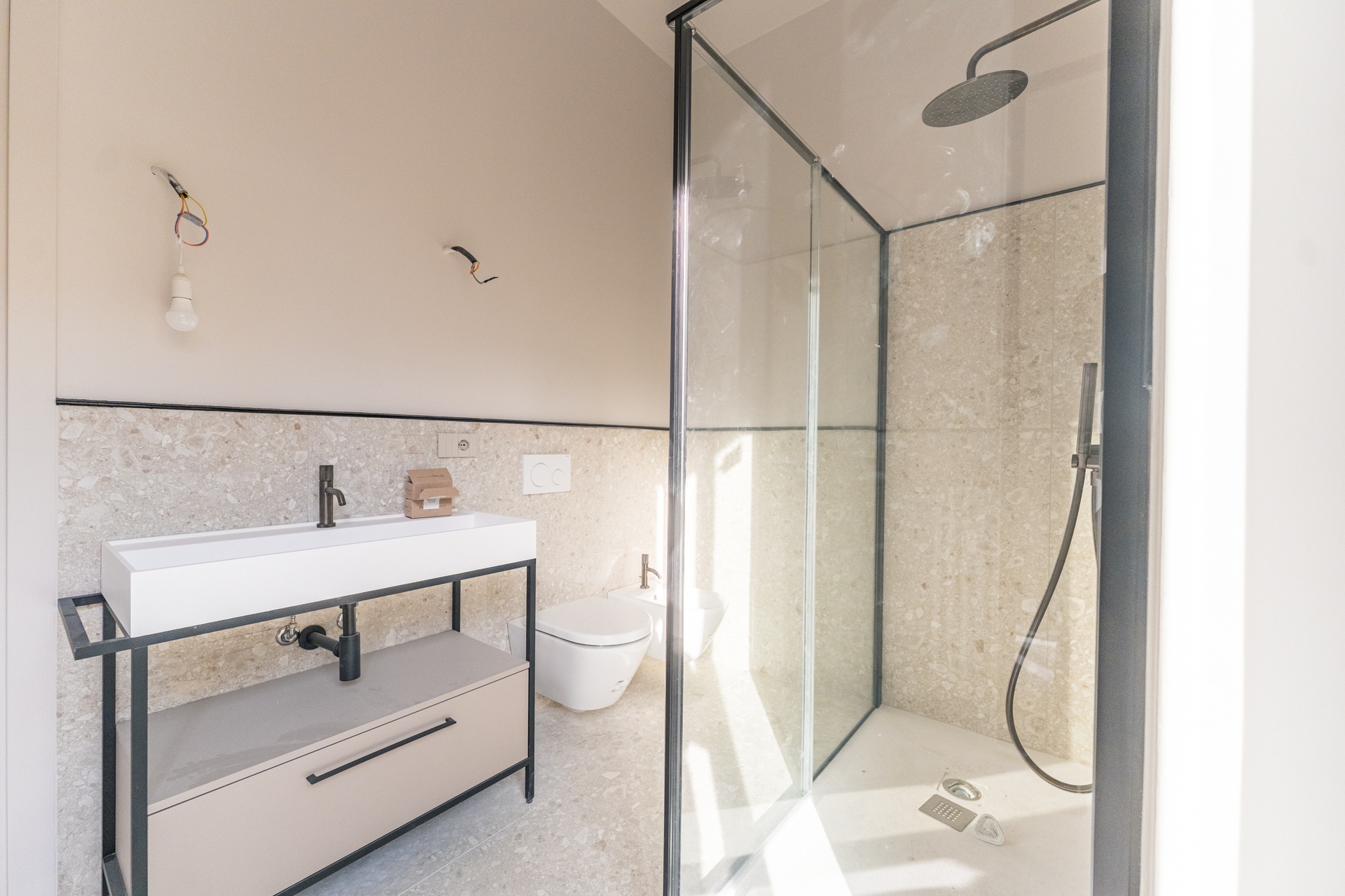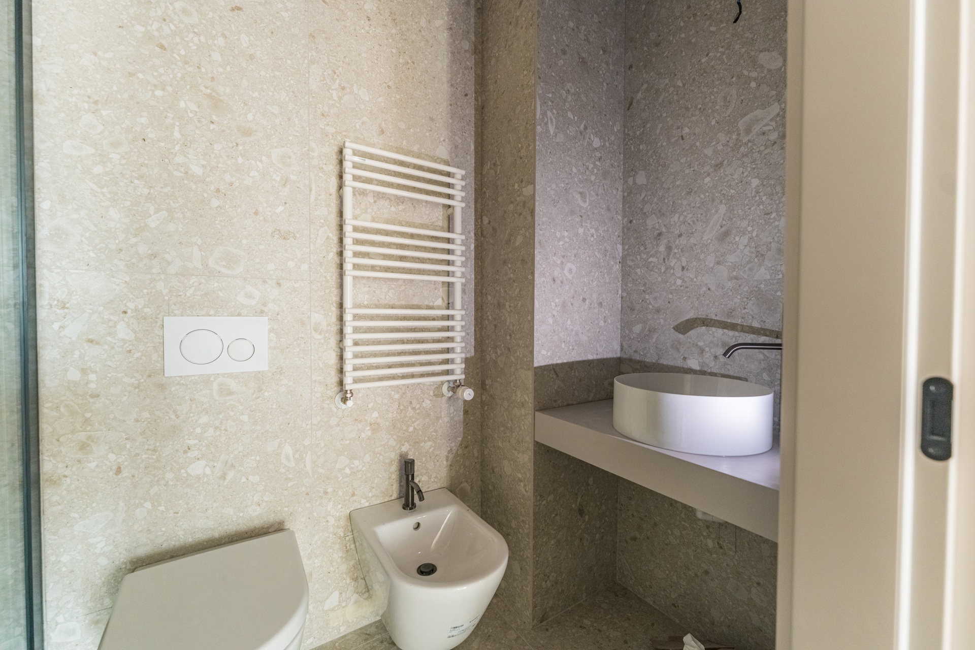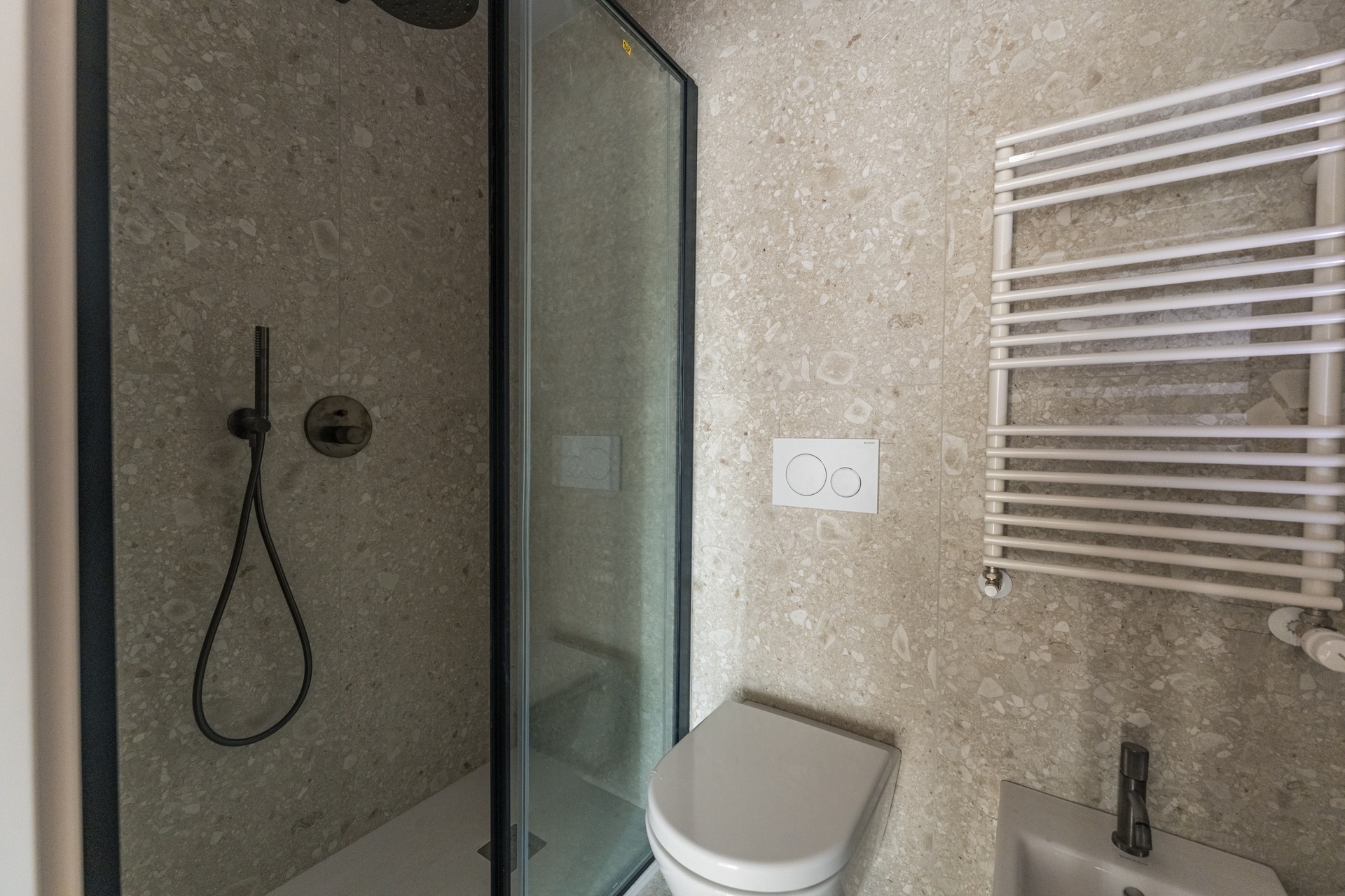 - Two windowed bathrooms, finished in marble-effect porcelain tiles and wall-mounted sanitaryware