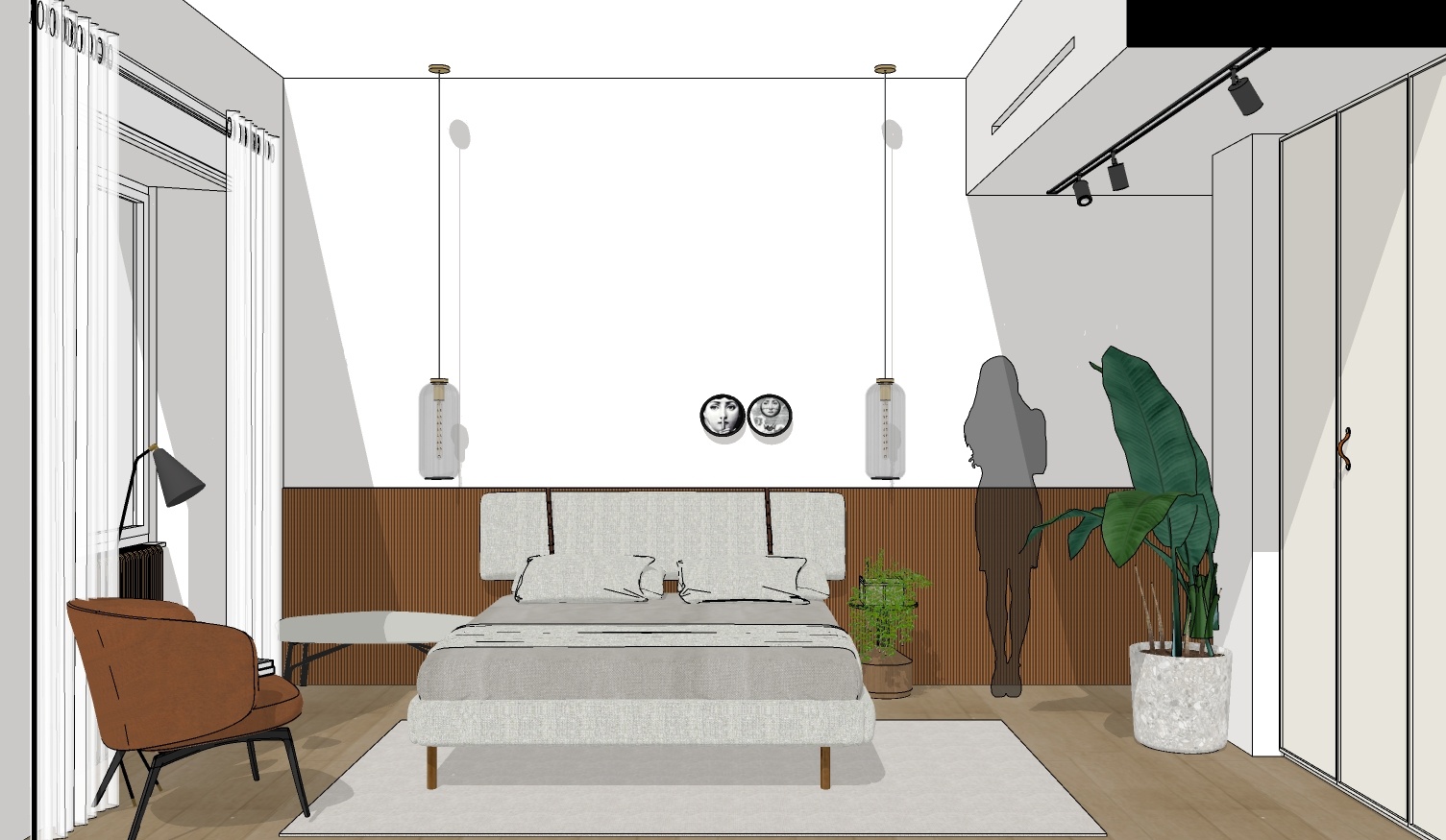 - Grooved wood paneling and walnut details in the bedrooms and entrance