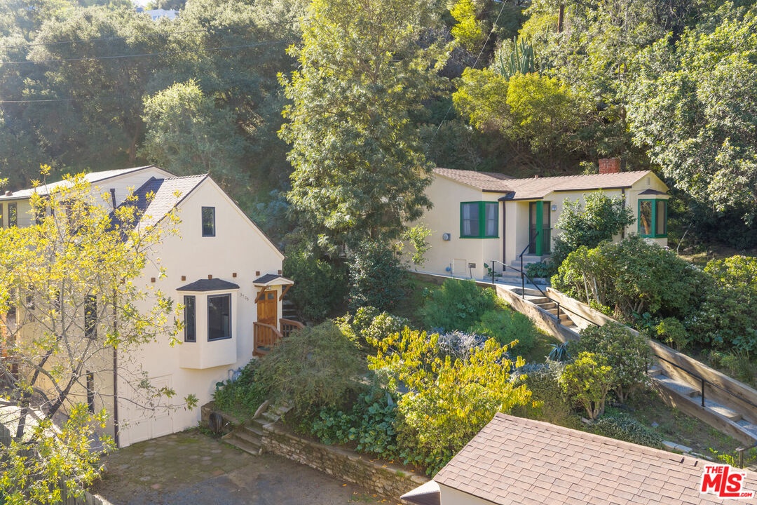 UNIQUE OPPORTUNITY! Enchanting hillside complex with 2 houses on 1 lot located in the Hollywood Hills West near Universal Studios. Ideal artist retreat / creative space for a Musician, Writer, Artist, Film / TV Editor, etc. Fantastic outdoor decks for entertaining guests. Ideal for an avid Gardener. Create your own Wonderland. // Primary (2-Story) Town House: Lower Floor: Enter into a bright spacious living room with wood floors. Open concept Dining area easily accessible to beautifully updated kitchen with stainless steel appliances and artistic colorful backsplash. Crisp bathroom with classic subway tiles and bathtub / shower plus linen closet. Upper Floor: Dreamy bedroom is a rustic wood paneled loft space with vaulted ceilings, cozy fireplace and scalloped-trimmed windows. Spacious armoire closet with drawers. Updated bathrooms with white subway tiles and blue accent tiles. Plus, 2 sinks and plenty of storage space. // Secondary (1-Story) Dream Cottage: Perfect for a work studio / office space or guests. Living room with bay window and decorative fireplace. Bathroom with vintage pink and white tiles complimented with classic subway tiles. Rustic kitchen with vintage tiles. Separate Dining Area off kitchen. Spacious bedroom with closet. Washer / Dryer for both houses. // One car detached garage with EV Charger with additional parking space with 2nd EV Charger. RV / Boat parking available. Outdoor patio with fenced-in pet-friendly yard. Bountiful storage underneath the main house. Magical bridge walkway to secondary house. Convenient central location. Close to Universal Studios / City Walk, NBC Universal. Easy access to 101 FWY and Ventura Blvd teaming with restaurants and shops.