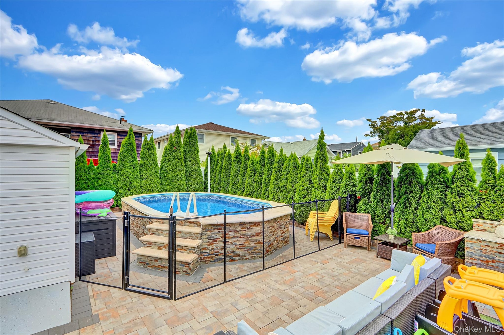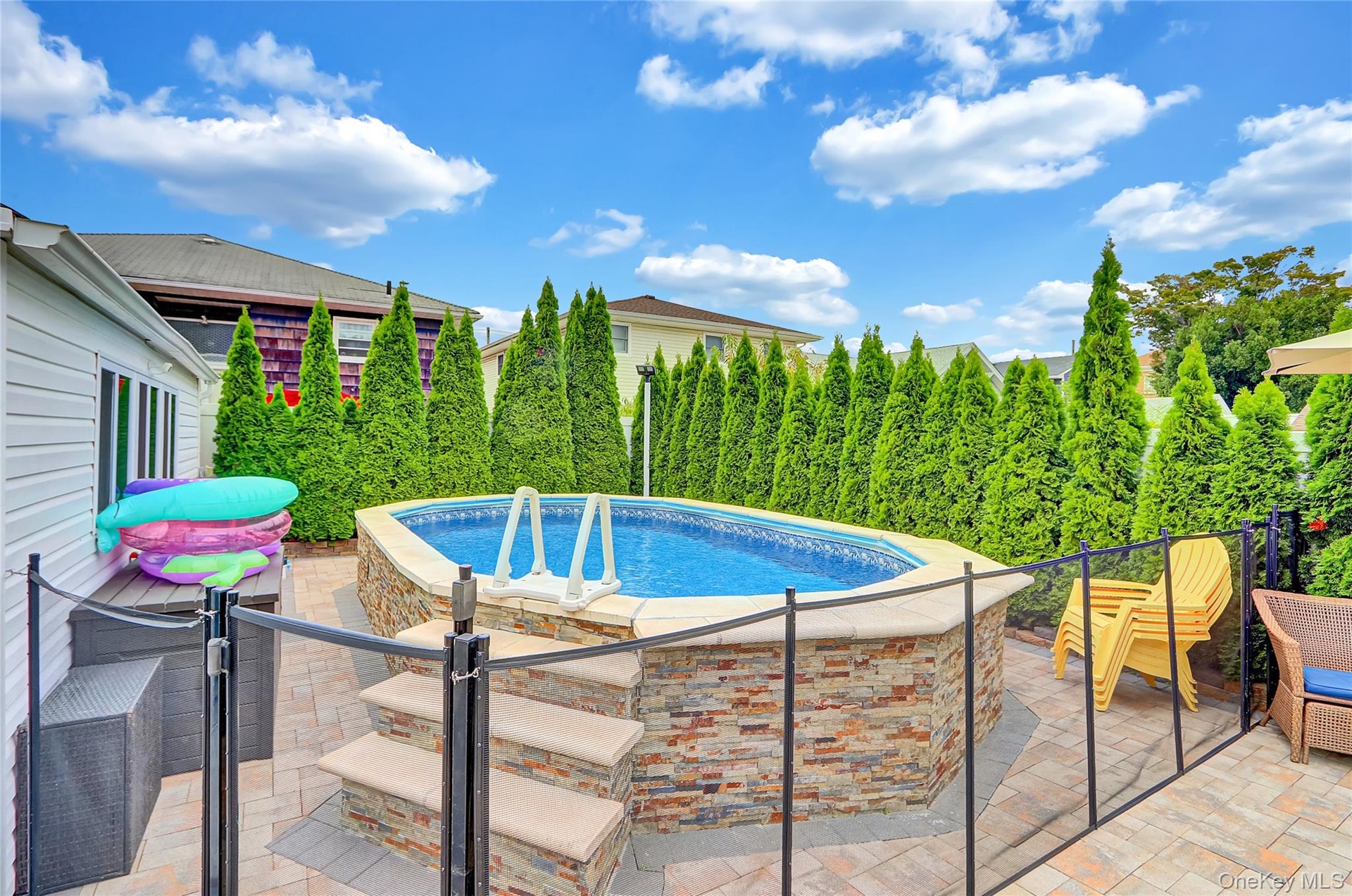 The backyard is a true summer retreat featuring a fully paved yard, a permitted heated pool for warm-weather enjoyment, and a large finished garage ideal for additional entertainment space, gatherings, or creative use.