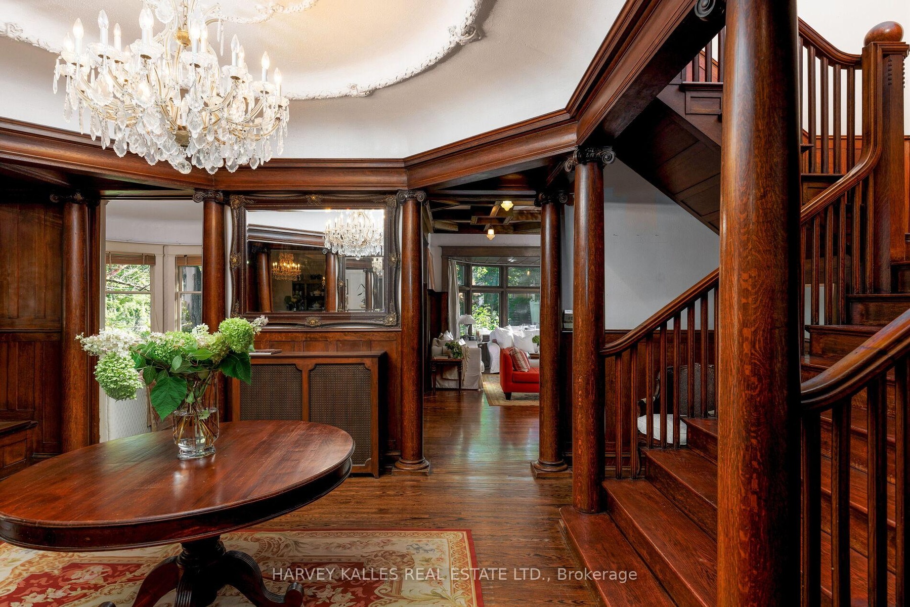 Nestled in Toronto's prestigious Rosedale neighbourhood, this landmark mansion occupies an expansive 100' x 122' estate-sized lot and offers over 7,500 square feet of impeccably designed living spaces. With 7 + 1 generously proportioned bedrooms, 8 bathrooms, and an exceptional third-floor loft, this grand residence seamlessly blends historic architecture with the scale, elegance, and functionality. Originally built circa 1900 for the distinguished Applegate family, the home has been meticulously restored and thoughtfully maintained to preserve it's architectural heritage including a self portrait stain glass window of Mrs. Applegate herself. Drawing inspiration from the classical traditions of Italian Renaissance architect Andrea Palladiio - most notably his iconic Villa Rotunda in Vicenza, Italy - the home reflects timeless design and exceptional craftmanship. A majestic octagonal central hall, framed by twelve lonic columns, creates an unforgettable first impression and sets the tone for the rest of the residence. Throughout the home, rich period details abound: original oak hardwood floors, finely hand-craved oak mouldings and wainscoting, intricate millwork, and 6 fireplaces with decorative tile and brick hearths. The soaring 10-foot ceilings are adorned with ornate plaster crown mouldings, ceiling medallions, and oak-beamed details that speak to the home's historical significance. Expansive bow windows and beautifully preserved stained glass flood the interior with natural light and highlight the warm, elegant atmosphere. Outside, the property is a private oasis, surrounded by mature trees, lush landscaping, and tranquil gardens that offer rare serenity in the heart of the city. A detached two-car garage and additional parking for three vehicles provide added convenience. This is a once-in-a-generation opportunity to own a truly iconic Rosedale residence - an architectural treasure steeped in history and timeless charm.