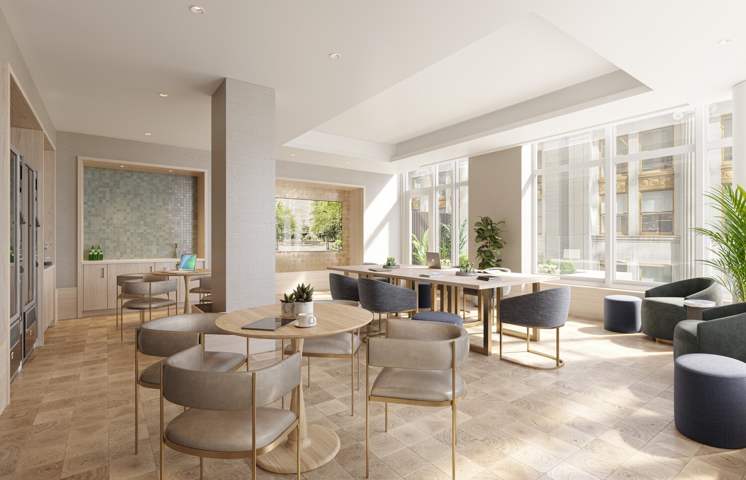 This thoughtfully designed building boasts two indoor lounges and outdoor terraces, a fully equipped fitness center and yoga studio, and several workspaces.
