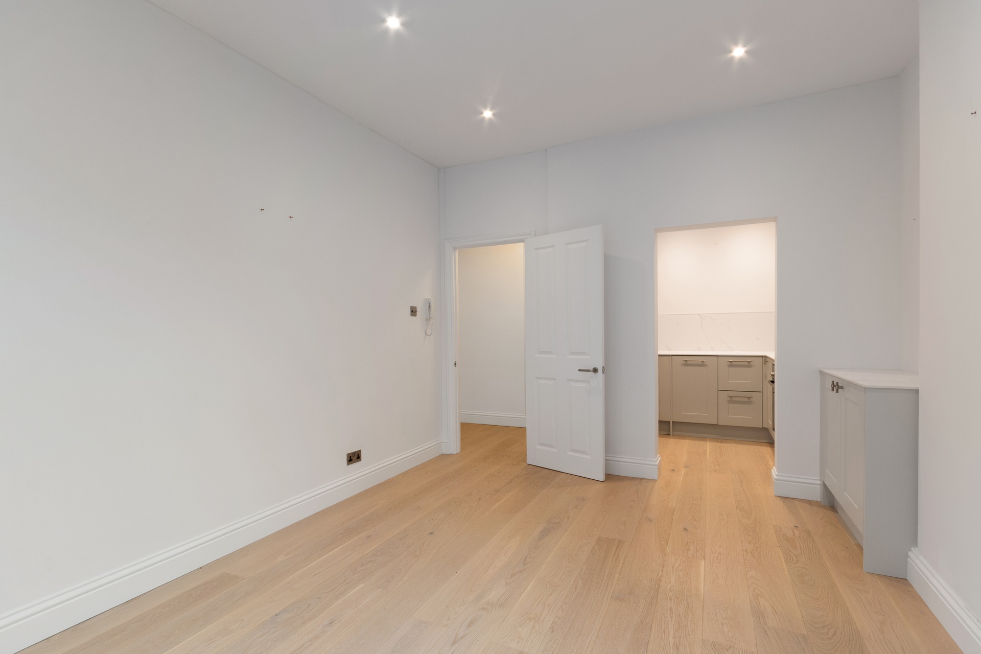 The bright and spacious living room benefits from high ceilings, bespoke alcove joinery with integrated power sockets, and a stylish semi-open-plan kitchen. The kitchen features a Bosch oven and hob, a full-size fridge/freezer, an integrated wine fridge, and a dishwasher, with elegant hardware inspired by Buster & Punch.