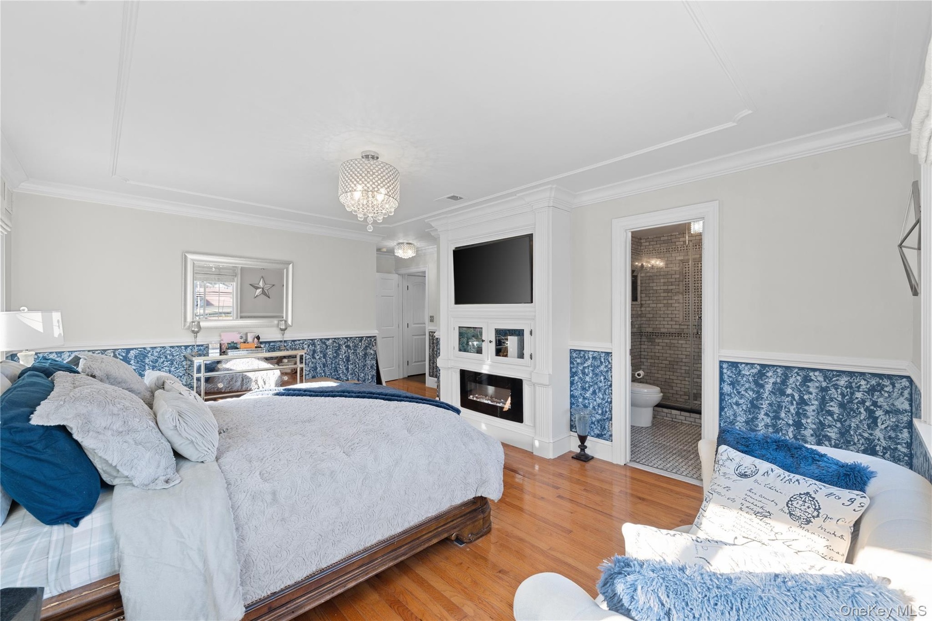 The main duplex showcases premium finishes including radiant heated floors on the first floor, towel warmer, custom wainscoting, elegant ceiling details, and a designer-inspired living room centered around an impressive electric fireplace. The layout flows into a refined dining area and a well-appointed kitchen with rich cabinetry, polished surfaces, and upscale fixtures. The first floor includes two bedrooms, and a full bathroom while the upper level offers a spacious primary suite featuring a beautifully designed fire place and a dual vanity bathroom. This unit also includes an in-unit washer and dryer.