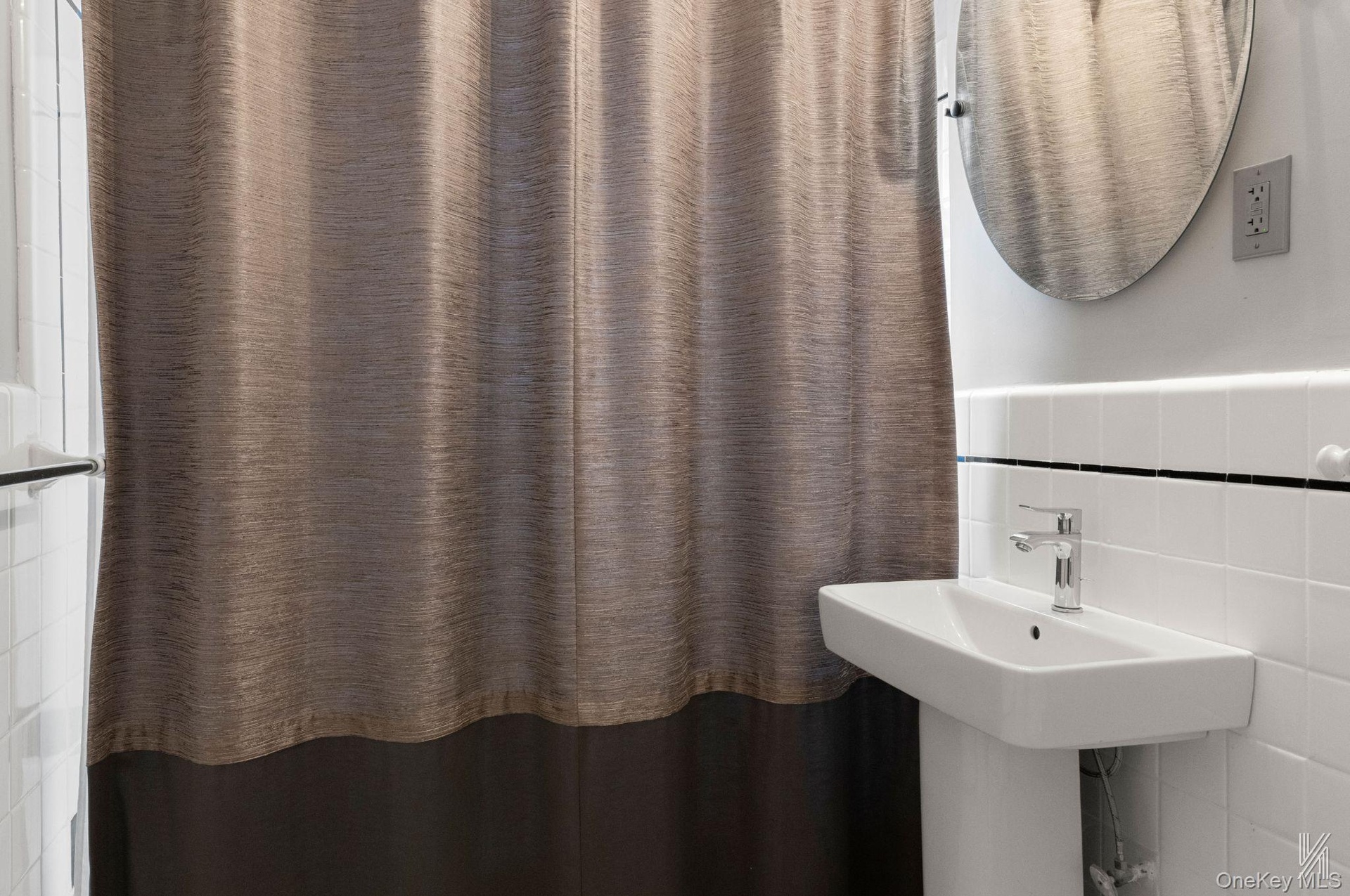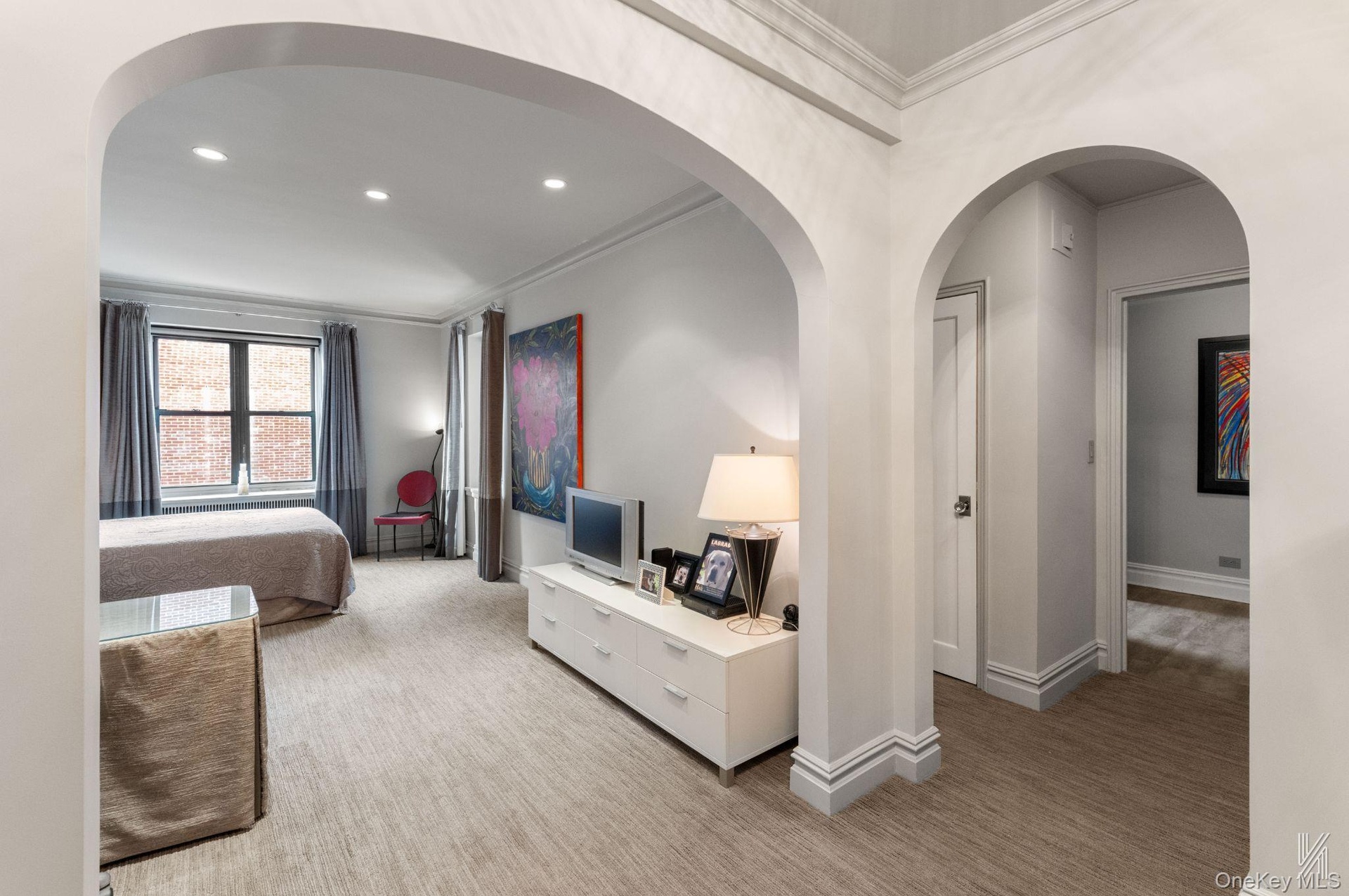 The living area is airy and inviting, thoughtfully proportioned to accommodate distinct living and sleeping areas. Custom drapes and roller shades add an elevated, tailored feel, while mid-century modern swing-arm sconces and recessed lighting bring warmth and ambiance. Throughout the home, classic glass door knobs paired with new doors and three generous closets underscore the careful balance of prewar charm and modern functionality.