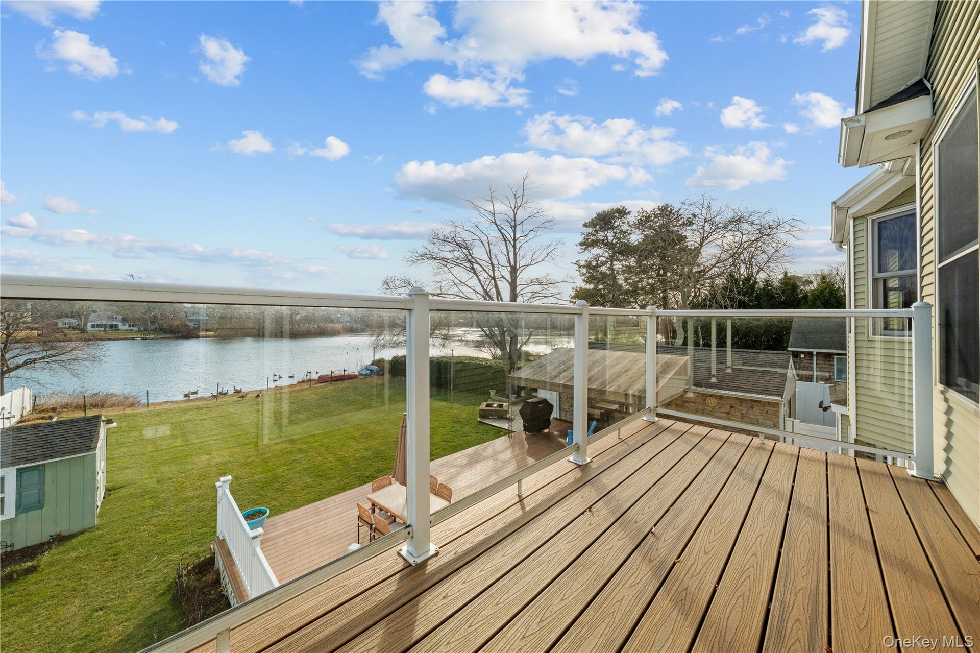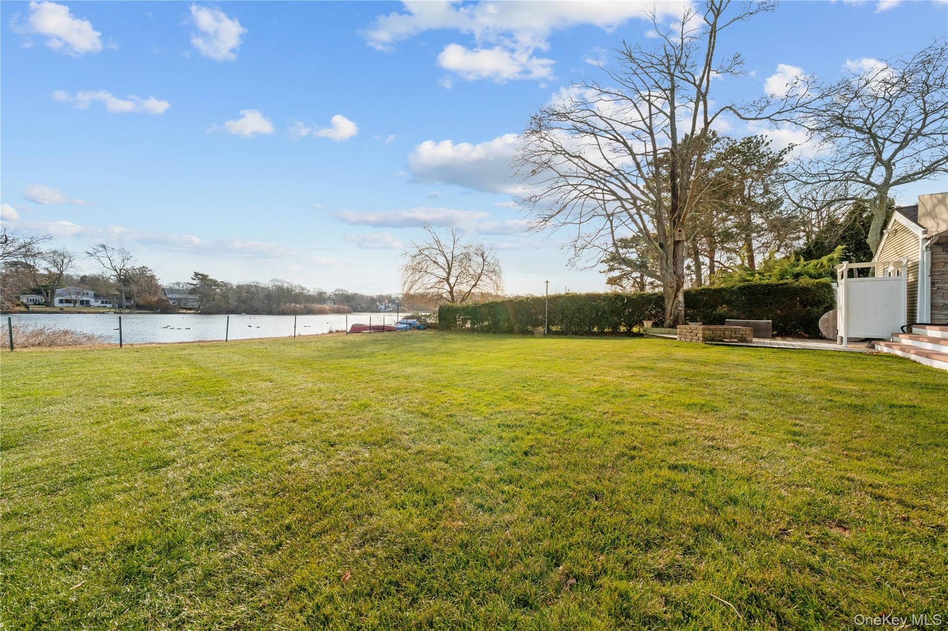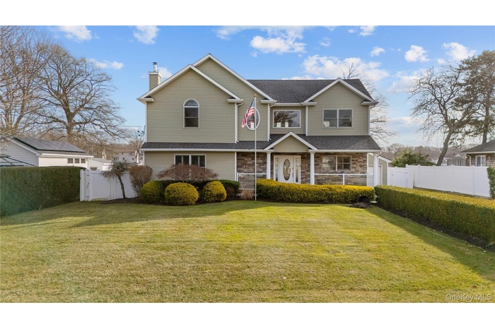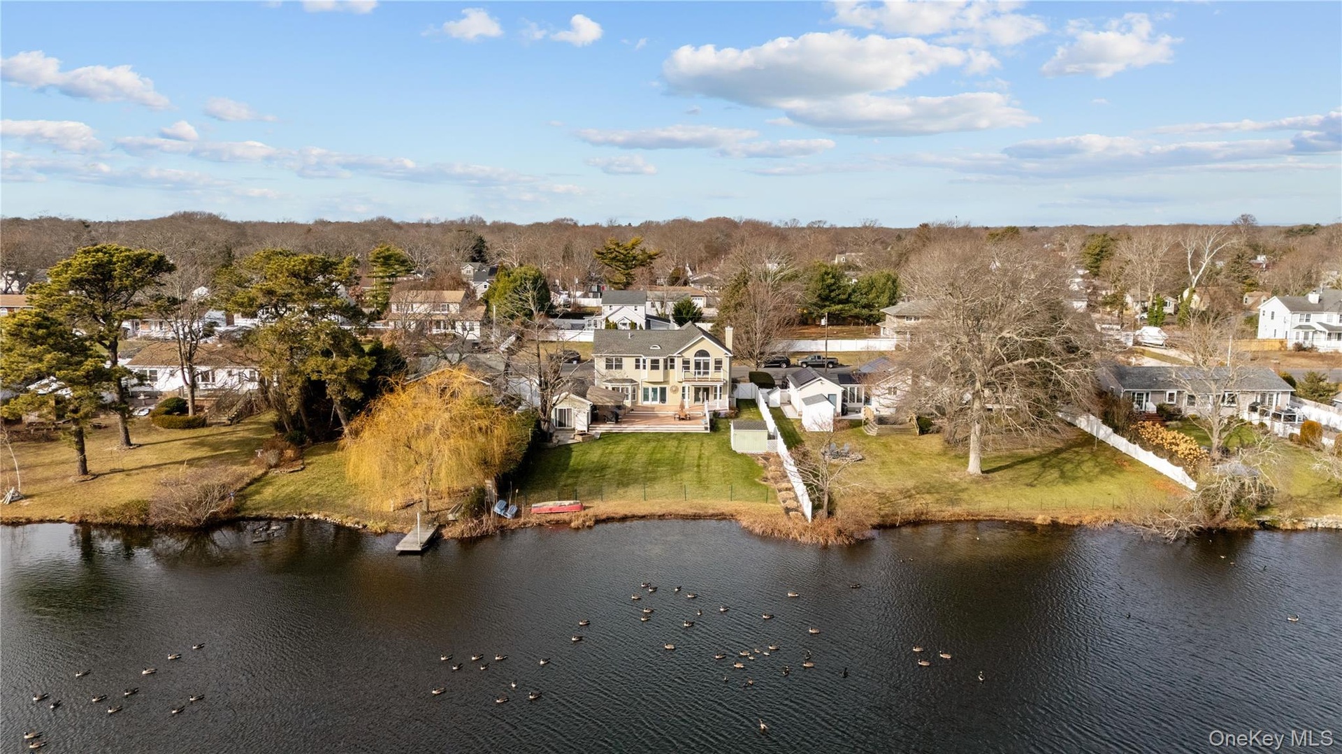 This waterfront modern Colonial, dramatically expanded in 2004, was thoughtfully designed to capture breathtaking, unobstructed views of Dunton Lake from nearly every angle. Offering over 2,000 square feet of contemporary living space, the home features a flexible, open floor plan highlighted by custom wide-plank hickory flooring and the convenience of a first-floor guest bedroom. Upon entering, you’re welcomed by a striking two-story foyer that sets the tone for the bright and airy interior. The main level flows seamlessly from room to room, enhanced by abundant natural light that accentuates the stunning water vistas. The oversized eat-in kitchen serves as the heart of the home, complete with granite countertops, rich pecan cabinetry, a center island with seating, stainless-steel appliances, a dual oven, and a gas cooktop—perfect for everyday living and entertaining alike. The second floor continues to impress and offers two additional bedrooms and a versatile sitting room—ideal for a home office, reading nook, or lounge. The modern full bathroom has been tastefully upgraded and includes a whirlpool tub, separate shower, and dual vanity, with convenient access from both the hallway and the primary bedroom. Every room on this level showcases tranquil views of Dunton Lake, enhanced by unique architectural details and an abundance of windows—including elegant Palladian designs. The primary bedroom elevates the experience even further with its private Juliet balcony overlooking Dunton Lake—an unforgettable highlight and the perfect place to savor your morning coffee while taking in the ever-changing scenery. Terrific storage options are available in the full basement and detached one-car garage. Additional interior highlights include Marvin windows with plantation shutters, Central Air, 200-amp electric service, and a generator for peace of mind. Outside, enjoy a two-level deck, fire pit area, outdoor shower, and in-ground sprinklers—all set on a beautifully landscaped 0.29-acre property. Fire Island beaches, local ferries, and vibrant Patchogue Village are just a short ride away. Your dream waterfront lifestyle awaits!