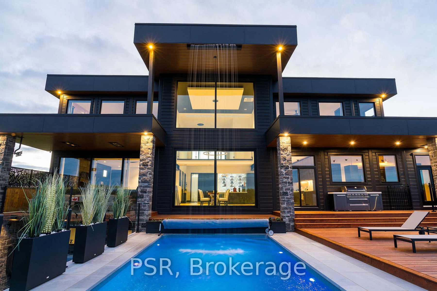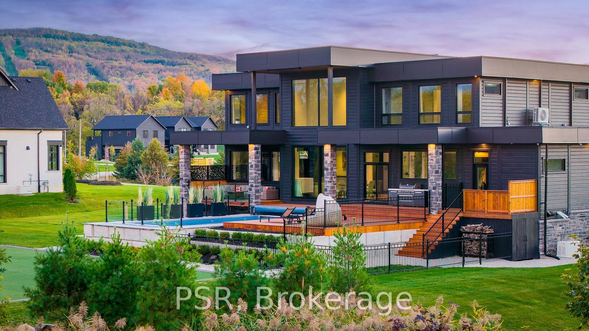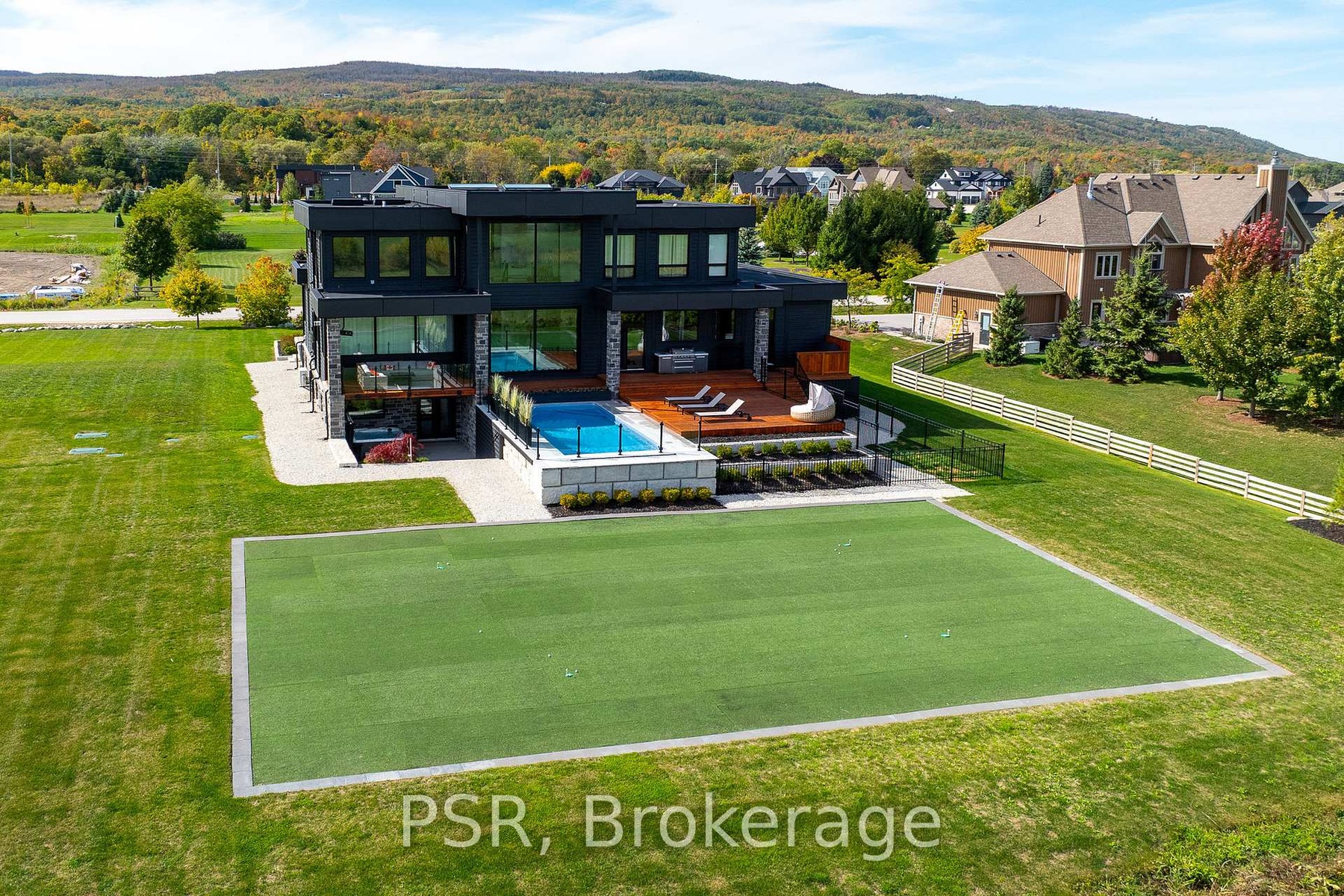 Welcome to the extraordinary turn key living experience offered by 4 Raintree Court, nestled in the heart of Ontario's ski country. This luxurious home in the exclusive Windrose Estates combines elegance and sophistication with functional amenities for today's modern families. This custom-built home offers five spacious bedrooms, seven bathrooms, a home theatre, fully equipped gym, sauna, hot tub and heated pool over 8,600 square feet of interior space on a one-acre lot. High ceilings, custom lighting design, multiple skylights and walls of windows work with the wood accent walls to create a contemporary space that is flooded with light. In-floor radiant heating keeps the space cozy and warm throughout ski season as you sit by the fireplace watching the snow fall. The grand kitchen and dining area serve as the heart of this home, with soaring 23ft ceilings and the 10ft high by 16 ft wide sliding doors overlooking the backyard and 10-acre parkland beyond. Equipped with top-of-the-line appliances and designer counters and finishes, the kitchen is a perfect space for those who love to cook and entertain. The outdoor entertainment area includes a new outdoor kitchen, conversation area featuring patio heaters, heated pool and a waterfall that cascades from the upper roof into the pool. The property offers stunning mountain views of Osler Bluffs and Blue Mountain which can be enjoyed from throughout the home. Both resorts are less than ten minutes from the estate, as is downtown Collingwood. Simcoe County is known for its vibrant community atmosphere and natural beauty. From hiking trails to farmers' markets and local festivals-there's always something to see or do here. Notably, Clearview Township allows you to snowmobile or side by side directly out of your own property to the trails located right in the neighbourhood. 4 Raintree Court is more than just a house-it's a lifestyle destination that combines stylish luxury living within your own personal sanctuary.