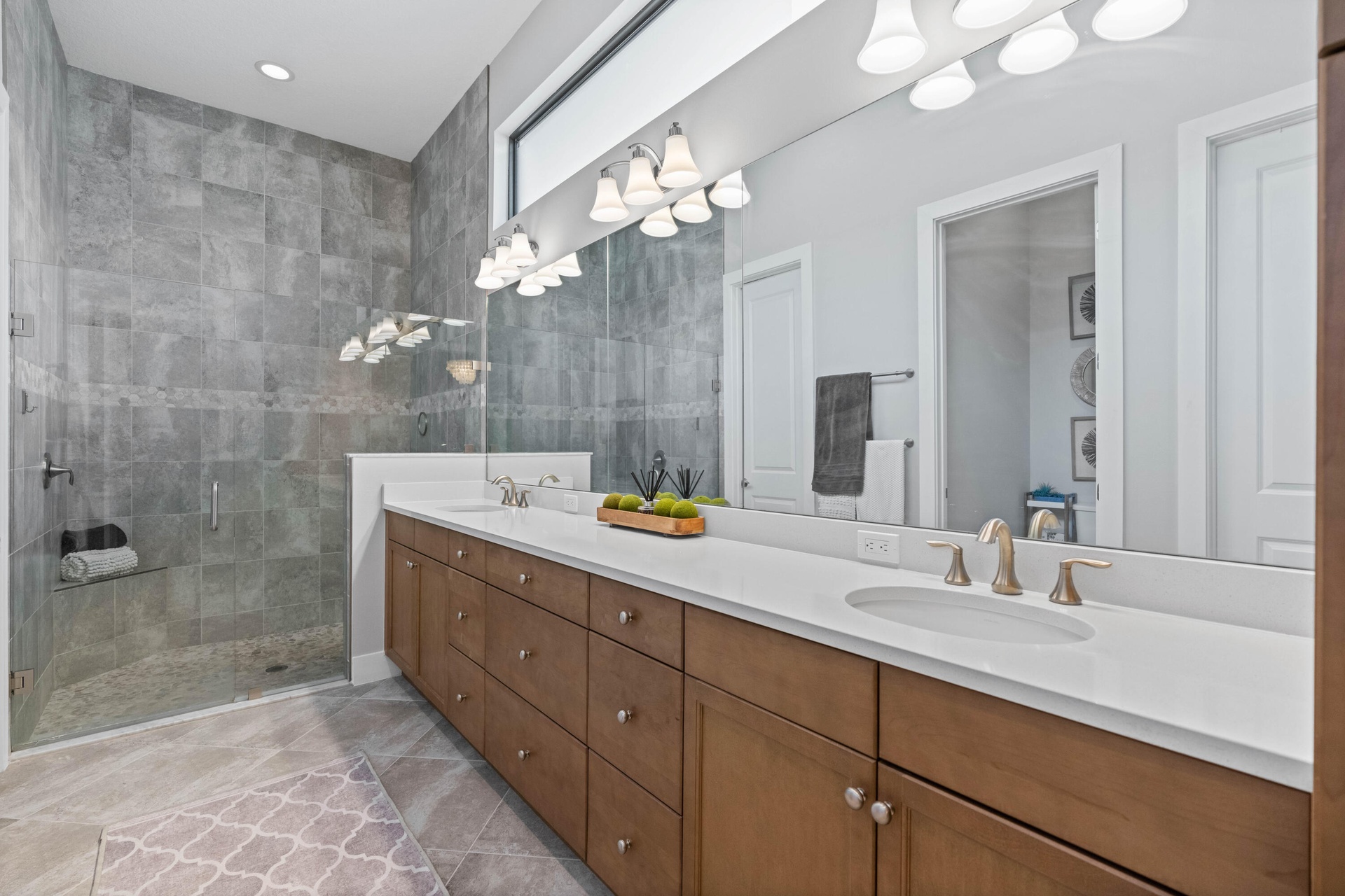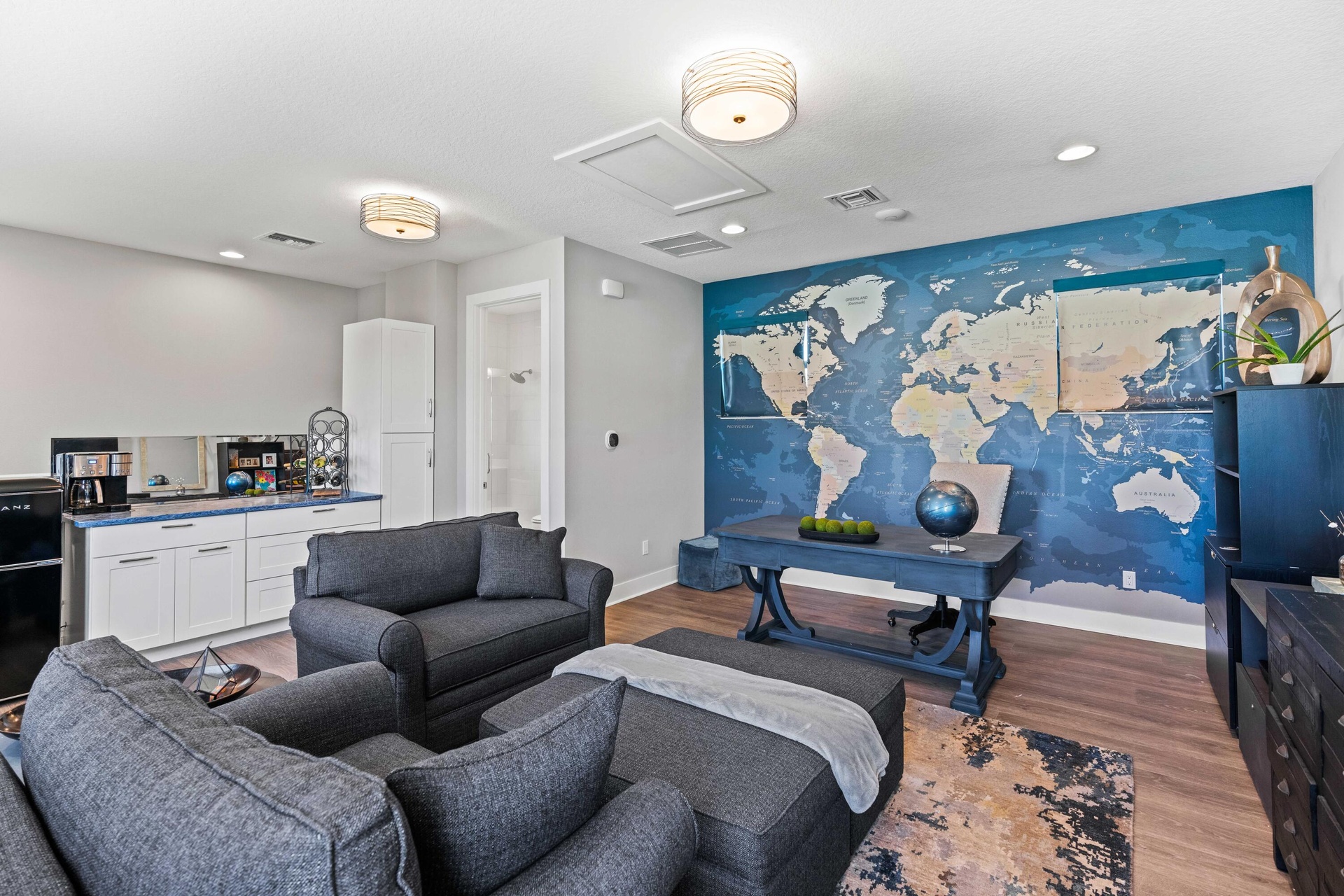 This rarely available open-floor-plan showstopper with three bedrooms and an office is situated on the green, on a wide corner lot close to the clubhouse! With expansive green space in front and private rear lanai finished with privacy hedges, travertine tile, astroturf, and cabana bath, this sunlight-filled home shows like a model with countless upgrades, including: Impact glass, porcelain wood plank tile floors, wainscoting, custom woodwork, contemporary light fixtures and custom window treatments. Chef's dream kitchen equipped with walk-in pantry, 3''Quartz island breakfast bar with farmhouse sink, GE Monogram appliances, gas range and pot filler. The master bedroom has a luxurious ensuite bath with a huge walk-in shower and 2 walk-in closets. Guest bedroom ...see more
