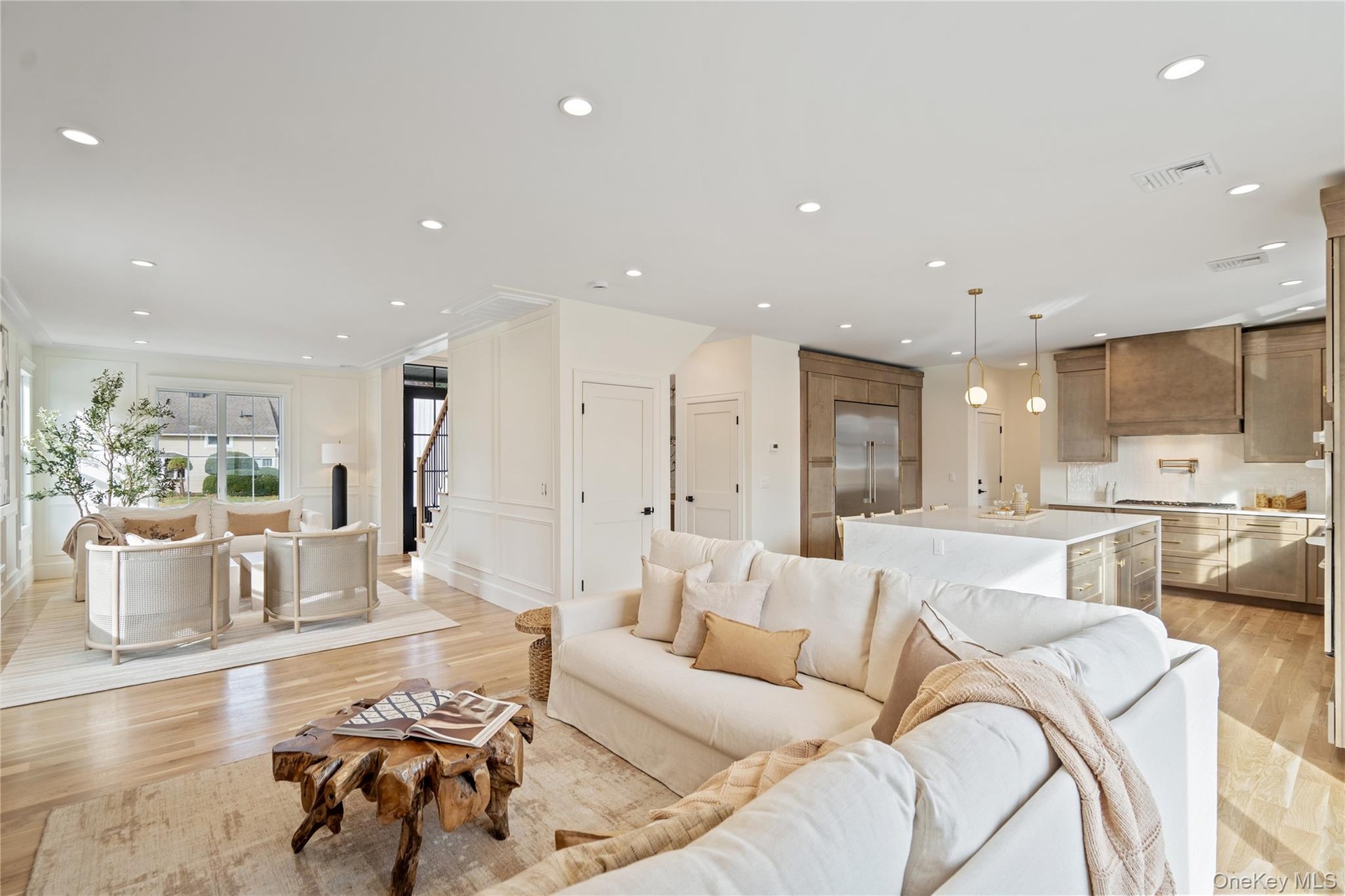 This brand-new construction blends modern farmhouse style with timeless elegance, offering 5 bedrooms, 5.5 baths, and a fully finished basement with outside entrance. The first floor features a dramatic double-height entry with custom raised panel detailing that flows into the formal dining room with built-in hutch, complete with a coffered ceiling and dry bar—perfect for entertaining. Wide-plank white oak hardwood floors, 9-foot ceilings, and custom crown molding create a seamless sense of luxury. A spacious first-floor bedroom or office, full bath, ideal for extended family. The chef’s kitchen boasts gas cooking, an oversized island, premium stainless-steel appliances, and LED accent lighting. The adjoining family room includes a gas fireplace with built-in cabinets on either side, and sliders leading to a professionally landscaped, fenced yard with paver patio. Second floor features four oversized bedrooms, including a primary suite with decorative ceiling, coffee bar, walk-in closets, and a spa-like bath with soaking tub, glass-enclosed shower, double vanities, plus make-up vanity, and radiant heated floors. A laundry room, and 3 additional bedrooms, two more full bathrooms complete the second level. The fully finished 1,600 sq. ft. basement with a full bath and outside entrance offers endless possibilities—home gym, media room, bar, or more. East Meadow School District