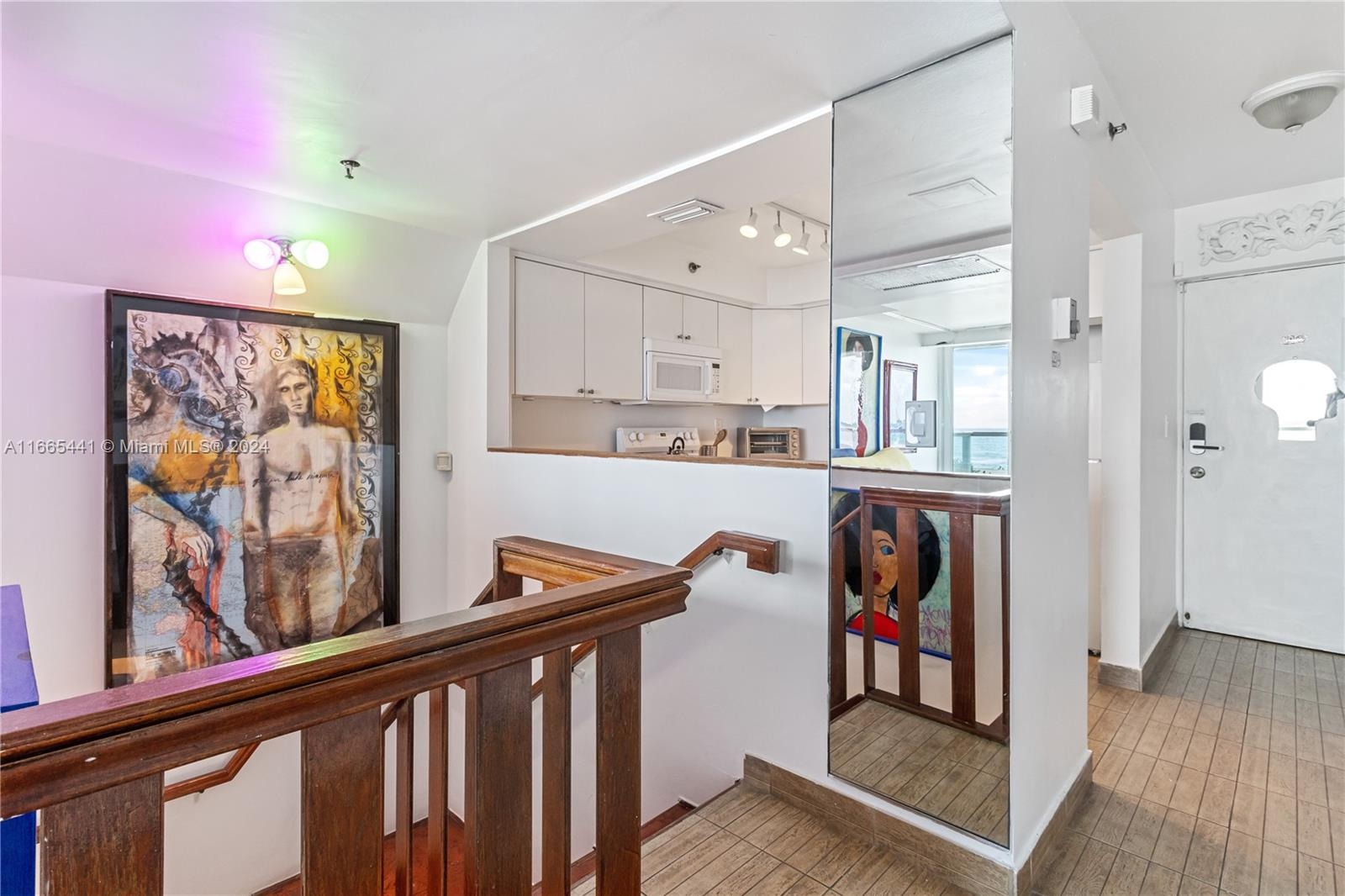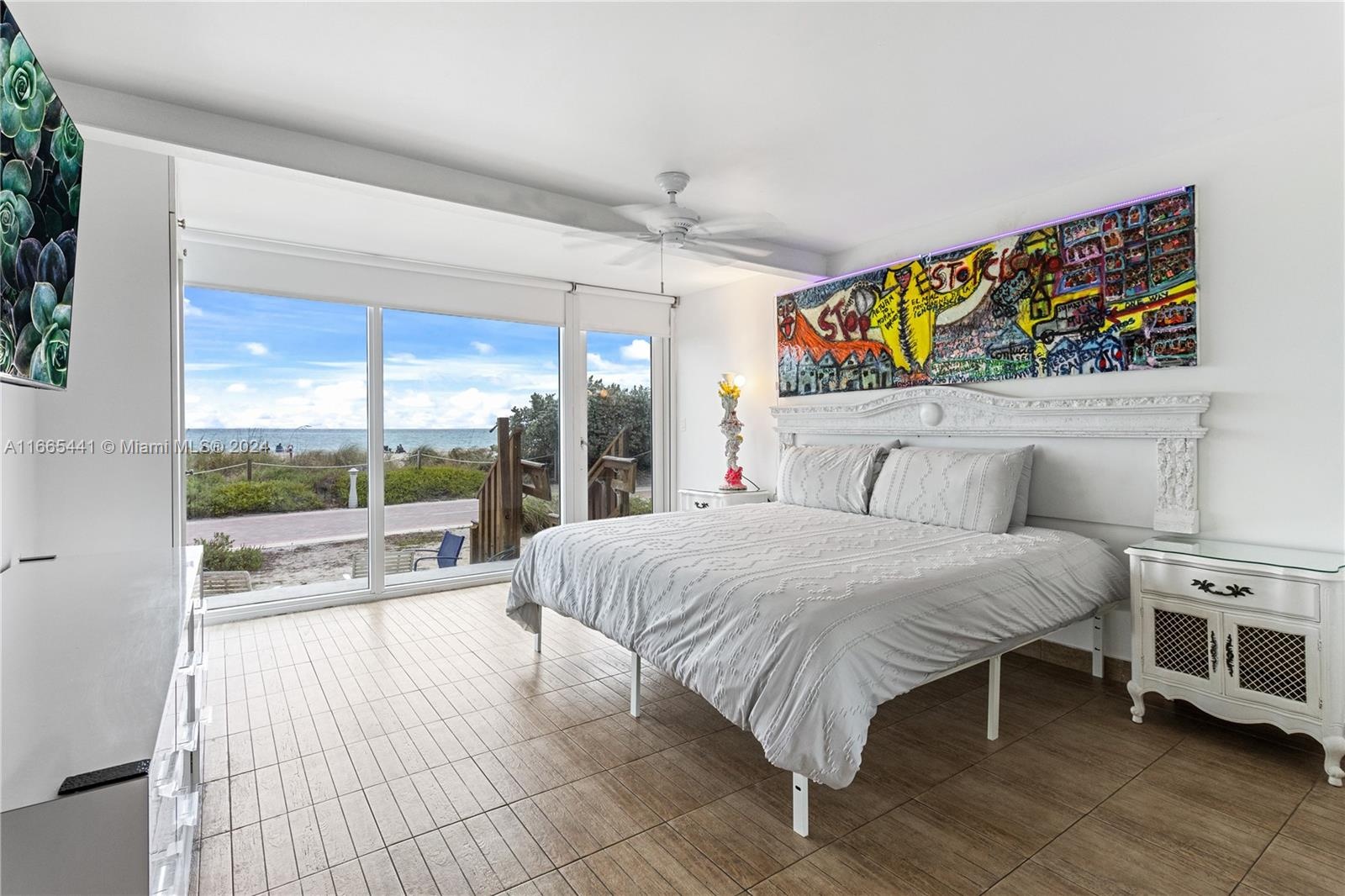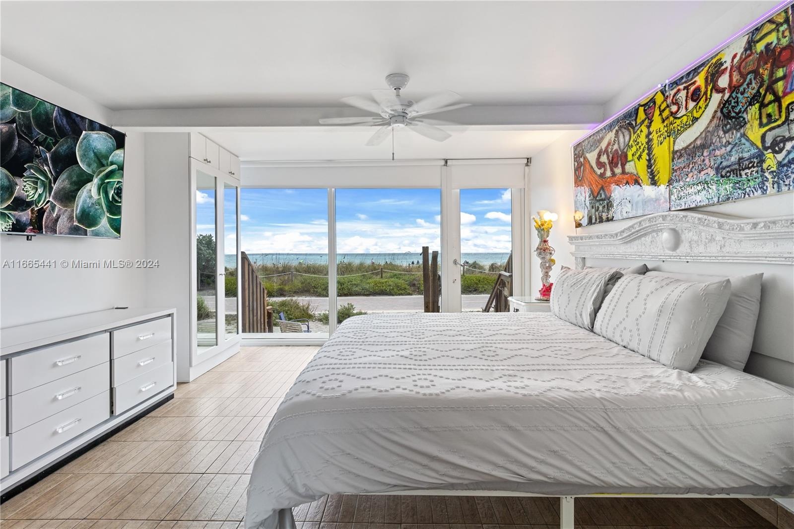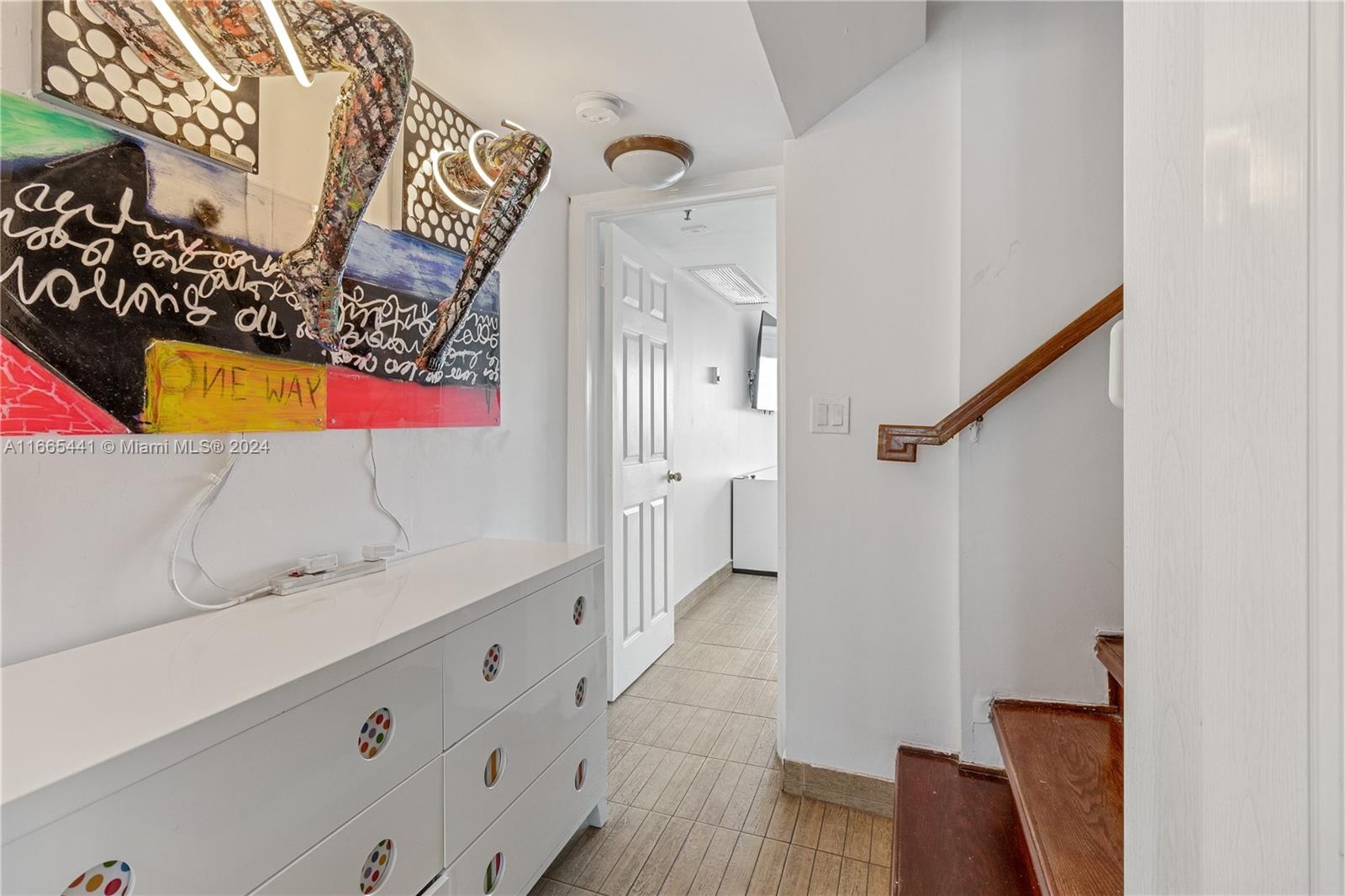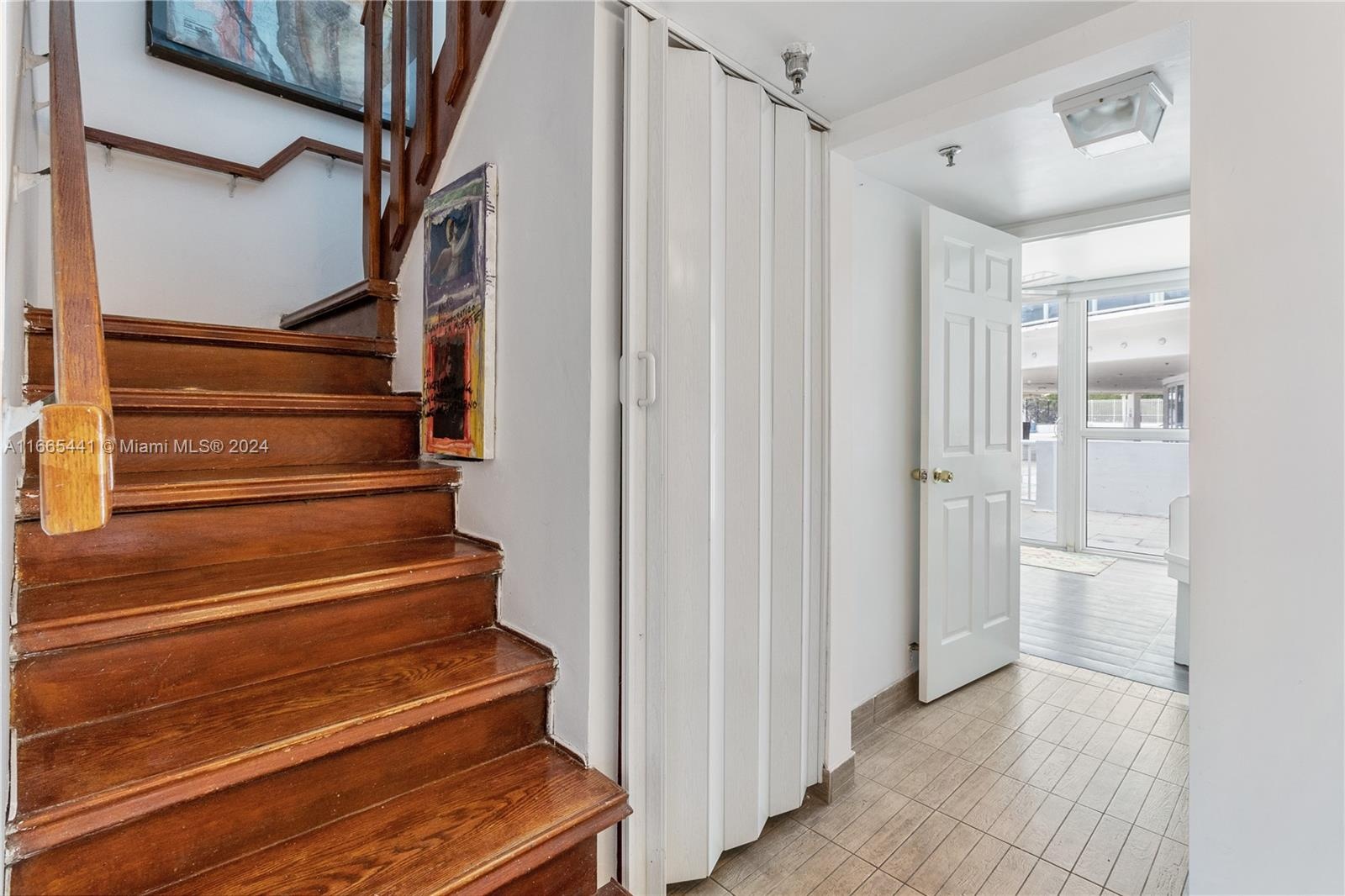 CASTLE BEACH This stunning two-story townhouse is located on the sought-after Miami Beach and boasts direct access to the boardwalk, making it the perfect oasis for those who love the sand, sun, and sea. The unit also features a private balcony with sliding glass high impact windows, where you can relax and soak up the sun while enjoying the ocean views. The living area is spacious and bright, with high ceilings and large windows that allow natural light to flood in. The sliding glass doors lead to a private balcony. The stairs leading from the first floor to the ground floor . The stairs lead directly to the bedrooms on the ground floor, providing privacy and convenience.