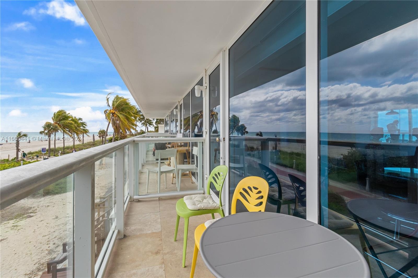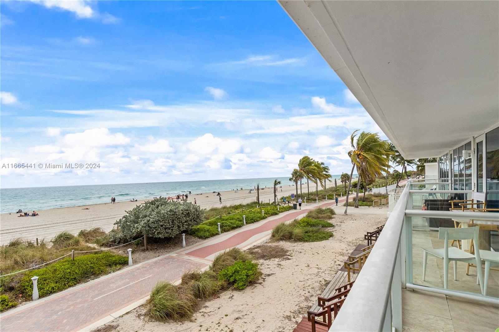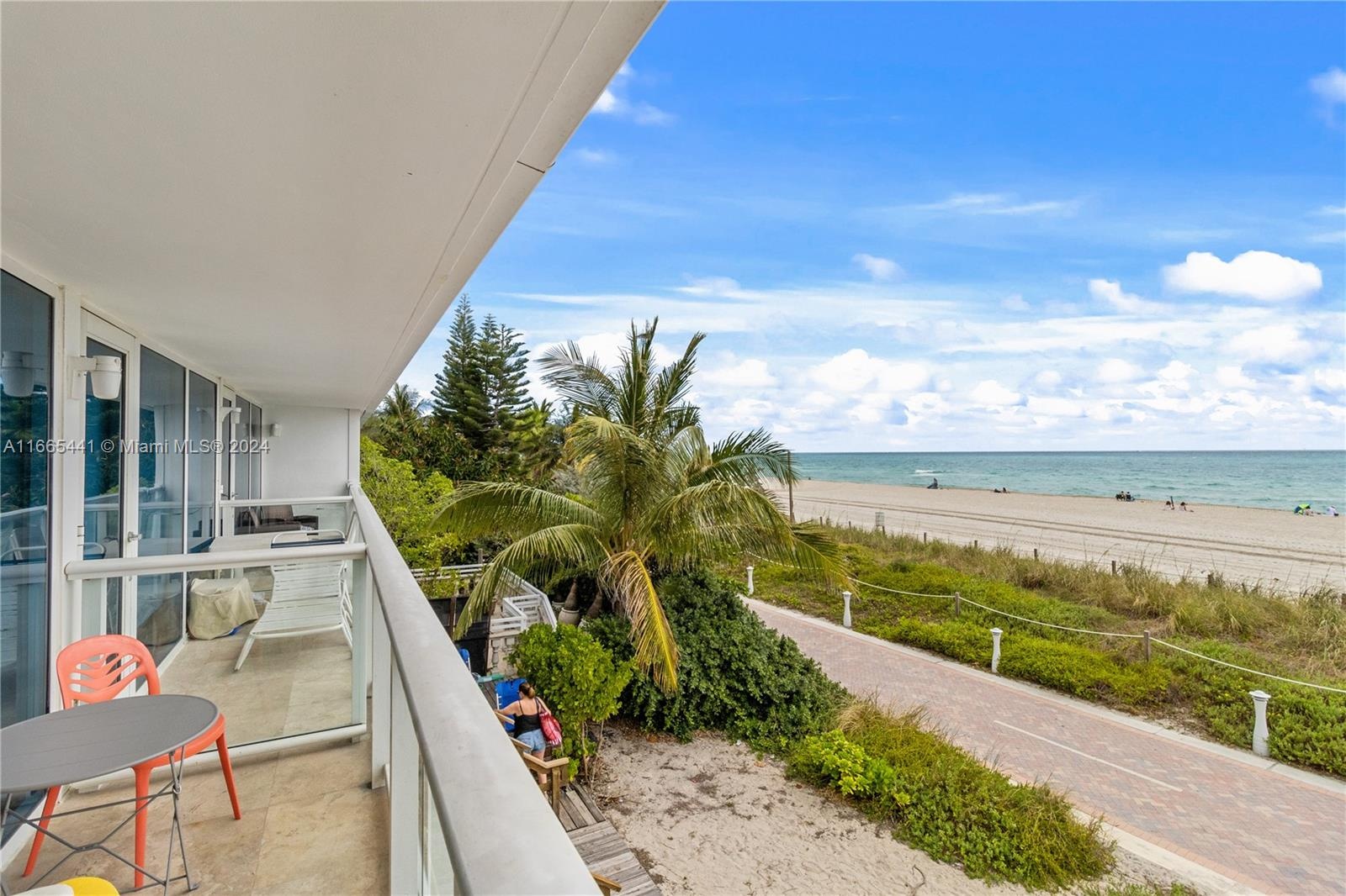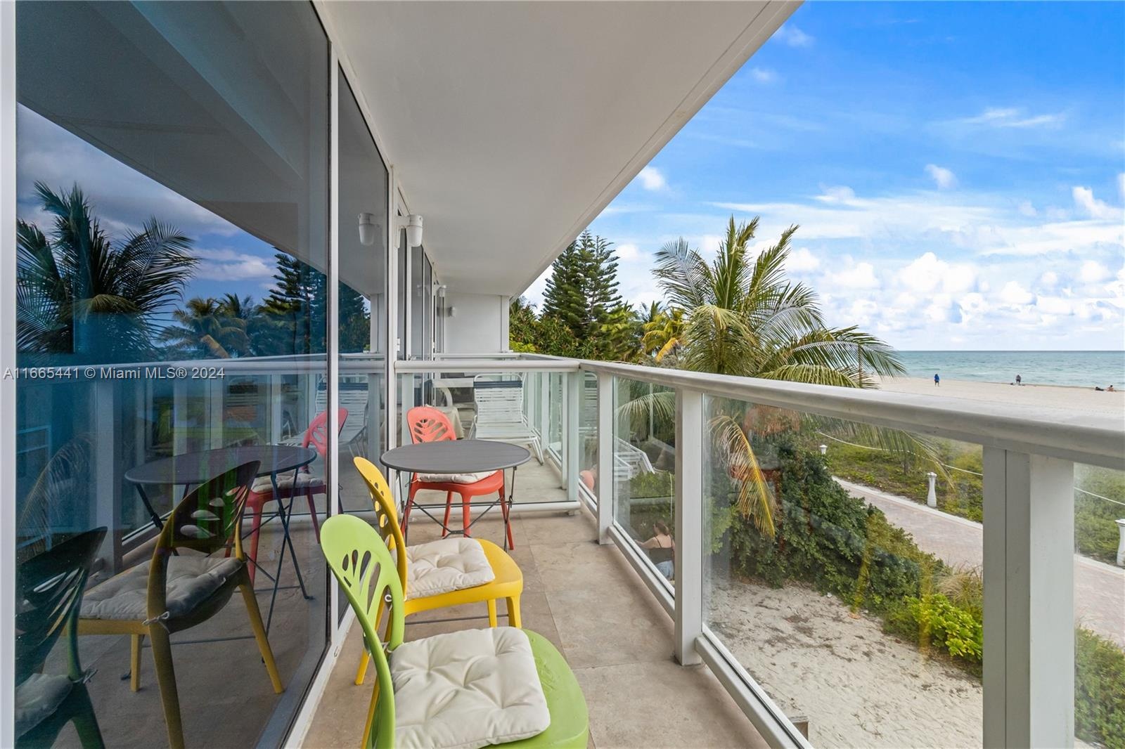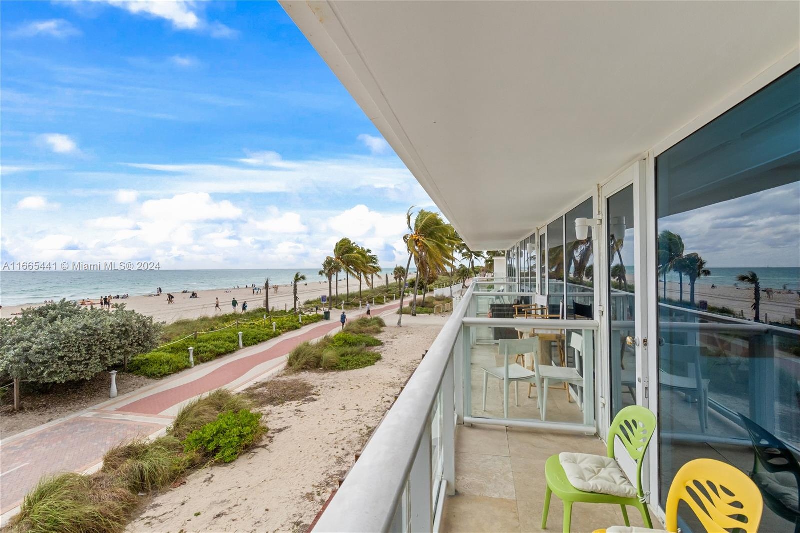 CASTLE BEACH This stunning two-story townhouse is located on the sought-after Miami Beach and boasts direct access to the boardwalk, making it the perfect oasis for those who love the sand, sun, and sea. The unit also features a private balcony with sliding glass high impact windows, where you can relax and soak up the sun while enjoying the ocean views. The living area is spacious and bright, with high ceilings and large windows that allow natural light to flood in. The sliding glass doors lead to a private balcony. The stairs leading from the first floor to the ground floor . The stairs lead directly to the bedrooms on the ground floor, providing privacy and convenience.