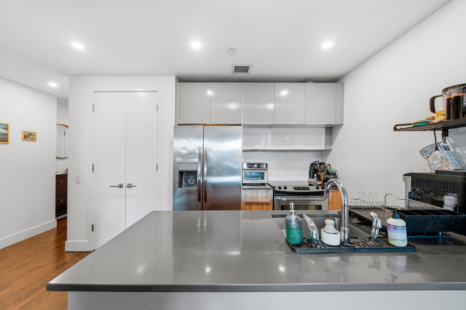Open-concept living space flooded with natural light, featuring high ceilings and sleek hardwood floors that create an inviting and airy atmosphere. The contemporary kitchen is a culinary enthusiast's dream, equipped with state-of-the-art stainless steel appliances, custom cabinetry, and a chic breakfast bar for casual dining.