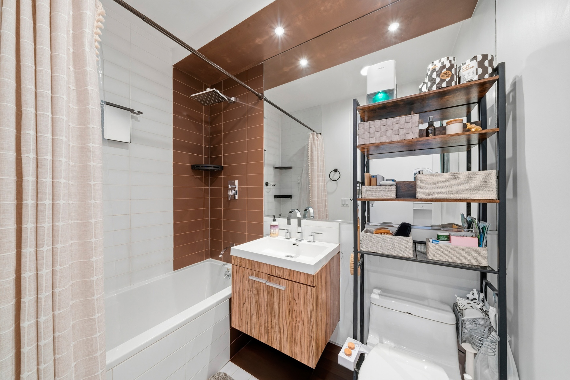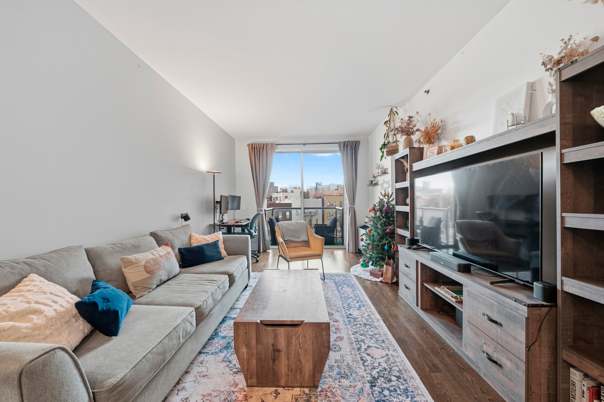Private balcony with great views of the Brooklyn Skyline. In unit washer/dryer, custom vanity, and state of the art Alexa sound system.