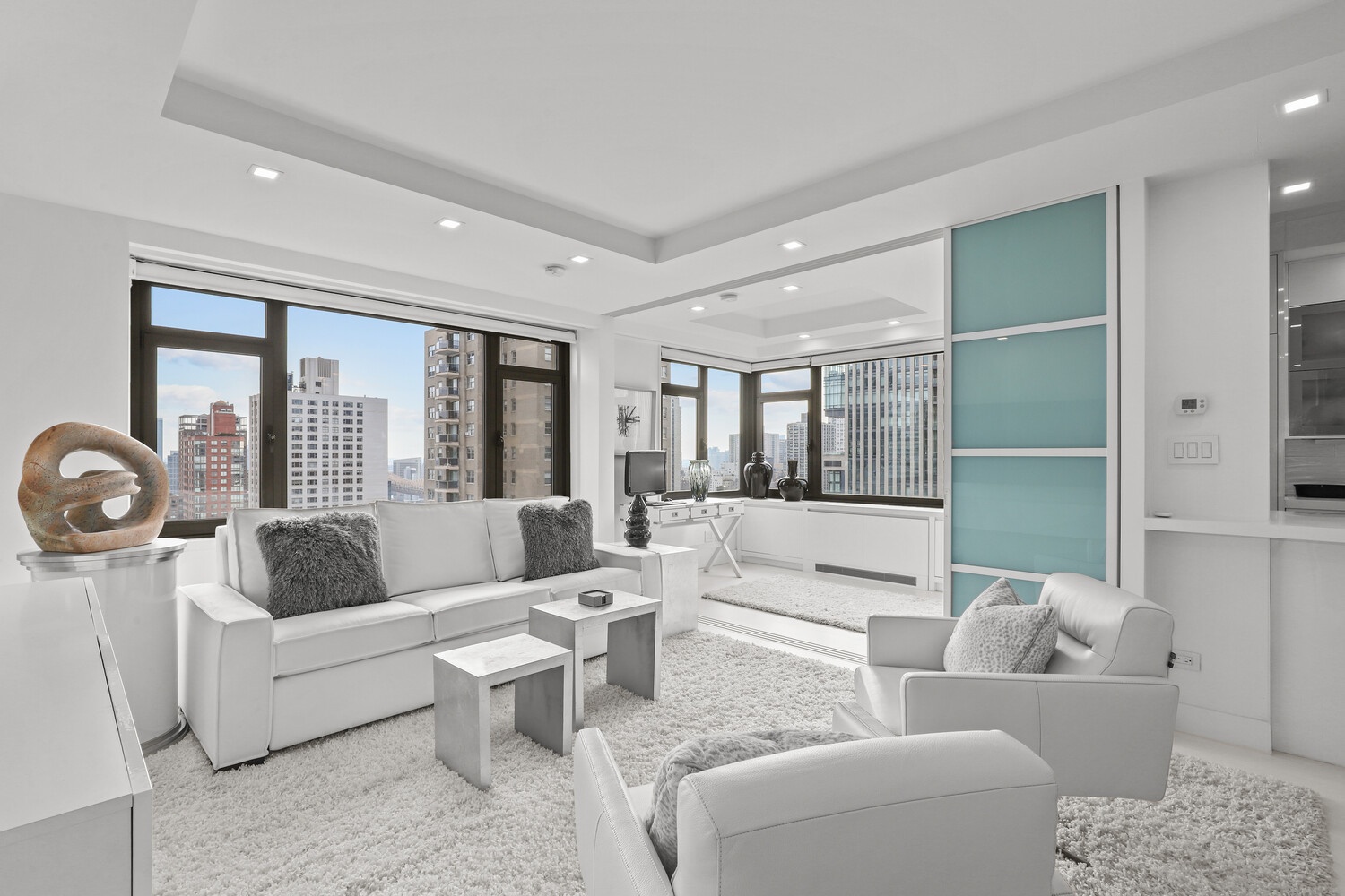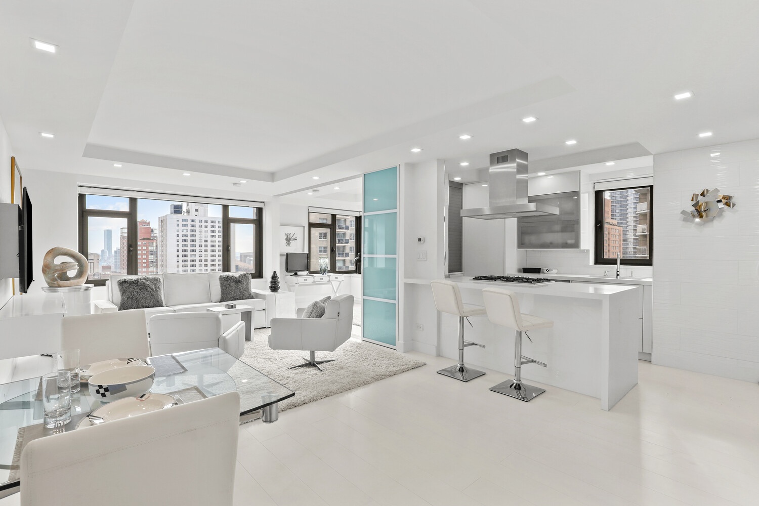 The entire apartment has been completely renovated to include ambient, recessed lighting, motorized shades, white hard wood floors, and many customized closets!