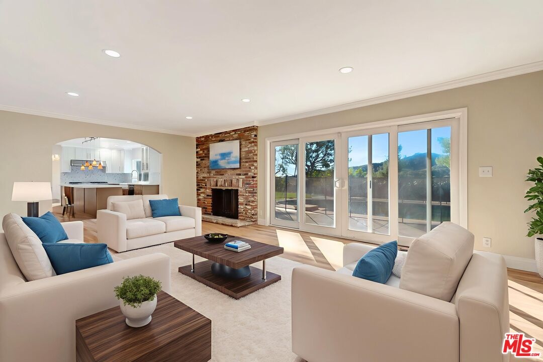 Welcome to the prestigious Bel Air Knolls subdivision, ideally located just off world-famous Mulholland Drive, Brentwood. This exceptional estate has been thoughtfully remodeled throughout, including the kitchen, flooring, and bathrooms, showcasing timeless design, refined finishes, and expert craftsmanship that together establish an exceptional standard of luxury living. Exterior & EntryThe home offers striking curb appeal with a grand double-door entry that opens to a dramatic, soaring-ceiling foyer accented by an elegant chandelier, creating an immediate and unforgettable sense of arrival. Living & Entertaining Spaces Upon entry, a spacious open-concept floor plan unfolds, thoughtfully designed to maximize natural light, interior volume, and seamless flow. The formal living and dining rooms, each featuring a fireplace and scenic views, provide an ideal setting for both intimate gatherings and large-scale entertaining, with direct access to the kitchen and backyard. At the heart of the home lies a state-of-the-art chef's kitchen, outfitted with custom cabinetry, a large center island, premium designer appliances, and refined fixtures crafted for both culinary excellence and visual impact. Adjacent to the kitchen, the expansive family room features a working fireplace and picturesque views, enhancing everyday comfort and functionality. Indoor-Outdoor Living home opens to a private, professionally landscaped backyard designed for effortless outdoor living. Enjoy a resort-style pool and spa, lush greenery, and breathtaking views of the Santa Monica Mountains, creating the perfect setting for alfresco dining, morning coffee, evening relaxation, and memorable celebrations. The backyard is easily accessible through elegant sliding doors from the kitchen, family room, and dining room. The residence features five bedrooms and six bathrooms, each finished with bespoke materials and tailored storage. The luxurious primary suite is a true sanctuary, offering a sitting area with a fireplace, a large usable balcony with stunning views, and a spa-inspired bathroom featuring dual vanities, a soaking tub, a separate oversized shower, and a generous walk-in closet. The three additional generously sized bedrooms provide ample closet space, one with an en-suite bathroom, while the remaining two share a well-appointed bathroom with double vanities and a shower. A fifth bedroom with its own full bathroom is conveniently located on the main level, ideal for guests, extended family, or a private home office. Bonus & Additional Spaces large bonus room upstairs, with its own private entrance off the family room and sweeping views, offers exceptional versatility and can serve as a recreation room, playroom, office, or private theater. Additional FeaturesThree-car garage, unrestricted street parking, ideal for large events and gatherings, a downstairs laundry area with washer and dryer hookups, Additional refrigerator for added convenience. Prime Location: Situated in a quiet, safe neighborhood adjacent to award-winning Roscomare Road Elementary School, and close to Steven S. Wise Temple, Mirman School, Buckley School, Curtis School, and Bel Air Presbyterian Church and Preschool. Just minutes from UCLA, Westwood Village, the Getty Center, Beverly Hills, Century City, and Ventura Boulevard. This is a rare opportunity to own a meticulously remodeled estate in one of Bel Air's, Brentwood's most desirable enclaves. A must-see property. Schedule your private tour today.