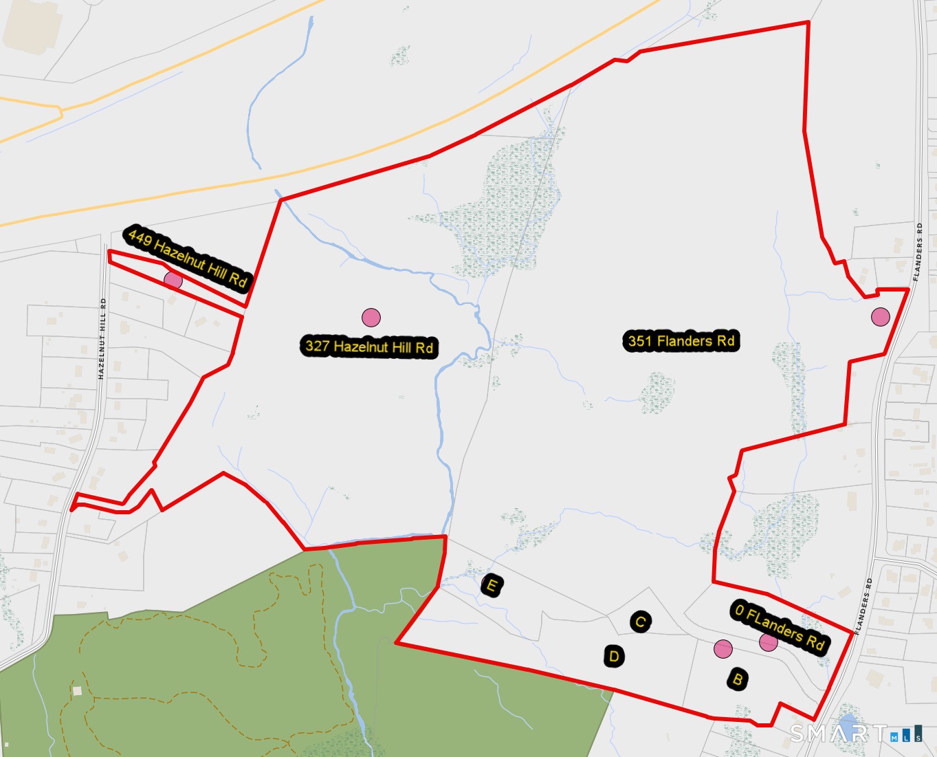 Incredible opportunity to acquire 168.3 acres of contiguous land in Groton's IM (Industrial Moderate) zone with significant frontage along both Hazelnut Hill and Flanders Roads. This expansive assemblage offers flexible development potential for industrial, flex, research, or recreational use. Located minutes from I-95, Route 1, Electric Boat, and Pfizer, the site is ideally positioned for regional employers, logistics, or large-scale development. Public water and sewer are available along Flanders Road (extensions required). The terrain includes rolling topography, wooded privacy, and areas of flat, developable land. Regulated wetlands are present but leave large contiguous zones for building. No A2 survey or engineering studies completed. Potential to pursue Tax Increment Financing (TIF) incentives through the Town of Groton. Parcels are held under one LLC, simplifying acquisition. A rare chance to control a strategic tract in a key growth corridor.