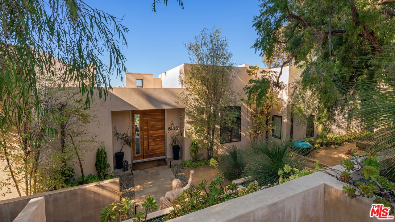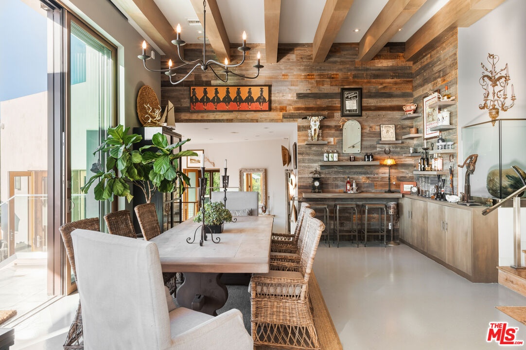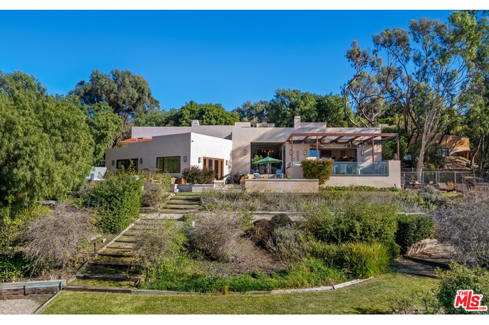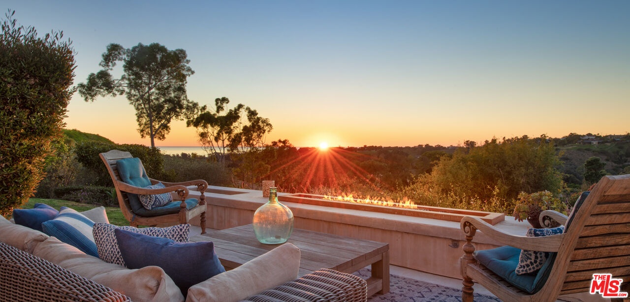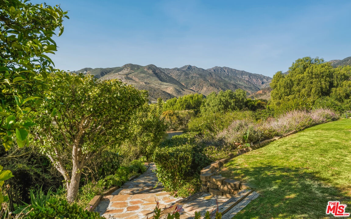 Nestled within a serene and private enclave, this exceptional estate blends refined luxury with breathtaking natural surroundings. A gated driveway leads to the residence, set amid manicured grounds with an automated irrigation system and framed by tranquil landscaping. A covered entry welcomes you into a thoughtfully designed interior that balances warmth, scale, and architectural detail. Wood floors anchor the main level, where a gracious living core connects seamlessly to multiple bedroom suites. A powder room sits just off the main living area, while two guest bedrooms feature high ceilings, generous closets, and French doors that invite natural light. A beautifully finished guest bath includes a sleek vanity and tiled shower. A well appointed laundry room offers stone tile floors, custom cabinetry, a sink, and modern appliances, while an adjacent linen storage area is discreetly tucked behind French doors.A flexible bonus room, currently arranged as an office and media space, features high ceilings, a sliding barn door, plush carpeting, and ample closet storage, allowing it to function effortlessly as an additional bedroom or recreation room. The primary suite serves as a private sanctuary, complete with wood floors, dual wardrobe rooms, and expansive ocean views. An electric fireplace, integrated sound system, and soaring ceilings elevate the space, while glass doors open to a private deck capturing sweeping ocean and mountain vistas. The spa inspired bath features stone tile floors, a freestanding soaking tub positioned to enjoy mountain views, a rainfall shower with multiple heads, a private water closet with built ins, and dual vanities with generous counter space. A skylit hallway leads down subtle interior steps to the open plan living, dining, and kitchen spaces. The dining area is highlighted by exposed wood beamed ceilings and sliding glass doors that open to the backyard. A reclaimed wood bar area adds warmth and character, while the living room offers a fireplace and intimate seating areas that flow naturally into the kitchen. The chef's kitchen is both striking and functional, featuring sleek modern flooring, an oversized island with stone counters, a Sub Zero refrigerator with freezer drawers, marble countertops, and a full suite of Wolf appliances including a double oven, six burner range, griddle, and microwave. Additional features include a built in Miele coffee system, Bosch dishwasher, large sink with filtered water, and expansive ocean views. Sliding glass doors open to a full width deck with a covered pergola, retractable roof, integrated heaters, outdoor kitchen with Wolf barbecue, and a seating area centered around a glass fire feature. The terraced backyard unfolds across multiple levels, with stone pathways connecting seating areas, garden spaces, a small vineyard, and a private deck with a built in Jacuzzi. Below, an expansive lawn and additional firepit seating complete this outdoor retreat, all set against panoramic ocean and mountain views.Inside, a secondary living room offers custom shelving, soft carpeting, and French doors framing more coastal scenery. A temperature controlled wine cellar is concealed behind a sliding barn door, while a dedicated home theater features plush flooring, a large projection screen, and direct access to the backyard. Additional amenities include a four car driveway, two car garage with a bonus room suitable for a gym or art studio, sauna, dedicated wine storage, and mini Sub Zero refrigerator. An integrated smart home system with iPad control and security cameras provides modern convenience throughout. This estate offers a rare combination of architectural sophistication, resort style amenities, and a setting defined by privacy and natural beauty, ideal for both elevated entertaining and everyday serenity.