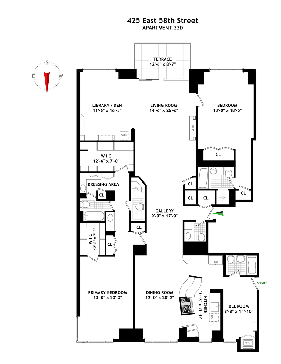 Enter from a semi-private landing to a gracious foyer which opens to a 65 ft. span from the south living room to the north dining room. This dramatic expanse is further enhanced by a 10' x 15' south balcony, marble floors and high ceilings. Spectacular views of the East River, Empire State and Chrysler buildings are dazzling. One bedroom has been opened to the living room as a den with a bar, wine refrigerator and built in entertainment center. The windowed kitchen is partially open to the dining room and has a 6 burner restaurant quality stove with grill and a Thermador vent, and a 48" Subzero refrigerator.