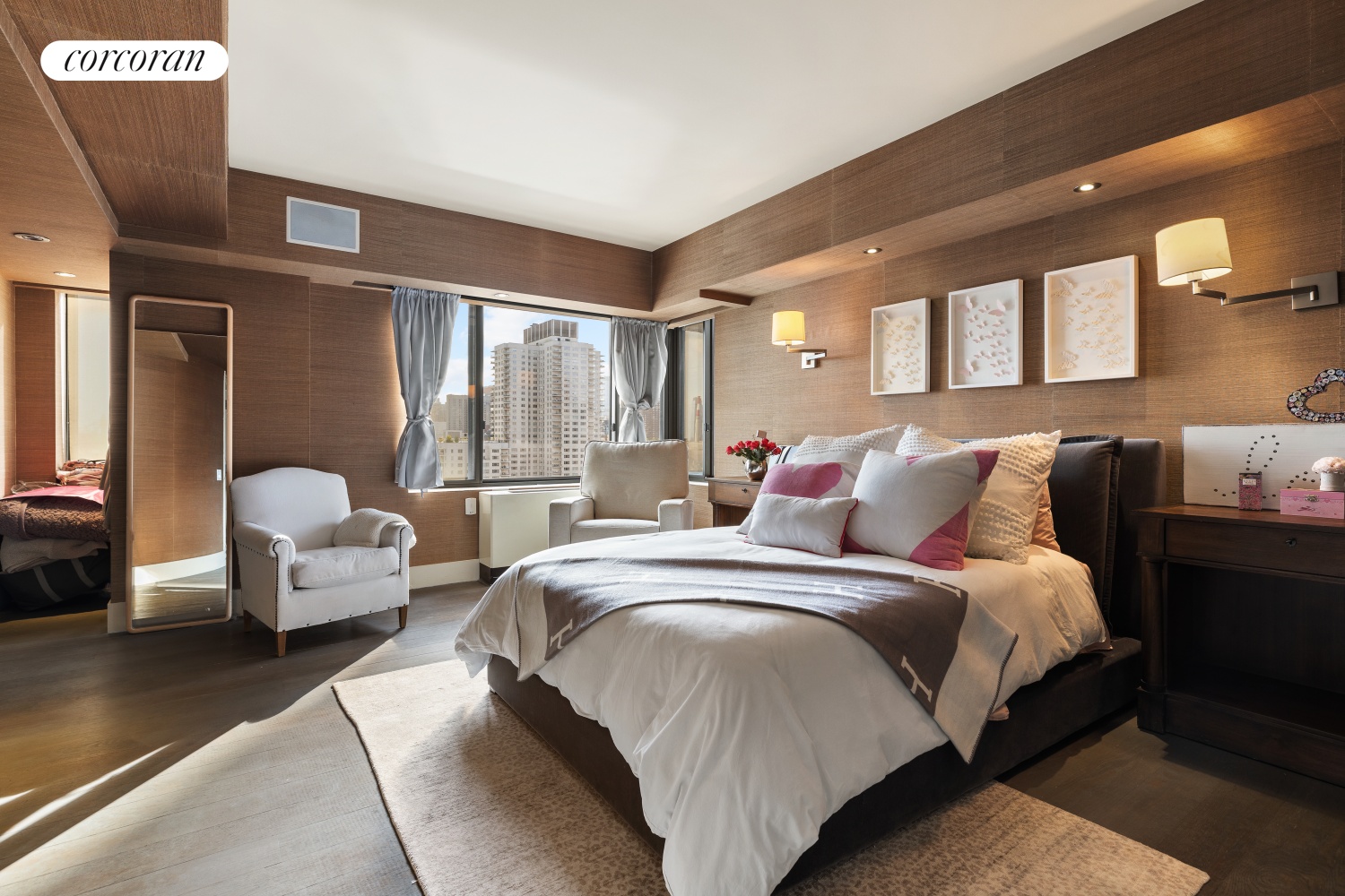 Upon entering the 21st floor, a gracious foyer opens into an expansive great room wrapped in windows with south and east exposures that flood the space with natural light. This elegant room features gray-stained maple floors and custom built-ins and flows seamlessly into the beautifully planted terrace. The open chef's kitchen is impeccably renovated with custom designer cabinetry, Silestone countertops, and top-of-the-line stainless steel appliances, including a Wolf vented five-burner cooktop, convection and gas ovens, built-in microwave, and Miele refrigerator and dishwasher. A center island with seating and a large walk-in pantry complete this thoughtfully designed culinary space.