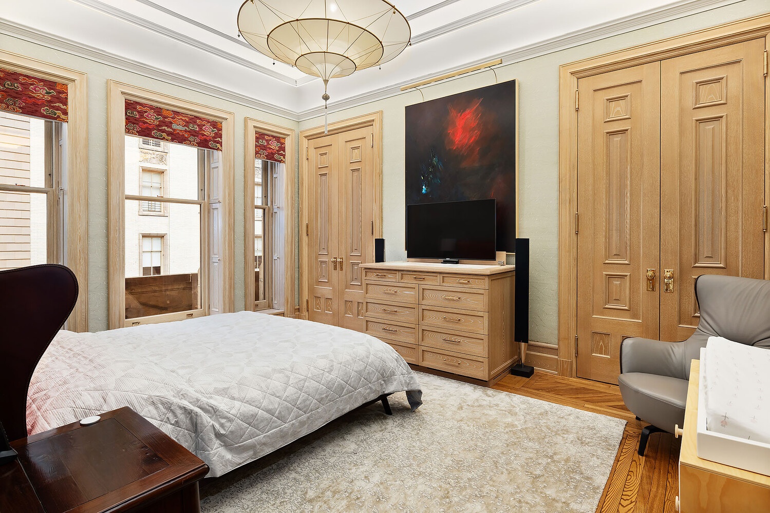 The enormous living room offers double exposures directly overlooking Central Park with spectacular views. Flowing from the gallery, the richly appointed library provides an intimate retreat, surrounded by built-in cabinetry with museum-quality picture lighting, ideal for a study, reading lounge, or private salon. The living room and the library each have fireplaces, and a Juliet balcony is wrapped around both rooms.