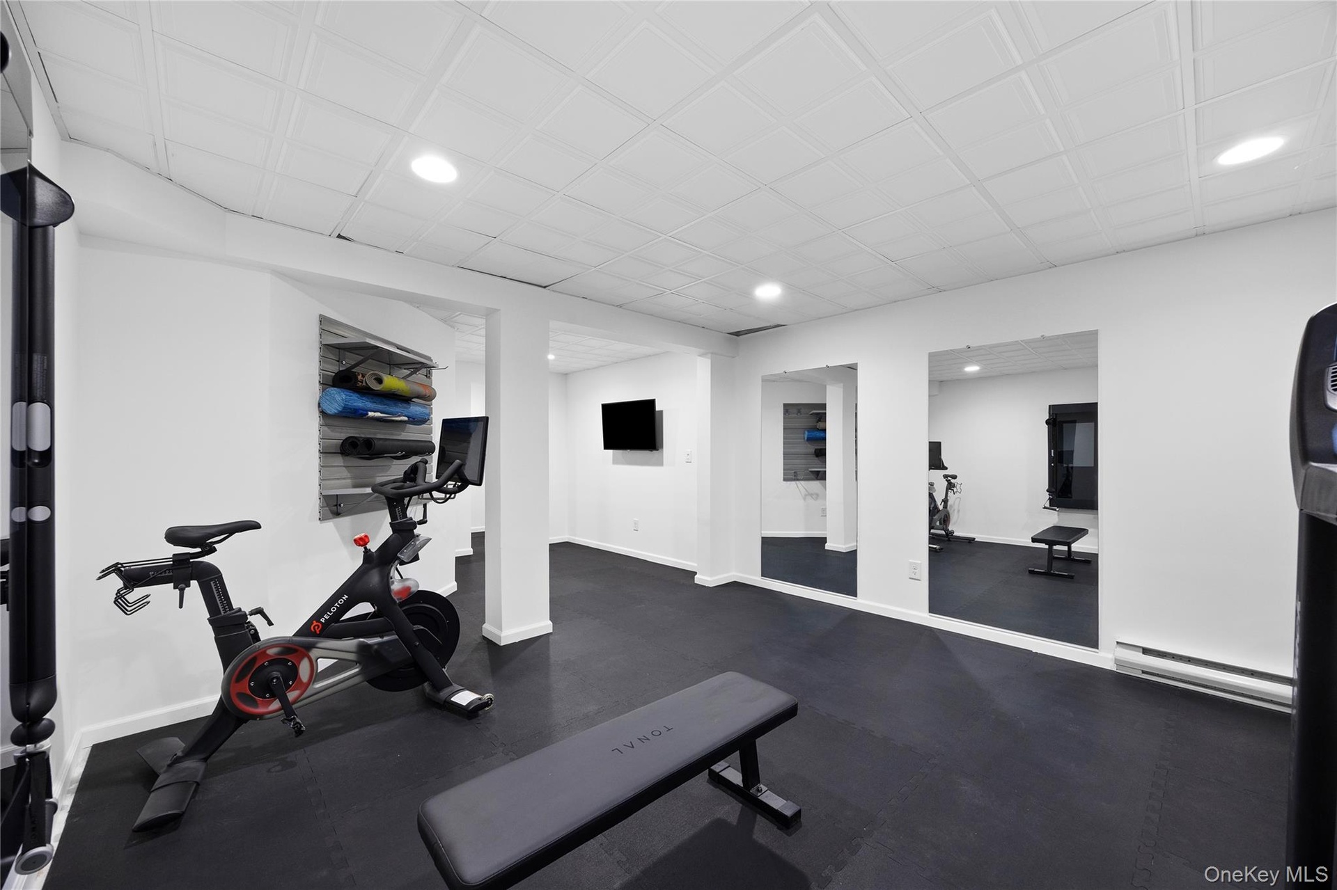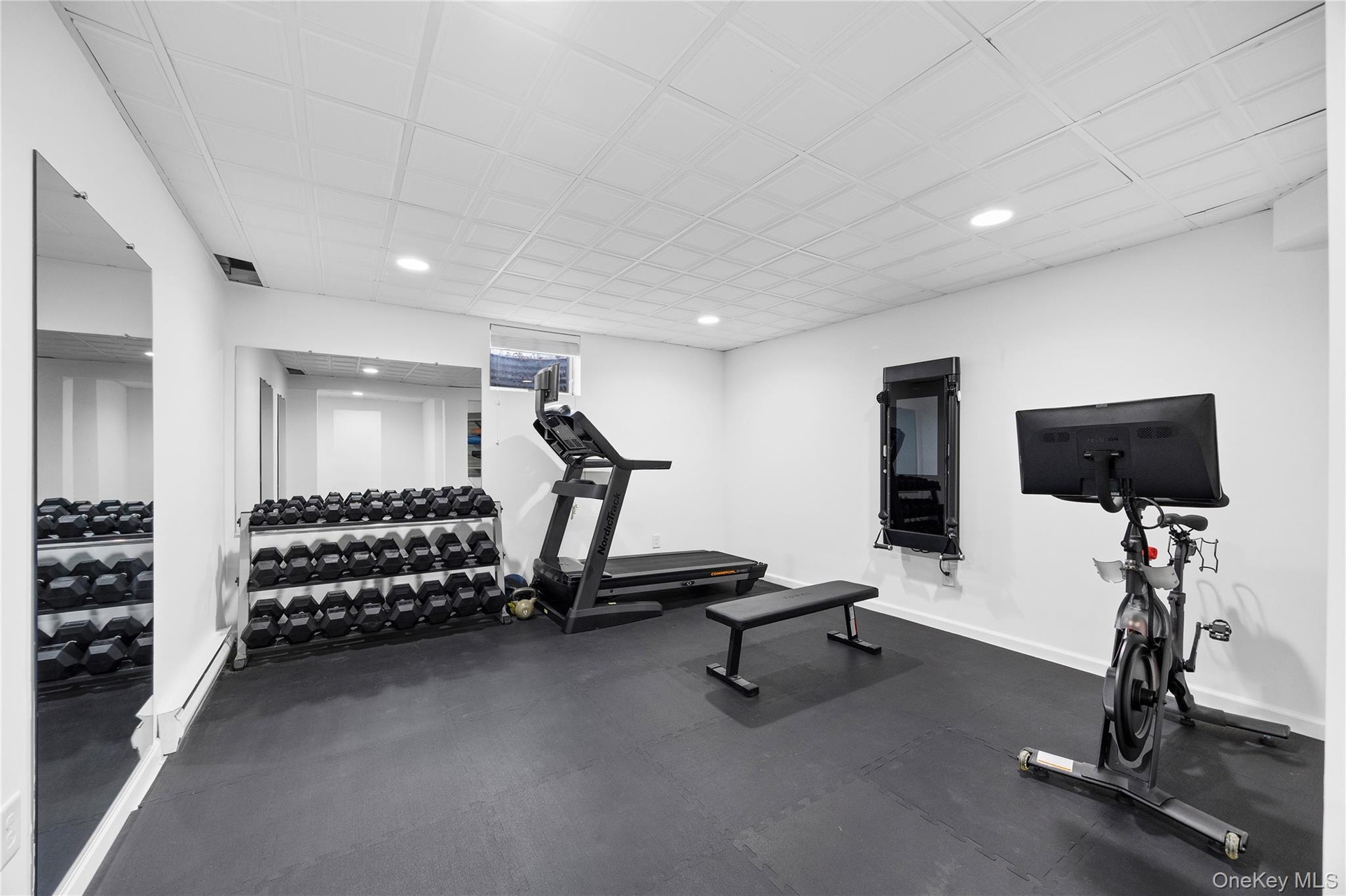 Daily convenience shines with a dedicated laundry room and a large two-car garage, offering generous storage and practicality. A fully equipped home gym ensures your wellness routine is just steps away.