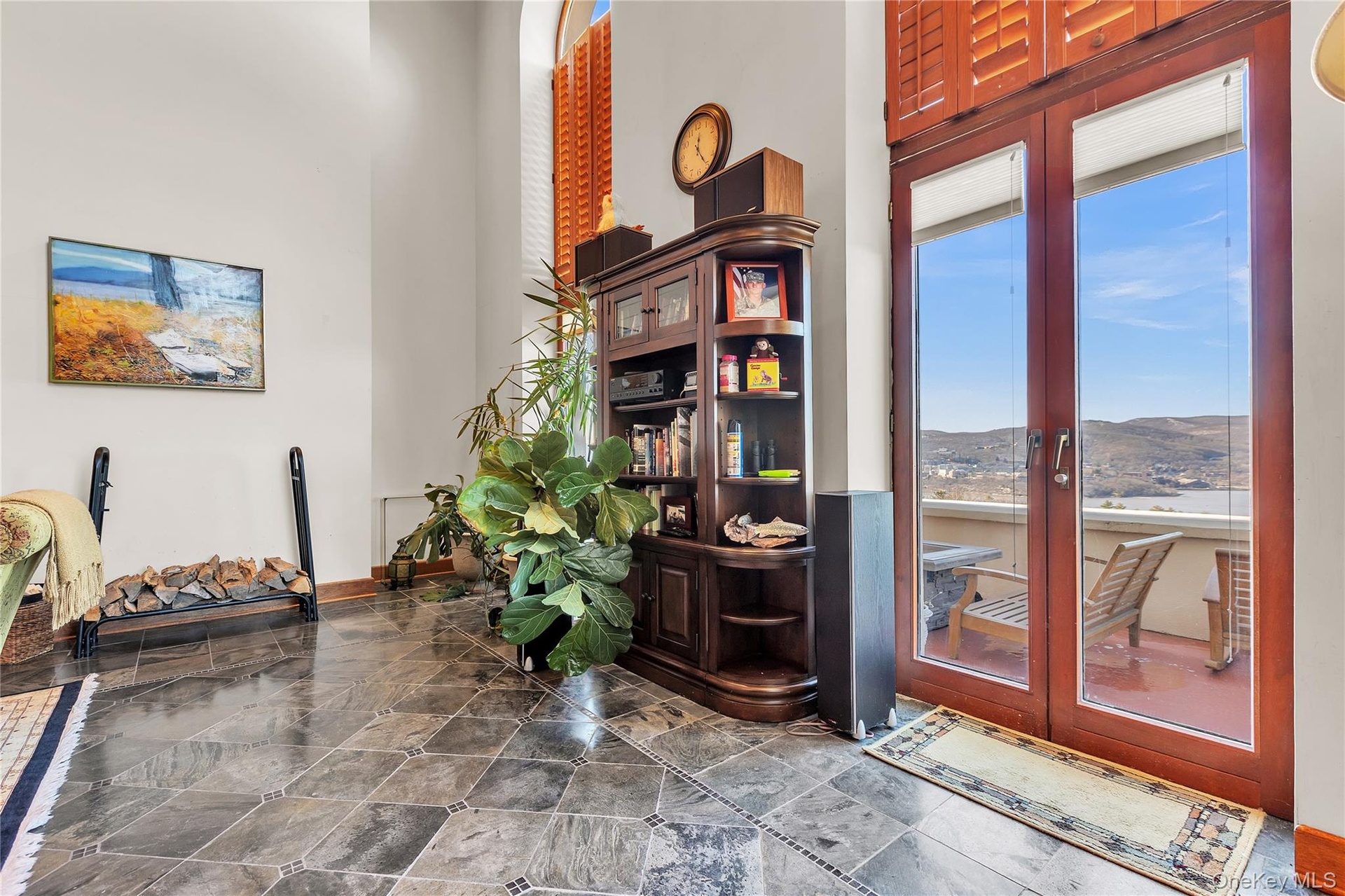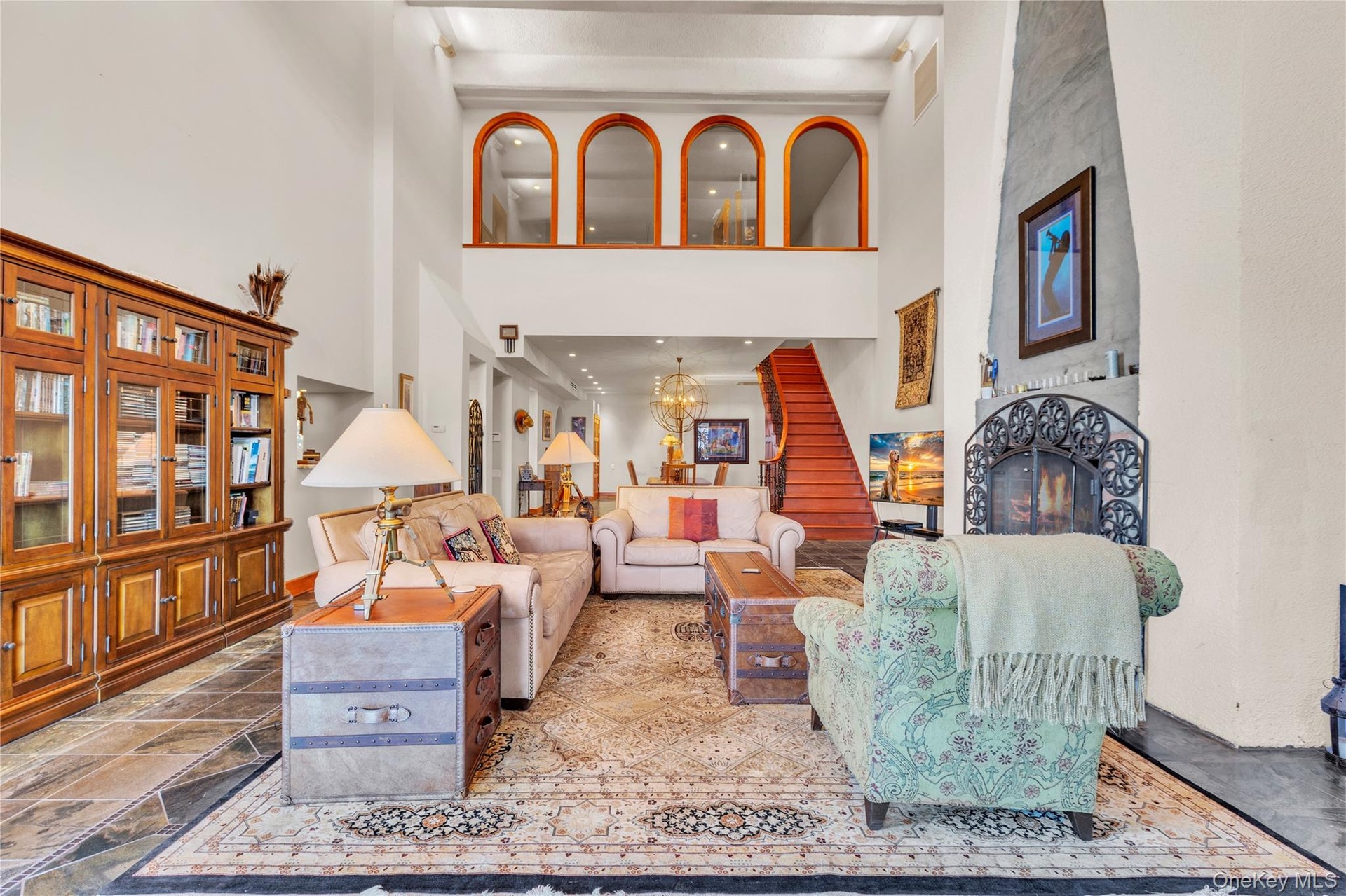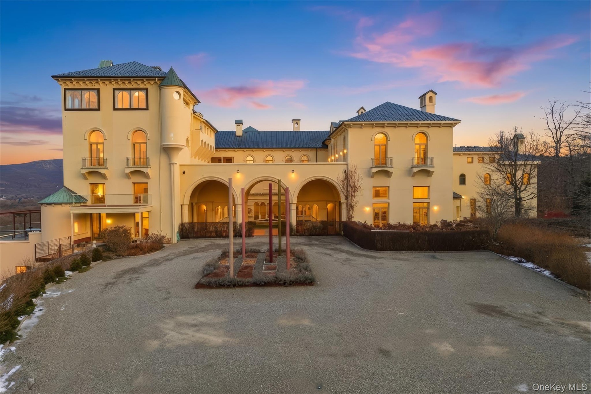 Rising above the Hudson Highlands with commanding views and unmistakable stone architecture, Dicks Castle remains one of the region’s most recognizable and storied landmarks. A Moorish style castle fashioned after Alhambra in Granada, Spain and situated on 26 wooded acres, the exterior features turrets, arches and courtyards surrounded by sculptures and stone walls well over 100 years old. This residence offers an exceptionally rare opportunity: the ability to live inside a piece of Garrison history while enjoying space, privacy, and the contemporary comforts expected of a modern luxury home. This particular home is unlike any other in the castle. At approximately 2,700 square feet, it is the only unit with three full bedrooms and three full baths, a distinction that sets it apart immediately. The interior design elevates the castle’s character with thoughtful updates-tile floors from India with radiant heat, soaring volumes of space, and a layout that blends openness with intimate architectural moments. The heart of the home is a dramatic great room anchored by a fully functional Reynard fireplace and framed by 23-foot ceilings. From this vantage point, two floor-to-ceiling doors and windows open to sweeping panoramas of the Hudson River Valley and the lights of the United States Military Academy at West Point. Few homes in the Hudson Valley offer a view with this level of scale, continuity, and emotional impact. The primary bedroom suite looks out over the great room, giving it a lofted sense of retreat while maintaining connection to the architecture and the views beyond. Two additional bedrooms are generously sized, each appointed with Jacuzzi bathtubs, making them ideal for guests or extended-stay.