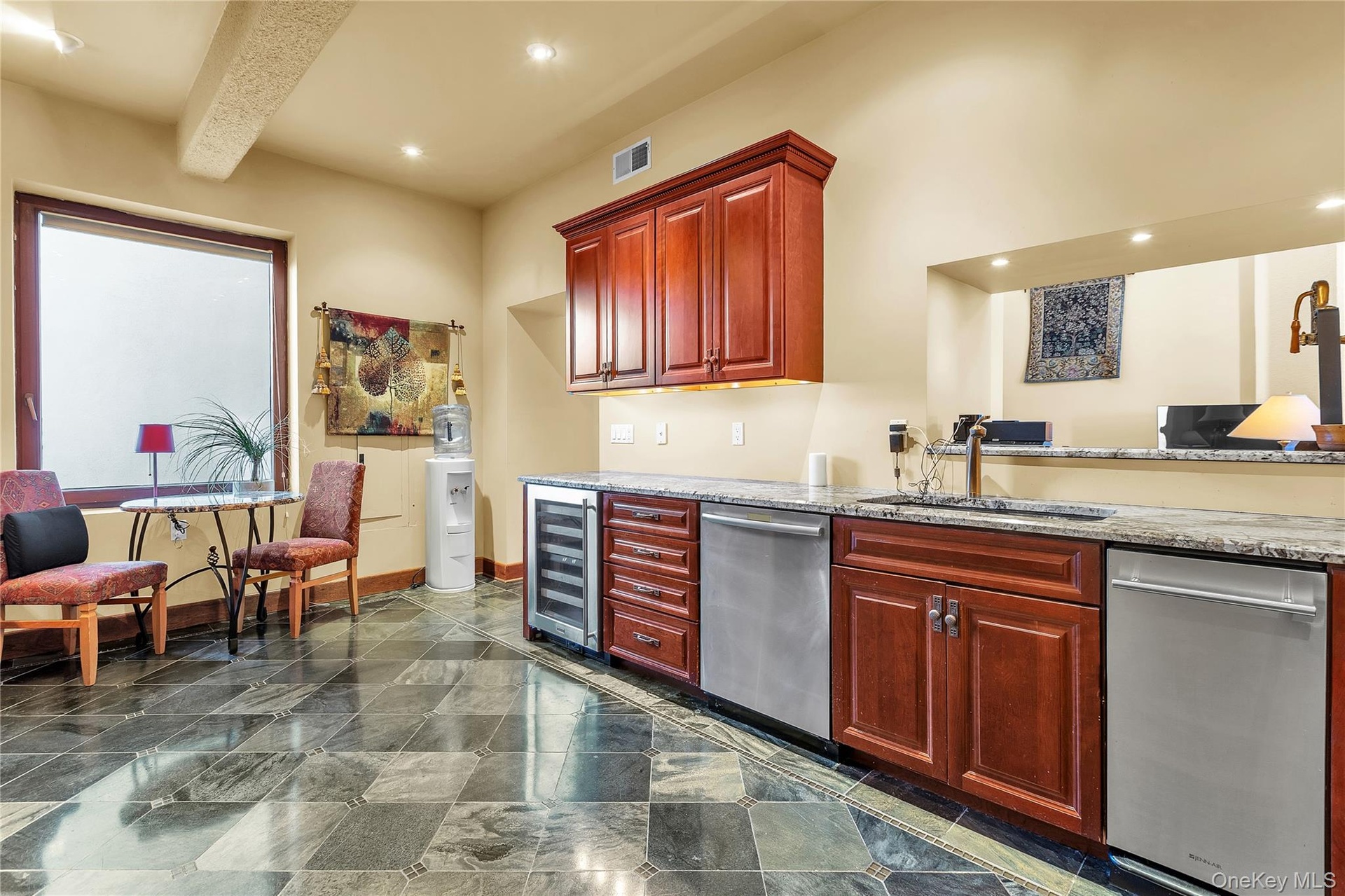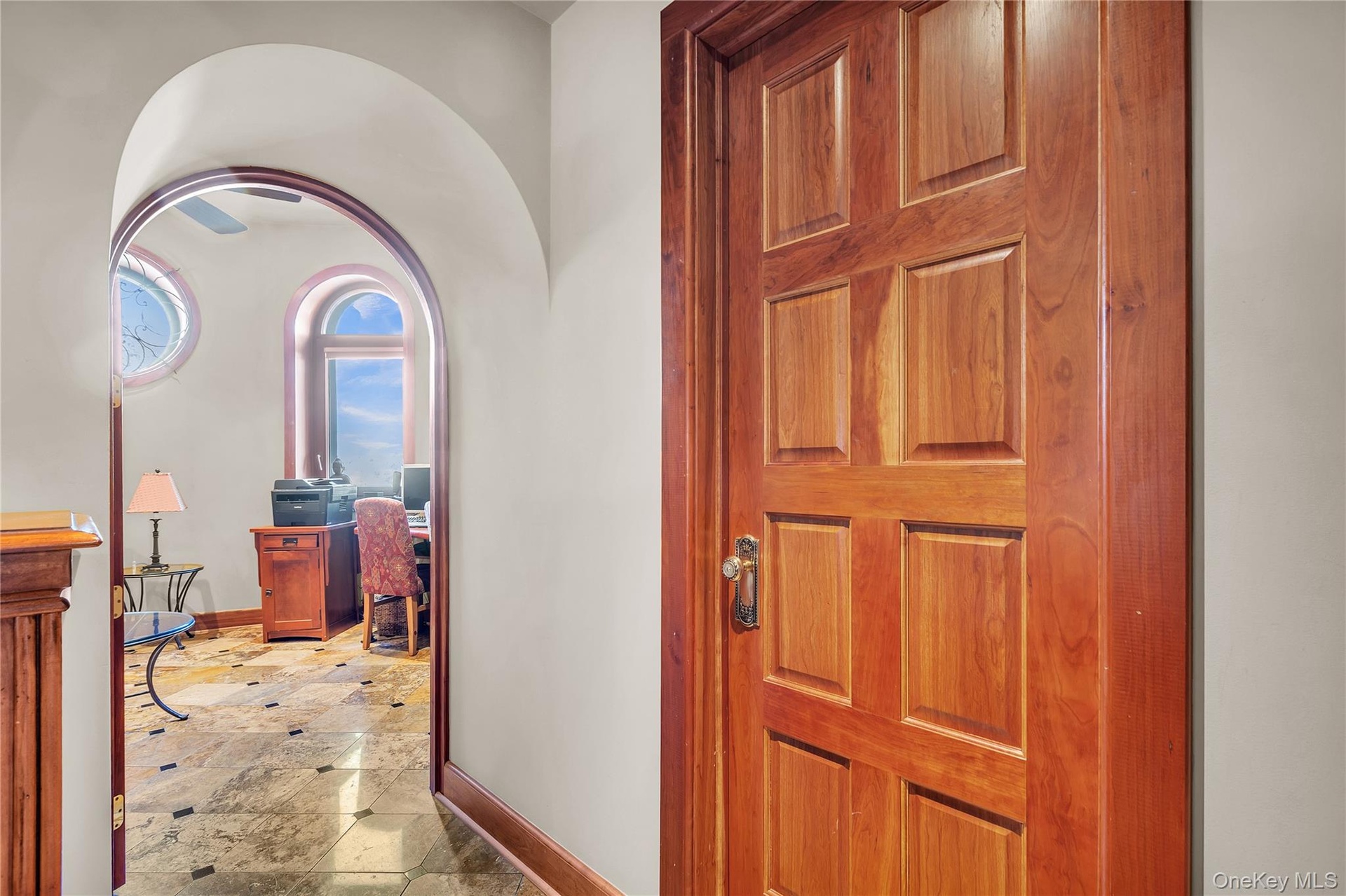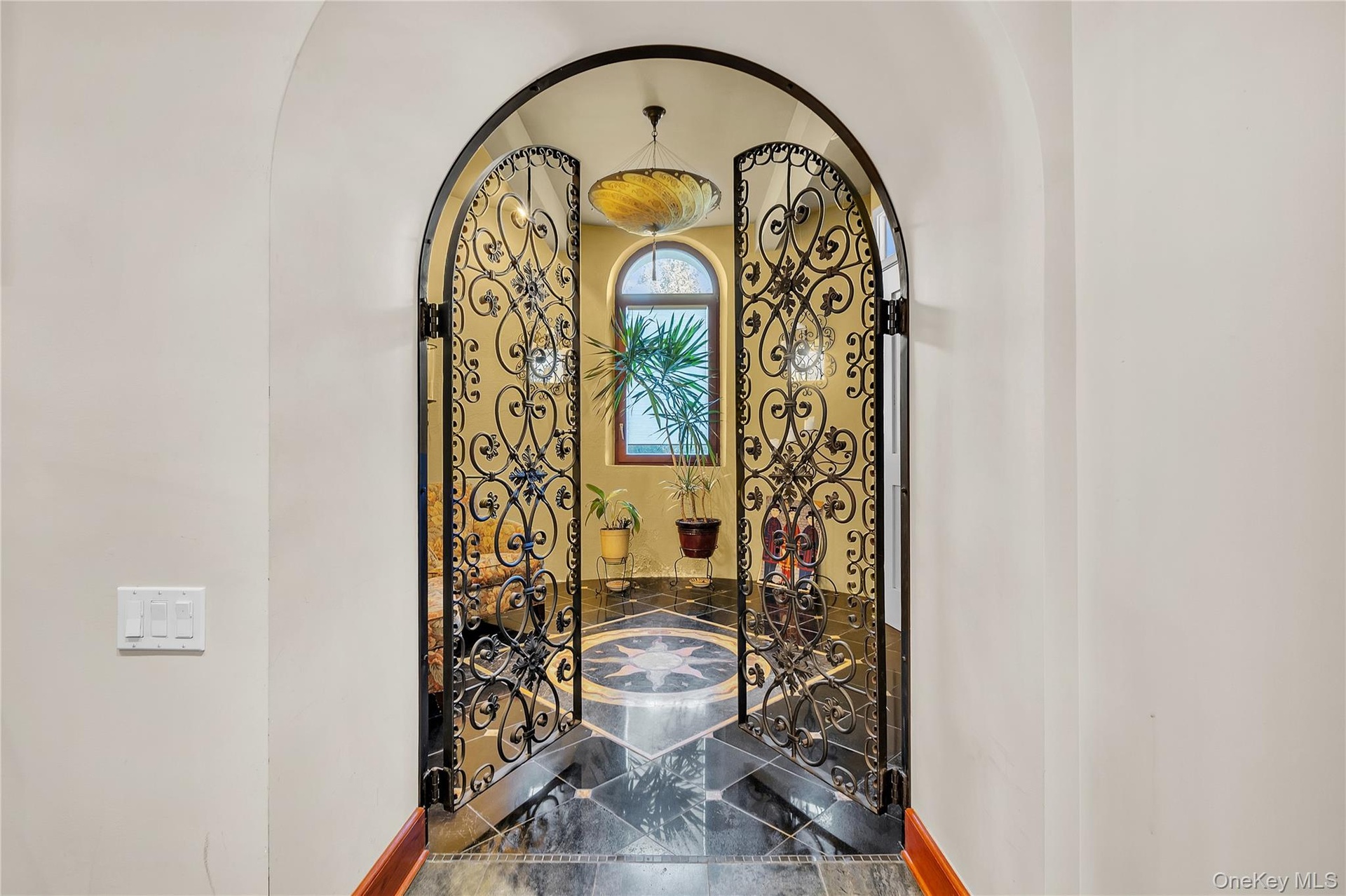 Rising above the Hudson Highlands with commanding views and unmistakable stone architecture, Dicks Castle remains one of the region’s most recognizable and storied landmarks. A Moorish style castle fashioned after Alhambra in Granada, Spain and situated on 26 wooded acres, the exterior features turrets, arches and courtyards surrounded by sculptures and stone walls well over 100 years old. This residence offers an exceptionally rare opportunity: the ability to live inside a piece of Garrison history while enjoying space, privacy, and the contemporary comforts expected of a modern luxury home. This particular home is unlike any other in the castle. At approximately 2,700 square feet, it is the only unit with three full bedrooms and three full baths, a distinction that sets it apart immediately. The interior design elevates the castle’s character with thoughtful updates-tile floors from India with radiant heat, soaring volumes of space, and a layout that blends openness with intimate architectural moments. The heart of the home is a dramatic great room anchored by a fully functional Reynard fireplace and framed by 23-foot ceilings. From this vantage point, two floor-to-ceiling doors and windows open to sweeping panoramas of the Hudson River Valley and the lights of the United States Military Academy at West Point. Few homes in the Hudson Valley offer a view with this level of scale, continuity, and emotional impact. The primary bedroom suite looks out over the great room, giving it a lofted sense of retreat while maintaining connection to the architecture and the views beyond. Two additional bedrooms are generously sized, each appointed with Jacuzzi bathtubs, making them ideal for guests or extended-stay.