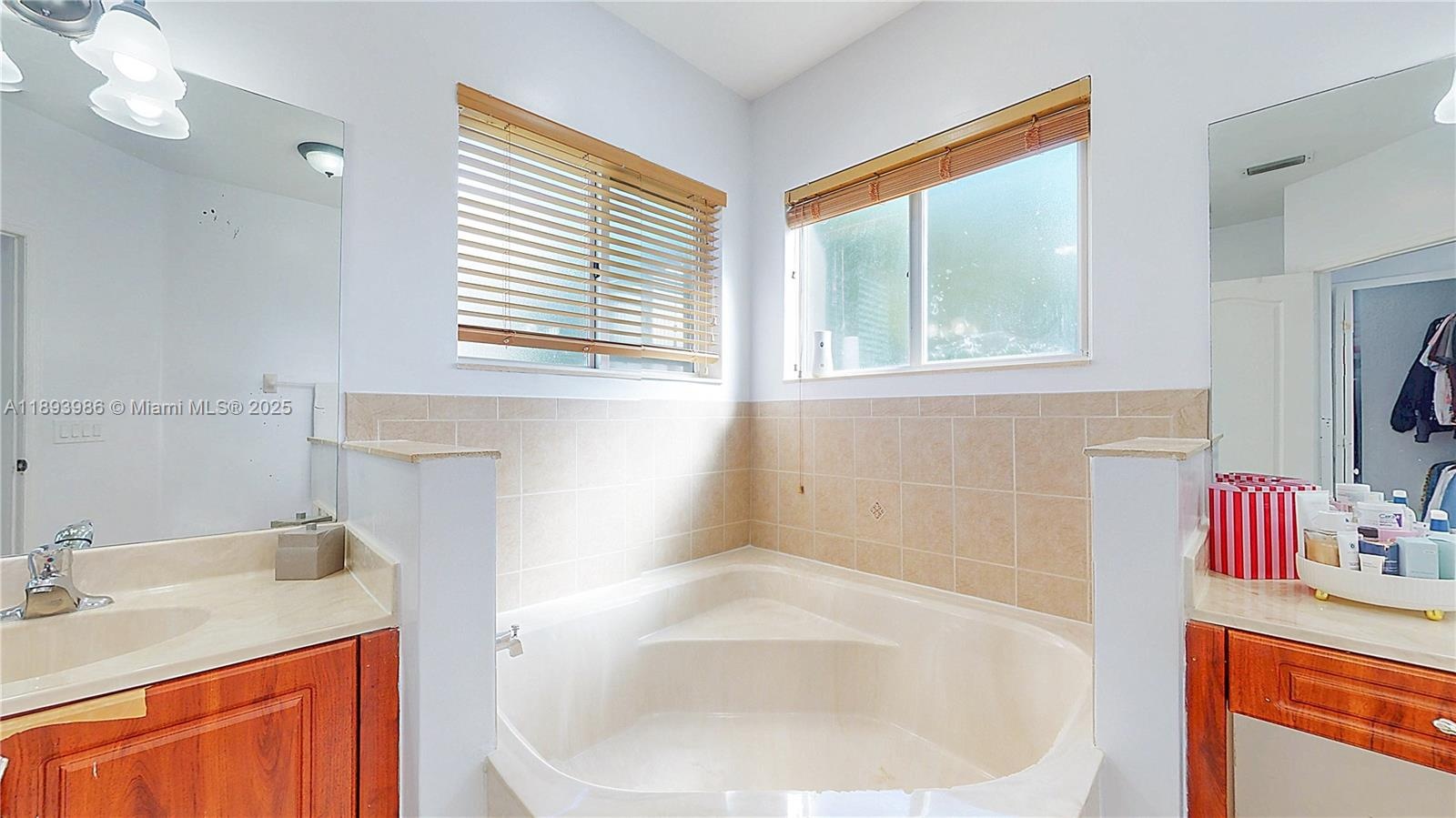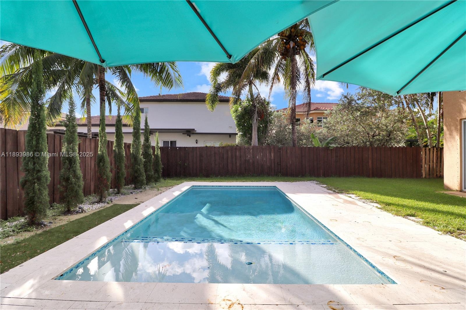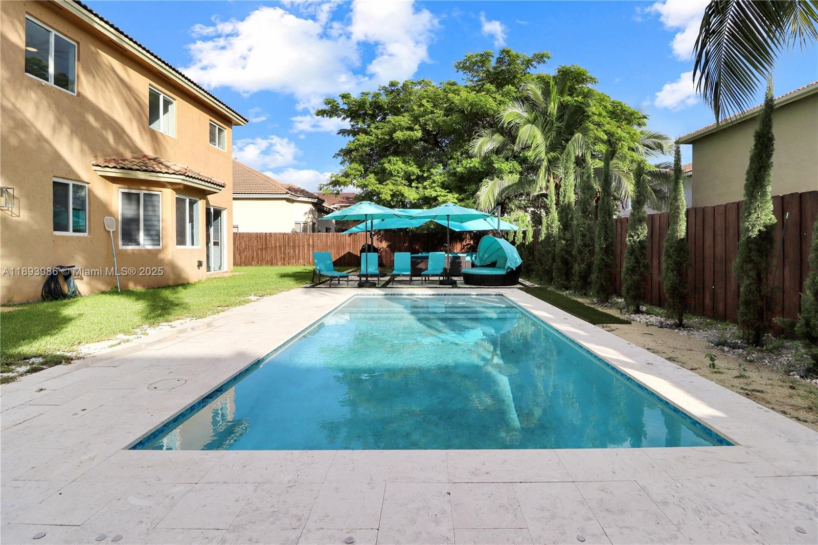 Welcome to this turnkey two-story home located in the luxurious Palm Isles Estates. Perfect for families, this spacious property features 4 bedrooms and 3.5 bathrooms, including a convenient downstairs bedroom with its own ensuite bathroom. Key highlights inside include vaulted ceilings, a newer HVAC system for year-round comfort, stylish tile flooring downstairs, and a striking hardwood staircase with upgraded metal railings. Outdoor enjoyment awaits with a modern private pool, combining modern amenities with a luxurious outdoor living experience. The value-packed HOA offers 24/7 security guards and patrols, AT&T internet, cable, access to the golf course and butterfly park, a Tot Lot, trash pickup, and maintenance of common areas. A clubhouse is also available for an additional fee.