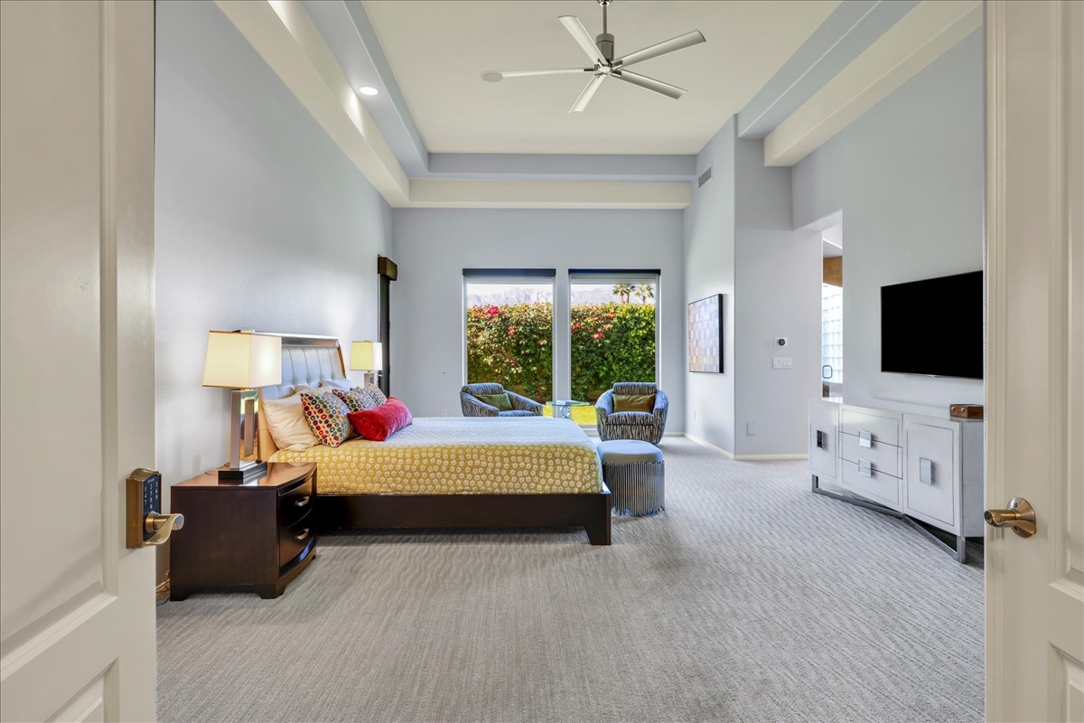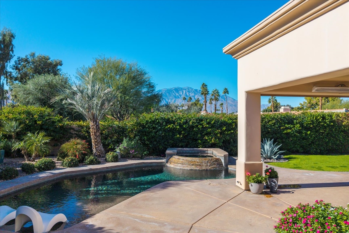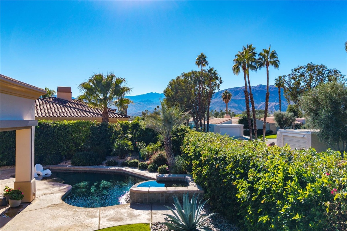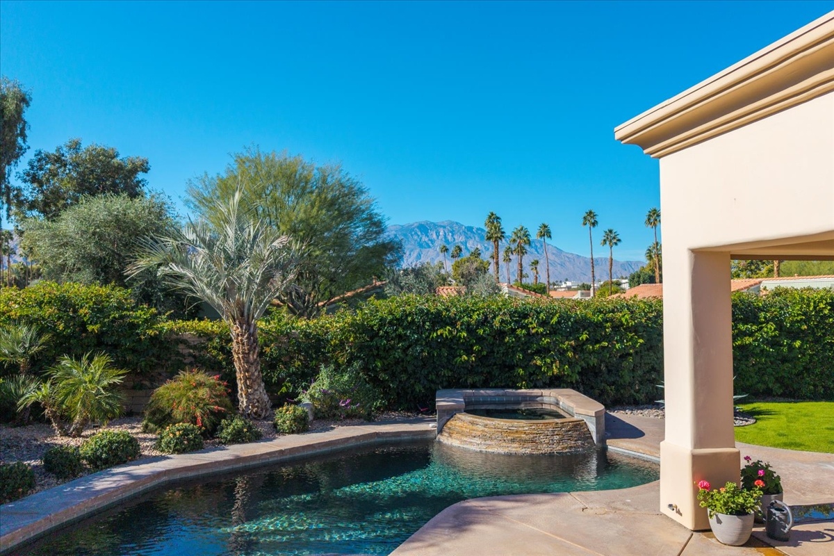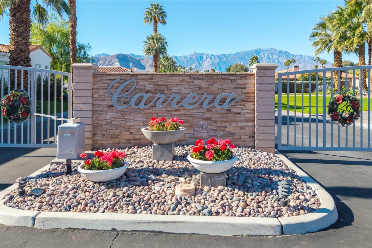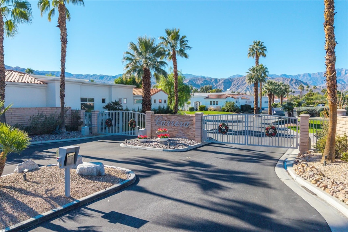 Wake up each day to luxurious Rancho Mirage living in the exclusive gated enclave of Carrera Estates. Set on an oversized lot with breathtaking San Jacinto Mountain views, this residence invites a lifestyle centered on elegance, entertaining, and privacy. Sunlight pours through expansive windows, illuminating soaring 14 foot ceilings, travertine floors, and open living spaces designed to gather and relax. Featuring 4 bedrooms, 5 bathrooms, including a casita with a private entry to welcome guests. Gather in the gourmet kitchen which seamlessly flows into the great room and formal dining areas. Retreat to the serene primary suite with its high ceilings, dual vanity bath, and walk-in closet. All bedrooms are ensuite with patio access. Evenings are best enjoyed outdoors, where lush landscaping surrounds a custom saline Pebble Tec pool and spa beneath a star-studded desert sky. Home has solar panels and a climate-controlled 3-car garage, plus a private gated entry. Minutes to Eisenhower Hospital and golfing. Enjoy a stroll to nearby dining, shopping, and entertainment. This home offers more than a place to live. It delivers a refined desert lifestyle.