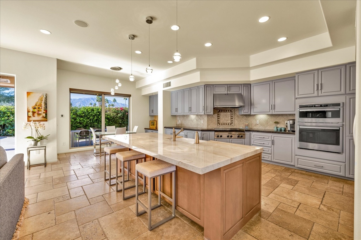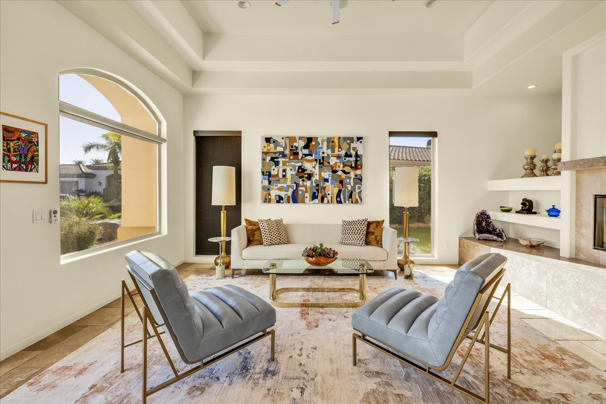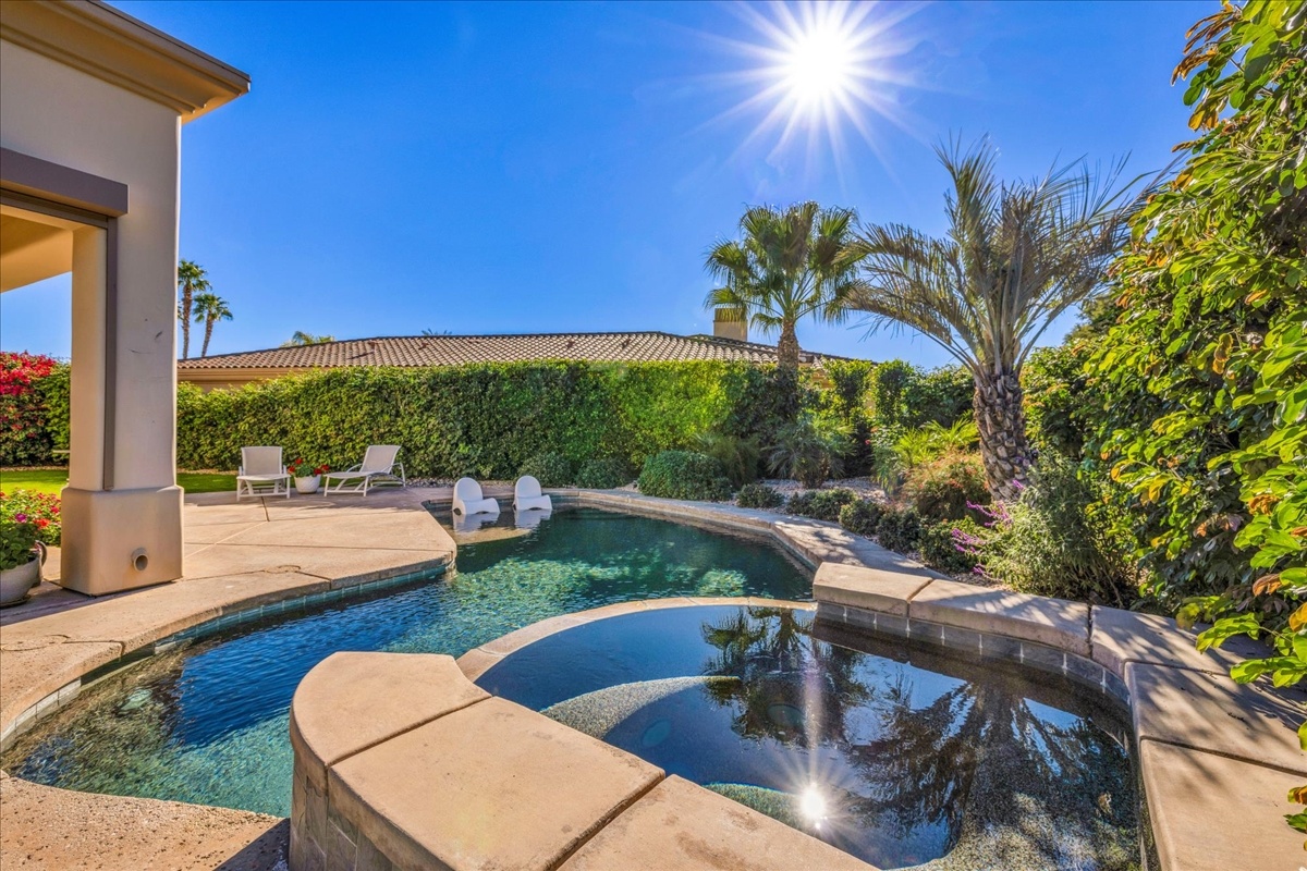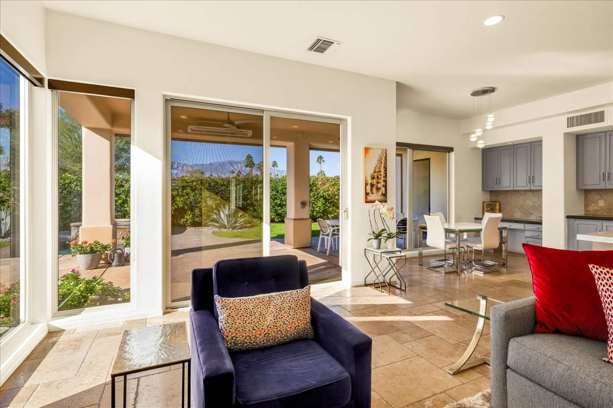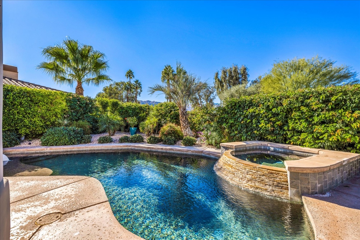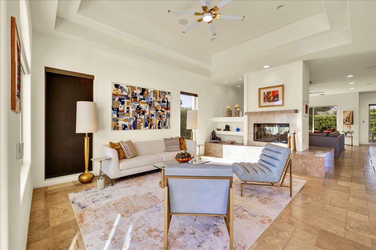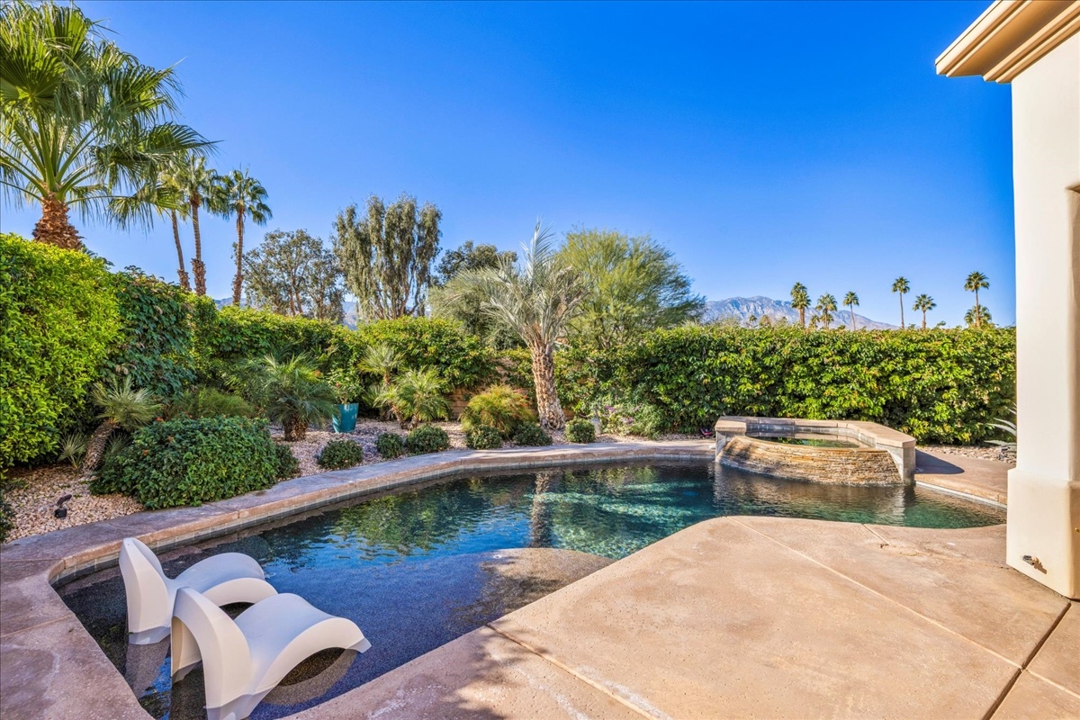 Wake up each day to luxurious Rancho Mirage living in the exclusive gated enclave of Carrera Estates. Set on an oversized lot with breathtaking San Jacinto Mountain views, this residence invites a lifestyle centered on elegance, entertaining, and privacy. Sunlight pours through expansive windows, illuminating soaring 14 foot ceilings, travertine floors, and open living spaces designed to gather and relax. Featuring 4 bedrooms, 5 bathrooms, including a casita with a private entry to welcome guests. Gather in the gourmet kitchen which seamlessly flows into the great room and formal dining areas. Retreat to the serene primary suite with its high ceilings, dual vanity bath, and walk-in closet. All bedrooms are ensuite with patio access. Evenings are best enjoyed outdoors, where lush landscaping surrounds a custom saline Pebble Tec pool and spa beneath a star-studded desert sky. Home has solar panels and a climate-controlled 3-car garage, plus a private gated entry. Minutes to Eisenhower Hospital and golfing. Enjoy a stroll to nearby dining, shopping, and entertainment. This home offers more than a place to live. It delivers a refined desert lifestyle.