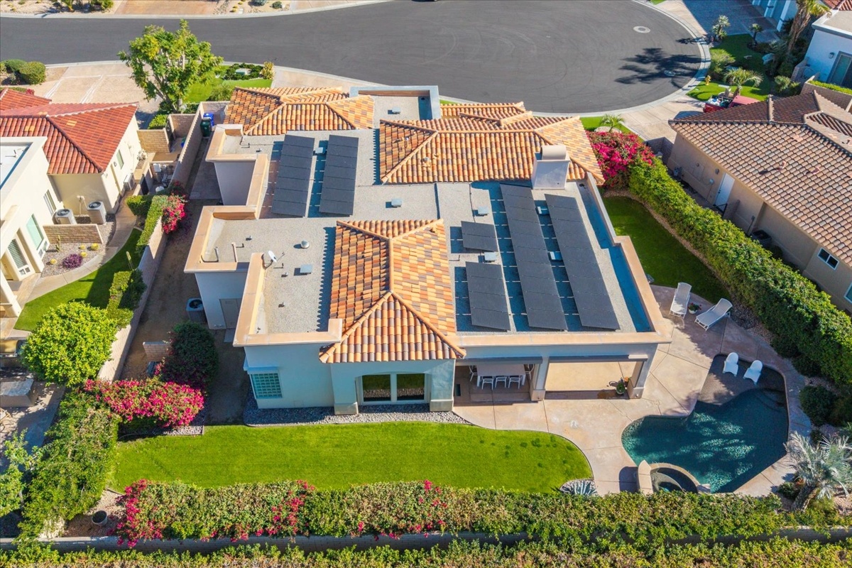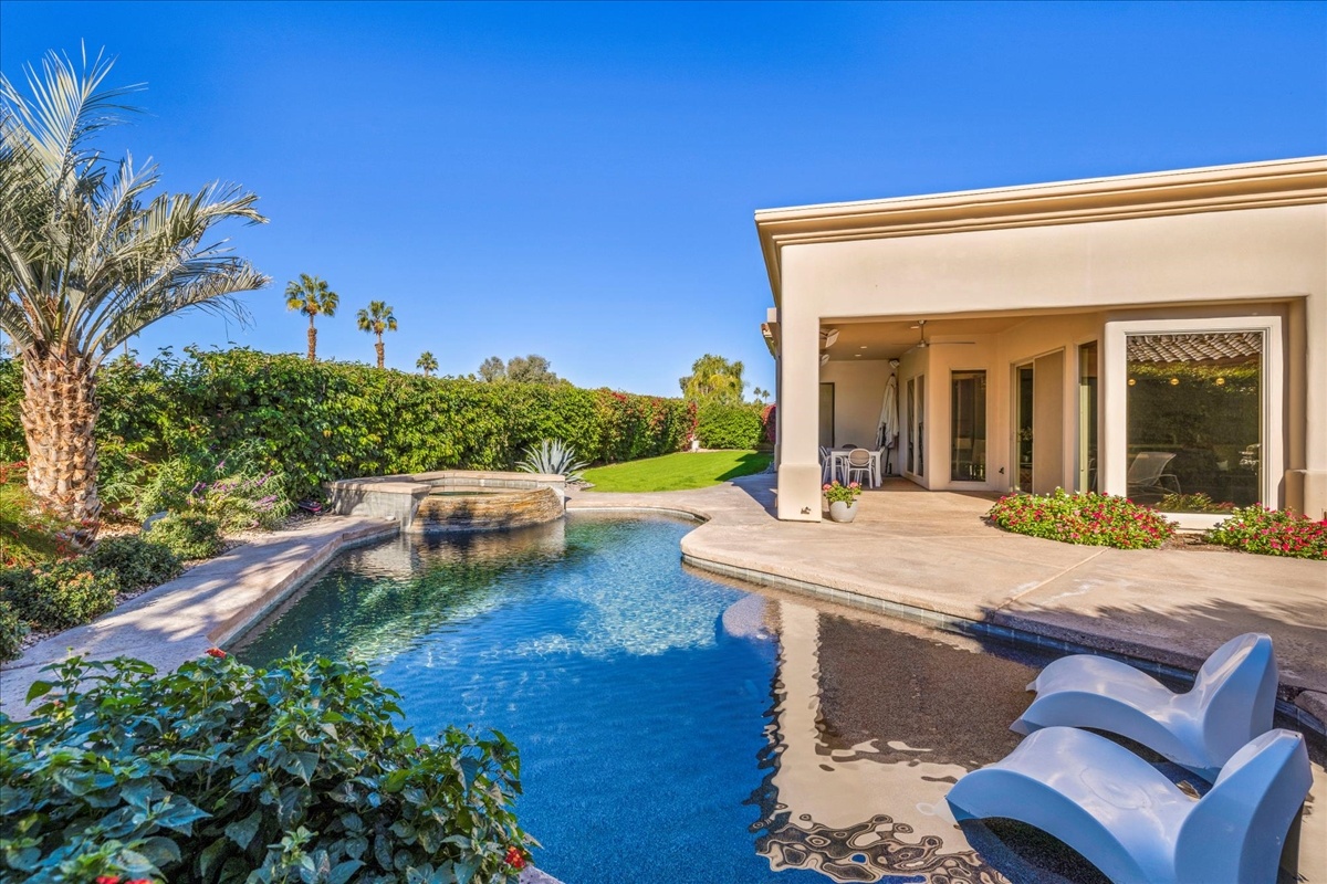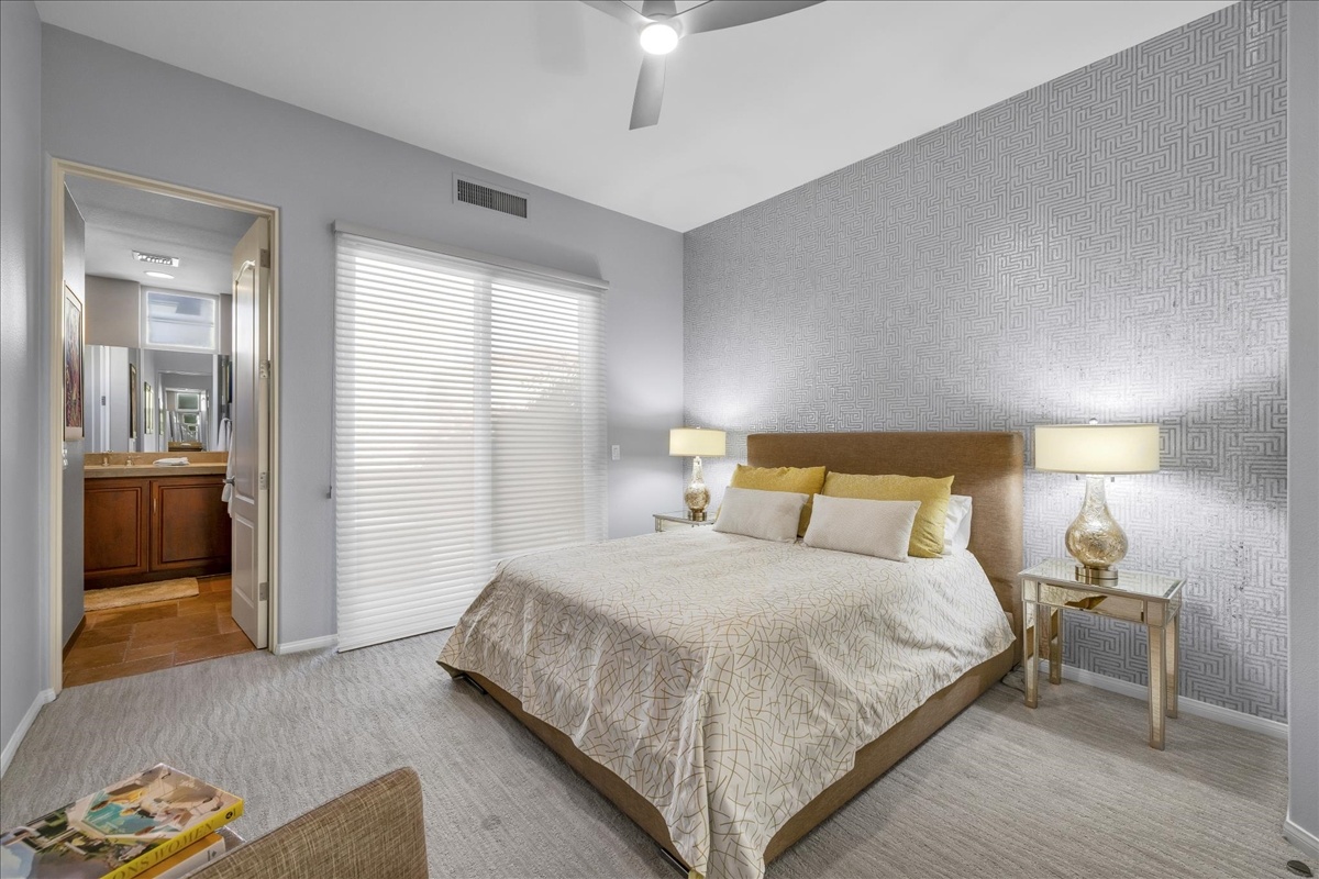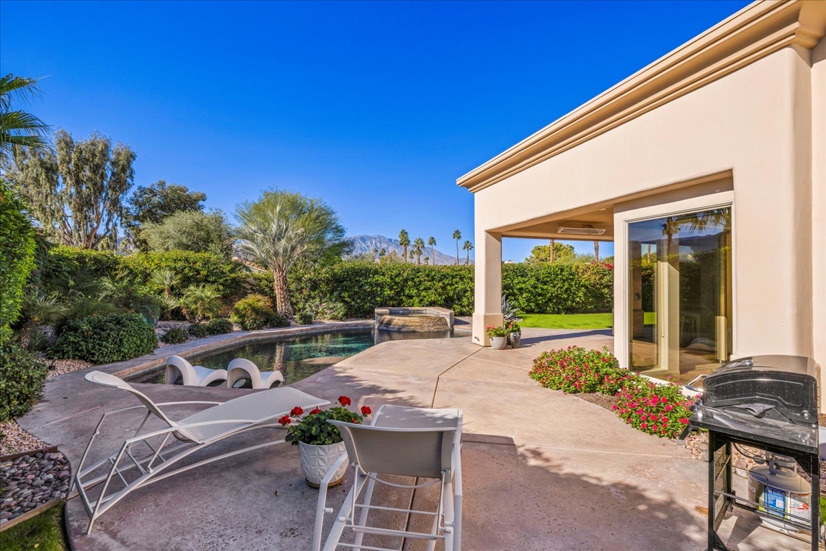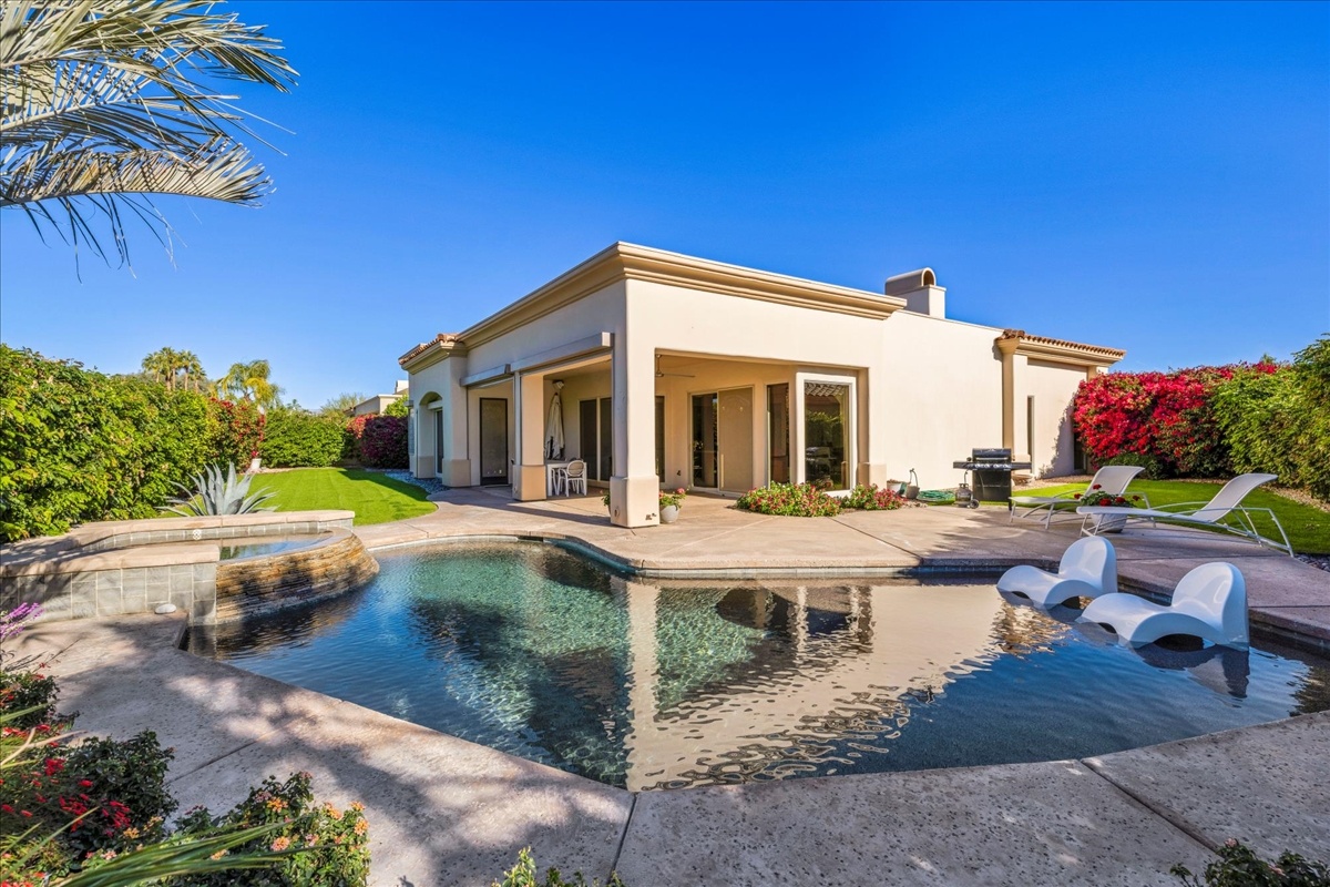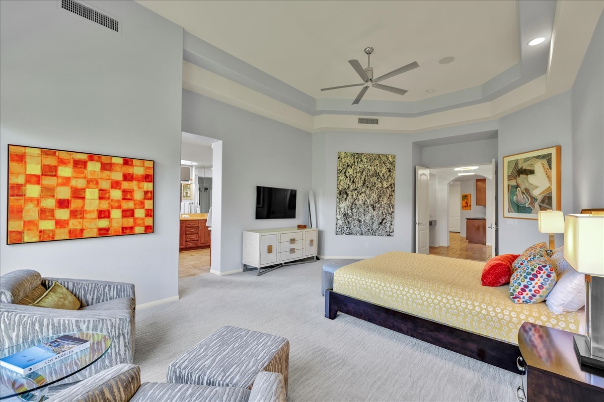 Wake up each day to luxurious Rancho Mirage living in the exclusive gated enclave of Carrera Estates. Set on an oversized lot with breathtaking San Jacinto Mountain views, this residence invites a lifestyle centered on elegance, entertaining, and privacy. Sunlight pours through expansive windows, illuminating soaring 14 foot ceilings, travertine floors, and open living spaces designed to gather and relax. Featuring 4 bedrooms, 5 bathrooms, including a casita with a private entry to welcome guests. Gather in the gourmet kitchen which seamlessly flows into the great room and formal dining areas. Retreat to the serene primary suite with its high ceilings, dual vanity bath, and walk-in closet. All bedrooms are ensuite with patio access. Evenings are best enjoyed outdoors, where lush landscaping surrounds a custom saline Pebble Tec pool and spa beneath a star-studded desert sky. Home has solar panels and a climate-controlled 3-car garage, plus a private gated entry. Minutes to Eisenhower Hospital and golfing. Enjoy a stroll to nearby dining, shopping, and entertainment. This home offers more than a place to live. It delivers a refined desert lifestyle.