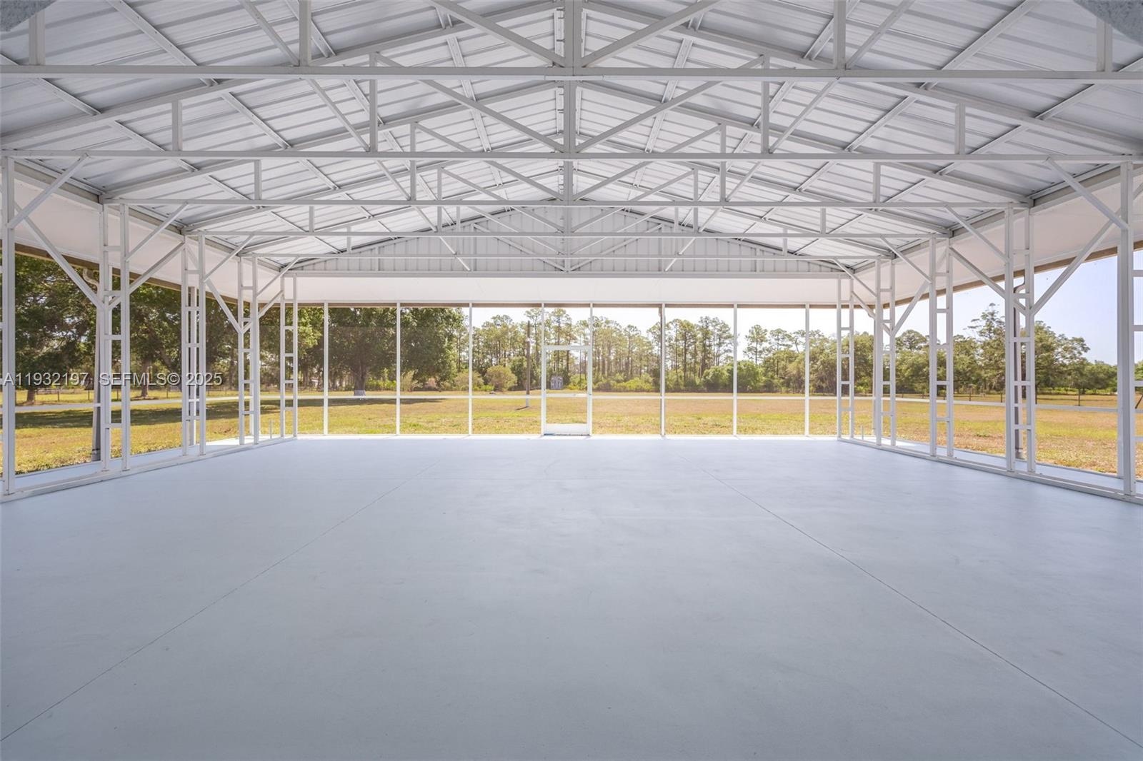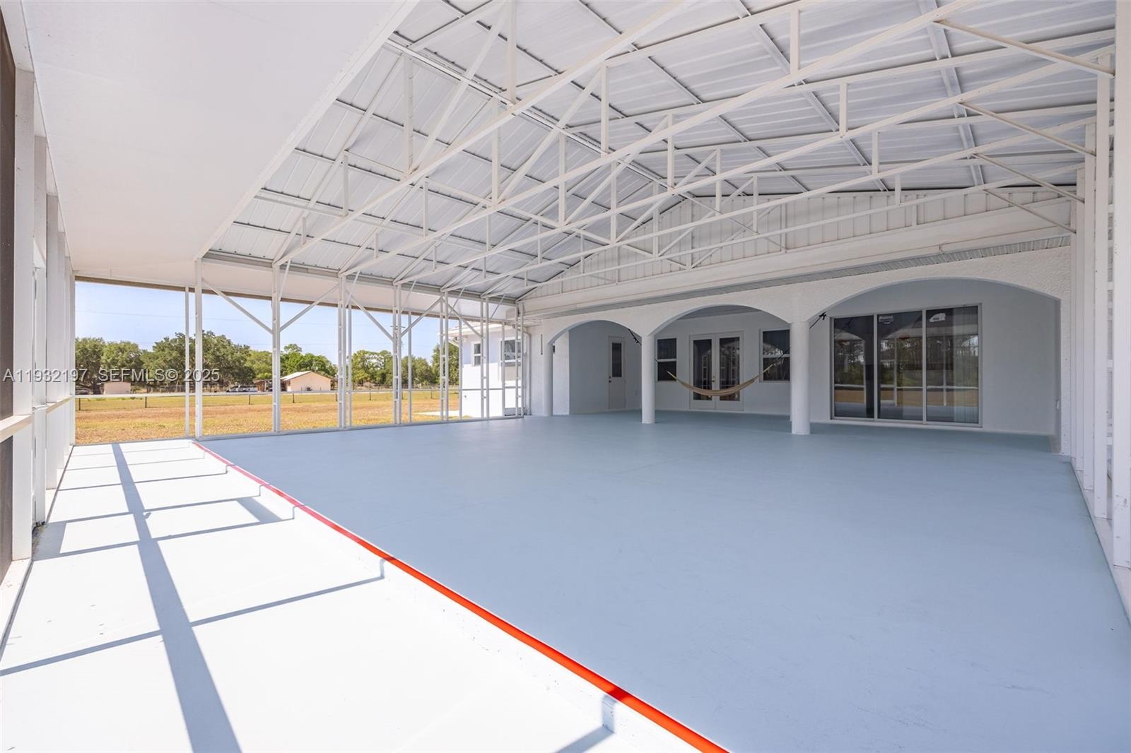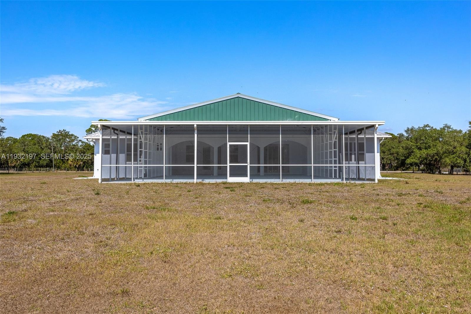 Outstanding in its Field! You will find this Custom Built 4 bedroom, 3 bath home placed in the middle of 4.85 acres of QUIET! Located down a peaceful, dead end road you will find this well built home with a metal roof and completely fenced offering years of carefree living. Inside you will find and easy to love floorplan and very spacious rooms. A well designed kitchen is the heart of the home offering an abundance of quartz countertops, a small island worktable, a gas stove (there is an electric plug installed behind the stove if you want to change to electric) and breakfast bar. High 10, 12 and 13 foot ceilings and 8' doors throughout with abundant windows lend to plenty of natural lighting. Step outside onto the under truss back lanai and into a massive,14 gauge steel sturdy screened porch where possibilities are endless, party area, roller skating, this porch is amazing and is sure to please all. There is an abundance of outdoor electrical plugs, Nothing was overlooked with this solidly built home. A 45 ' container exist on the property and will convey. (One guest bathroom is completed, The master bathroom has room and plumbing for a tub and still needs vanities. The bathroom for the 2 bedrooms on the opposite side of the home still needs the vanities.) Seller is selling the home "AS Is". Finish the bathrooms to your own style and enjoy a Tranquil Country Lifestyle.