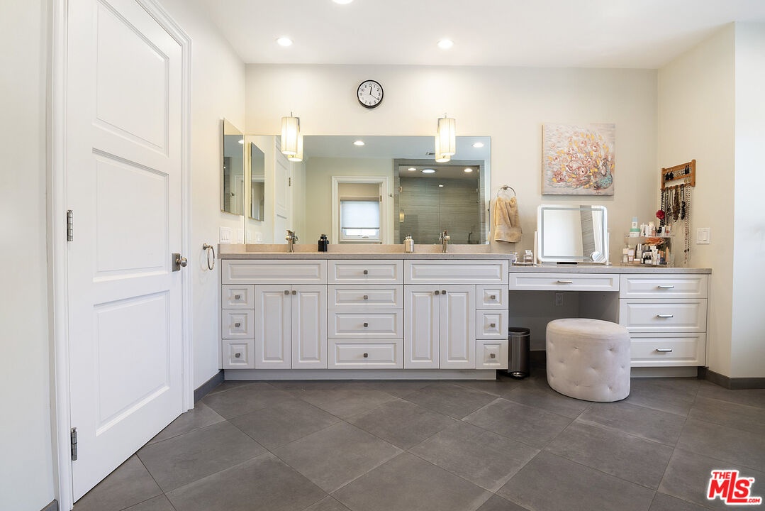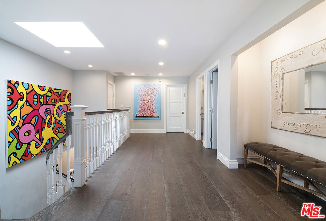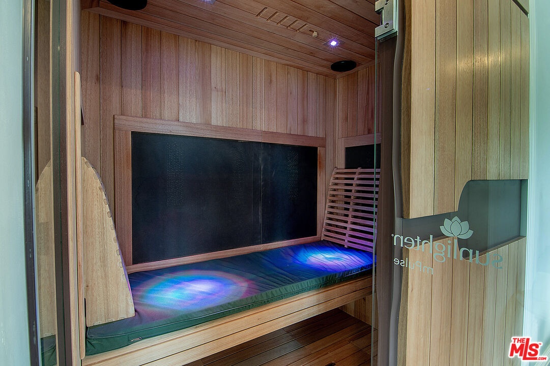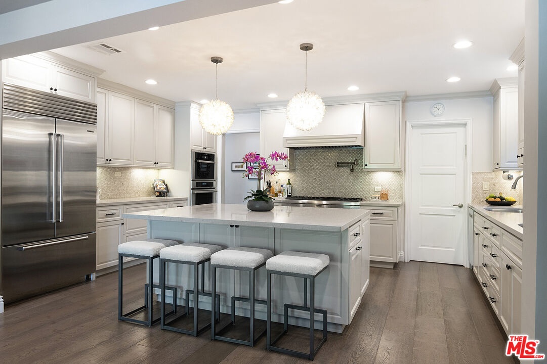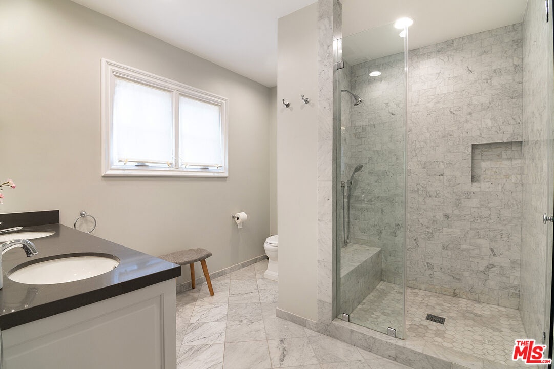 Nestled in the heart of the coveted Beverlywood HOA, a short walk from Circle Park, this exquisite 2014 transitional style residence offers 5 bedrooms, 5.5 bathrooms, and approximately 4,877 square feet of refined living space on a rare and expansive 10,000 square foot lot. Step into a gracious central vestibule, flanked by an elegant living room that sets a tone of timeless sophistication. To one side, discover an exceptionally spacious formal dining room, adorned with a built-in wet bar with ice machine perfect for festive gatherings, with seamless access to indoor-outdoor dining. The chef's kitchen is a masterpiece of function and luxury, featuring dual sinks, dual dishwashers, high-end Thermador double ovens, range, and warming drawer, a Sub-Zero refrigerator, a generous center island seating four, and a walk-in pantry. The adjacent elegant family den features wall-to-wall custom built-ins, a dedicated office workstation, and French doors opening directly to the lush backyard. Downstairs also includes a full guest bedroom suite for privacy and comfort, along with a chic powder room. The wide staircase bathed in natural light from a streaming skylight, leads to a spacious upstairs landing. Here you will find four additional private suites, each with its own en-suite bathroom. The large primary suite is a true retreat with an expansive balcony overlooking the verdant yard. One upstairs bedroom contains a built-in infrared sauna and integrated theater system for ultimate enjoyment. Outside, the nearly 10,000-square-foot lot unfolds into a resort-like paradise complete with a solar-heated pool, spa, and convenient outdoor bathroom. The rear patio, thoughtfully half-covered and half-pergola shaded for enjoyment in any weather, features a dedicated dining area with built-in BBQ station, a lounging zone complete with mounted TV and outdoor fireplace. This rare combination of size, sophistication, and location in prime Beverlywood presents an unparalleled leasing opportunity for those seeking elevated Westside living.