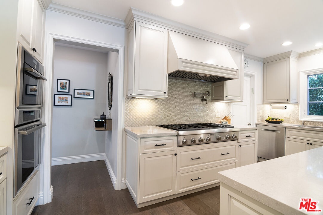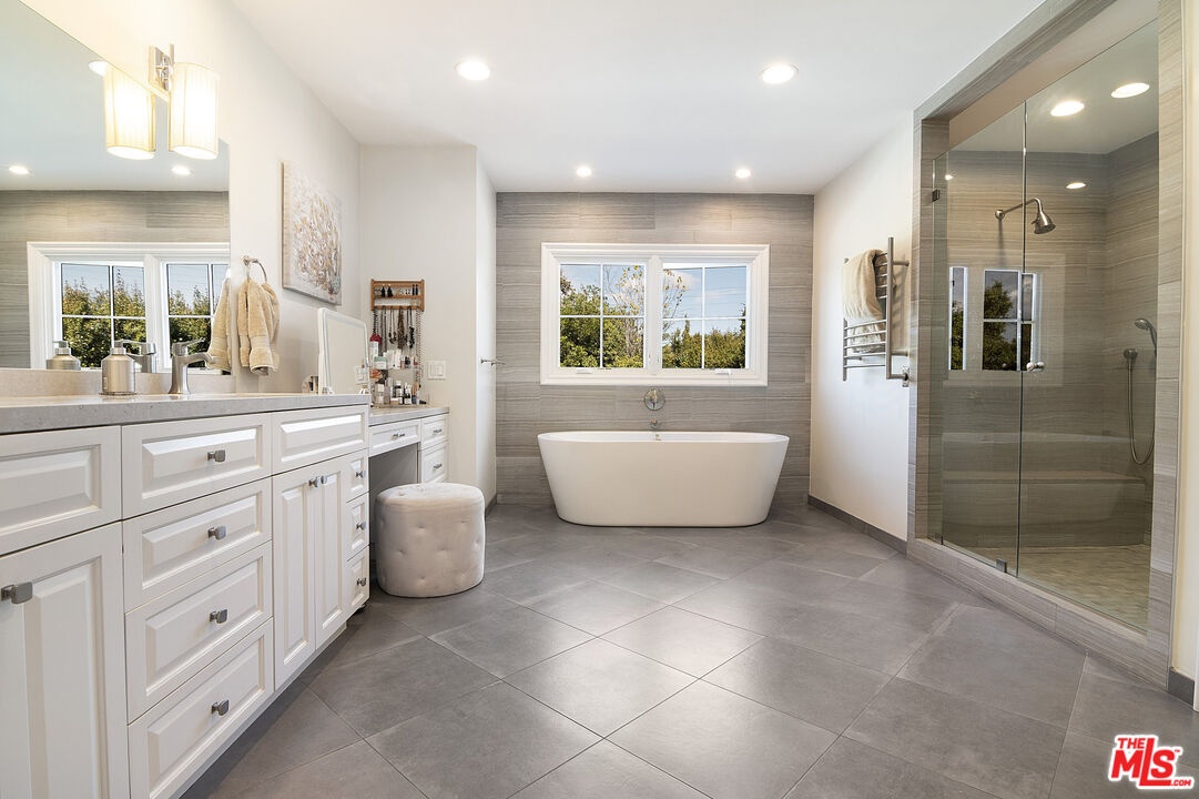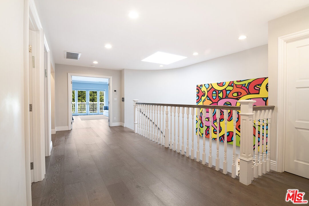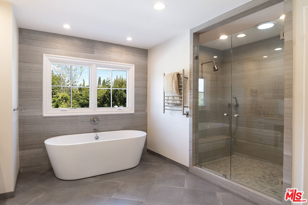 Nestled in the heart of the coveted Beverlywood HOA, a short walk from Circle Park, this exquisite 2014 transitional style residence offers 5 bedrooms, 5.5 bathrooms, and approximately 4,877 square feet of refined living space on a rare and expansive 10,000 square foot lot. Step into a gracious central vestibule, flanked by an elegant living room that sets a tone of timeless sophistication. To one side, discover an exceptionally spacious formal dining room, adorned with a built-in wet bar with ice machine perfect for festive gatherings, with seamless access to indoor-outdoor dining. The chef's kitchen is a masterpiece of function and luxury, featuring dual sinks, dual dishwashers, high-end Thermador double ovens, range, and warming drawer, a Sub-Zero refrigerator, a generous center island seating four, and a walk-in pantry. The adjacent elegant family den features wall-to-wall custom built-ins, a dedicated office workstation, and French doors opening directly to the lush backyard. Downstairs also includes a full guest bedroom suite for privacy and comfort, along with a chic powder room. The wide staircase bathed in natural light from a streaming skylight, leads to a spacious upstairs landing. Here you will find four additional private suites, each with its own en-suite bathroom. The large primary suite is a true retreat with an expansive balcony overlooking the verdant yard. One upstairs bedroom contains a built-in infrared sauna and integrated theater system for ultimate enjoyment. Outside, the nearly 10,000-square-foot lot unfolds into a resort-like paradise complete with a solar-heated pool, spa, and convenient outdoor bathroom. The rear patio, thoughtfully half-covered and half-pergola shaded for enjoyment in any weather, features a dedicated dining area with built-in BBQ station, a lounging zone complete with mounted TV and outdoor fireplace. This rare combination of size, sophistication, and location in prime Beverlywood presents an unparalleled leasing opportunity for those seeking elevated Westside living.