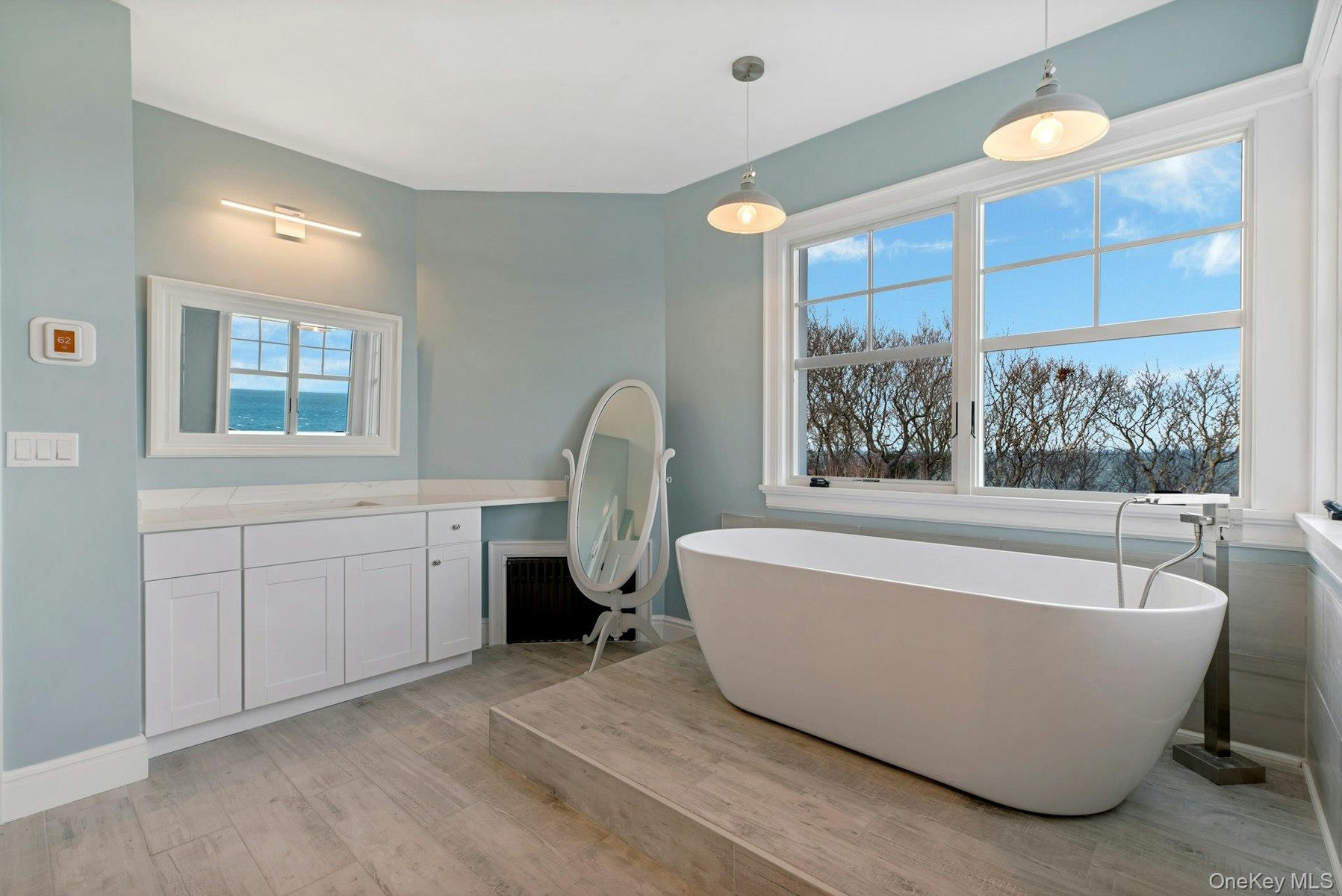 Upstairs, the luxurious primary bedroom offers an entirely new en-suite bath with an oval soaking tub positioned to take in the breathtaking water views. The second floor also includes two additional bedrooms plus a flex room, along with an updated hall bath. Beautiful 4-inch white oak flooring runs throughout the second floor, complemented by a beautiful staircase with new railings and new seven-foot interior doors. All walls and ceilings have been skim-coated and freshly repainted, and new crown molding enhances the entire home. The attic has been upgraded with new plywood flooring for excellent storage.