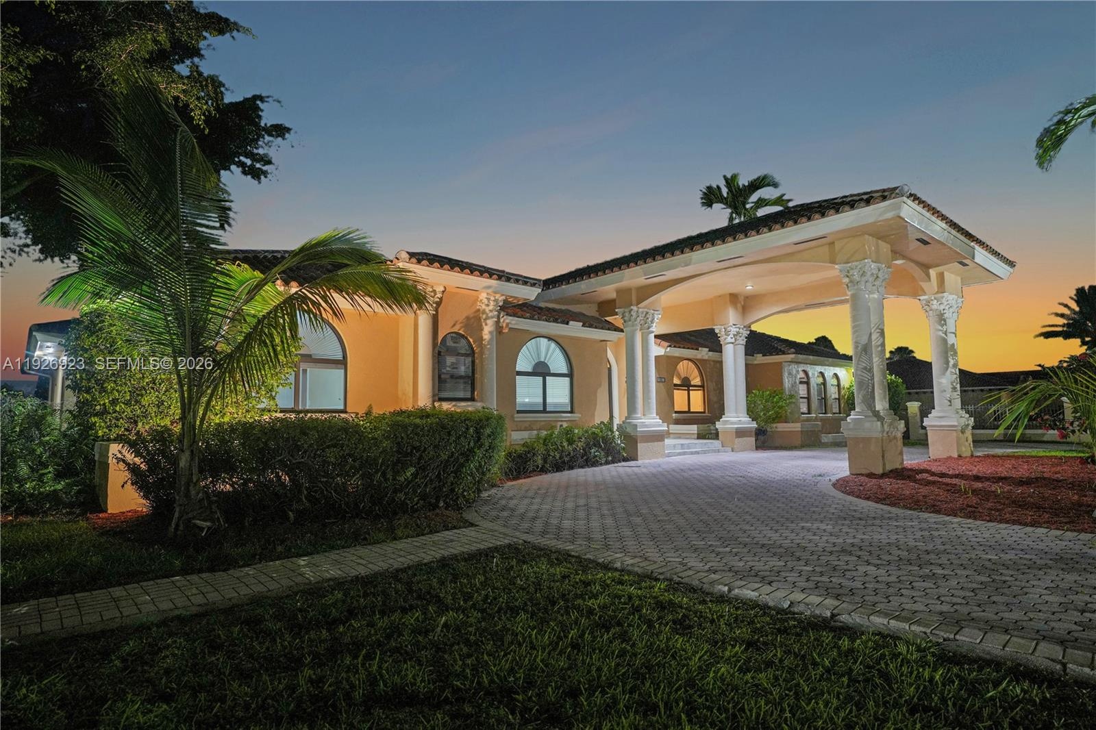 This stunning property features high-polished marble floors throughout, soaring volume ceilings, and a spacious 2-car garage with charger. Enjoy the convenience and privacy of a gated entrance, porte-cochere, roman end salt water pool with jacuzzi & gazebo with a full bathroom, horsed permitted, extra large primary bedroom, open large kitchen. A separate Guest House/in laws with a private entrance on the north side of the property which is 1,500 Sf, 3/2. Don't Miss out on this great opportunity.
