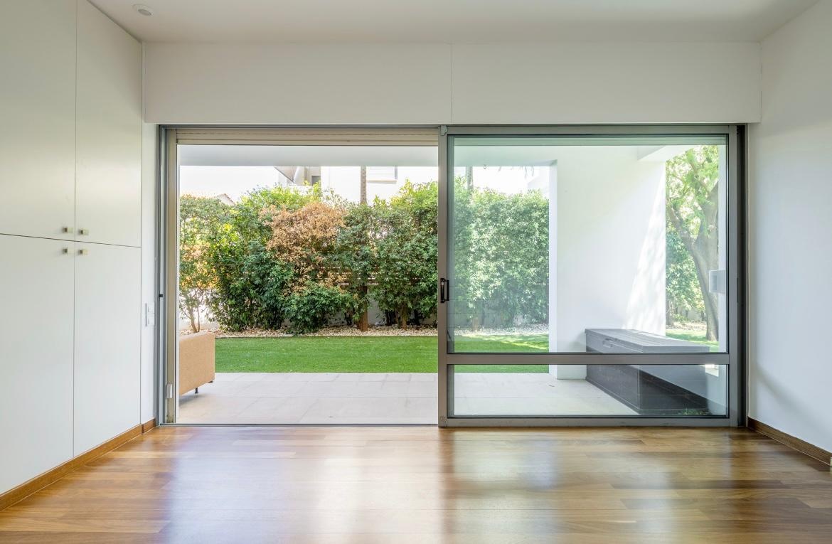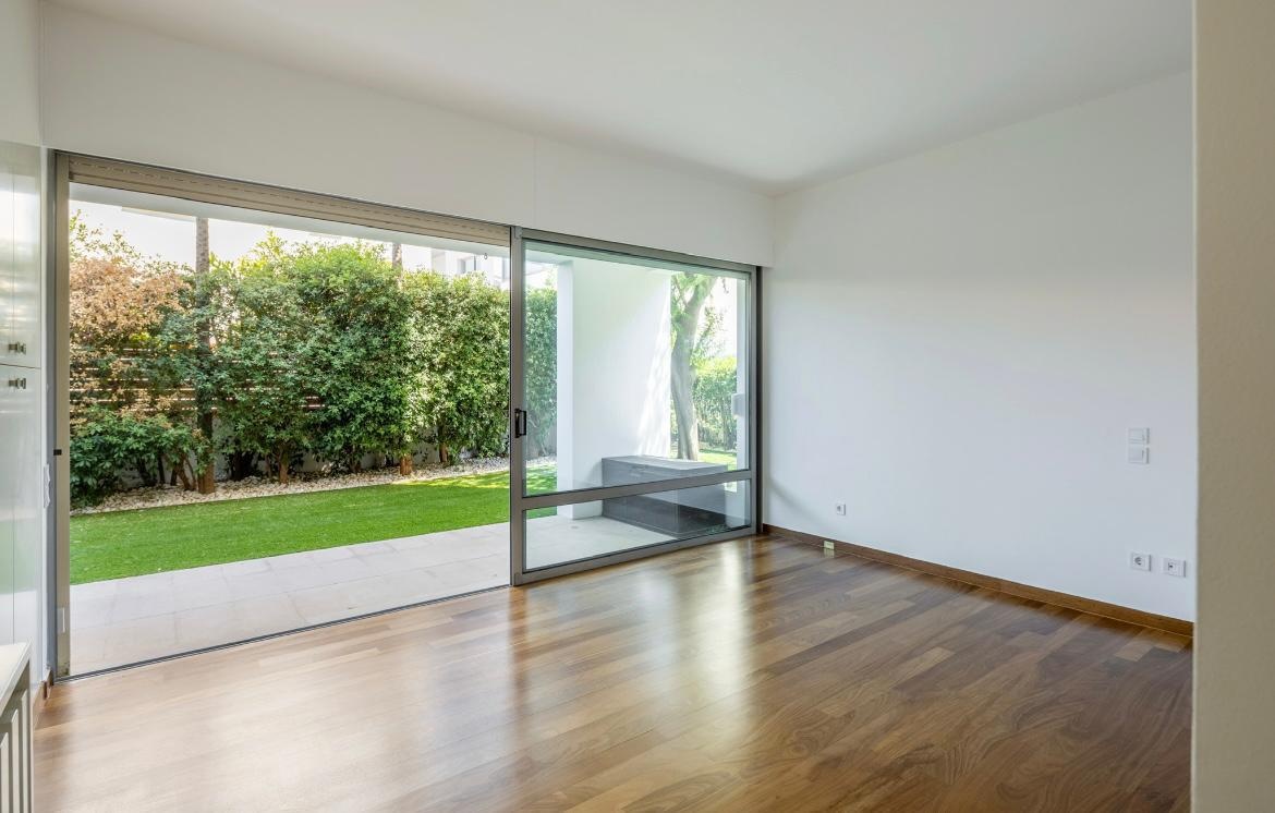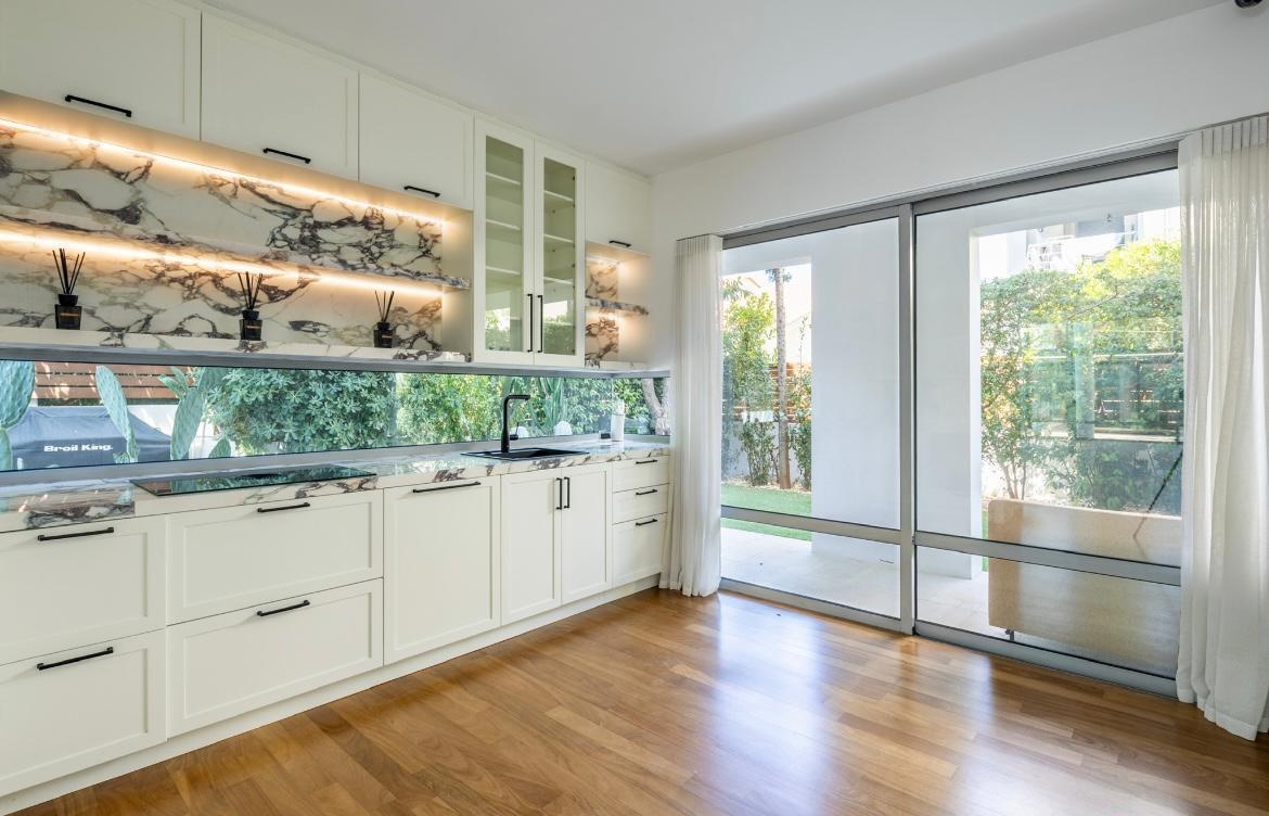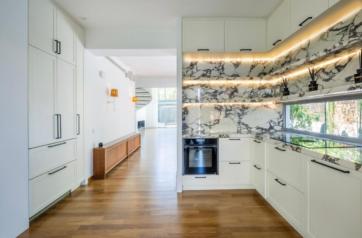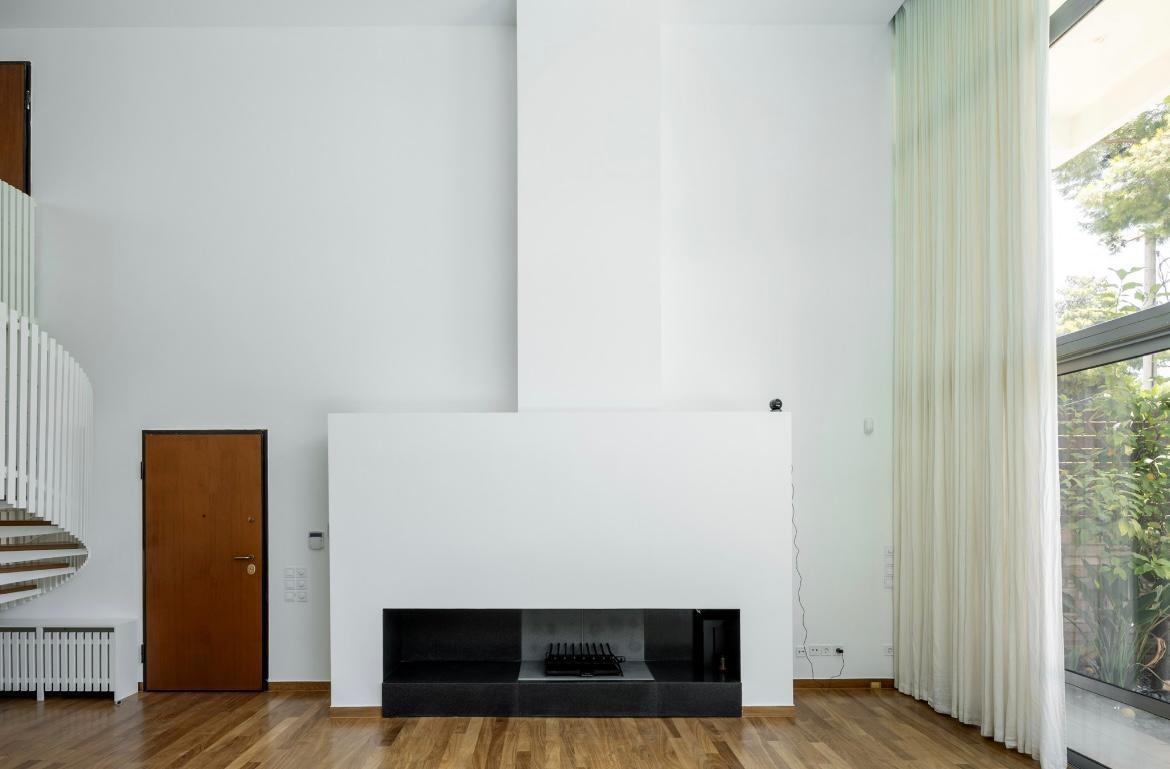 The ground floor opens into a bright and elegant living area featuring a fireplace, large openings, and electronic curtains that enhance both comfort and ambiance. A modern kitchen with high end appliances and excellent functionality connects seamlessly to the living space, making it ideal for both everyday living and entertaining. From this level, the home extends outdoors to a private garden and exclusive swimming pool, creating a true indoor outdoor lifestyle.