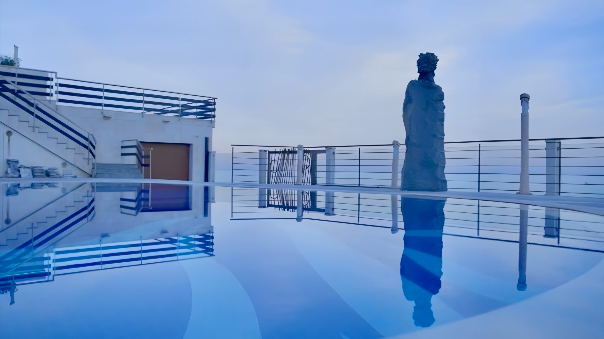 Outdoor spaces unfold toward the sea with a panoramic swimming pool overlooking the Mediterranean, where architecture and landscape merge in perfect harmony. Terraces and open-air living areas provide an unparalleled setting for relaxation, framed by uninterrupted sea views and exceptional natural light.