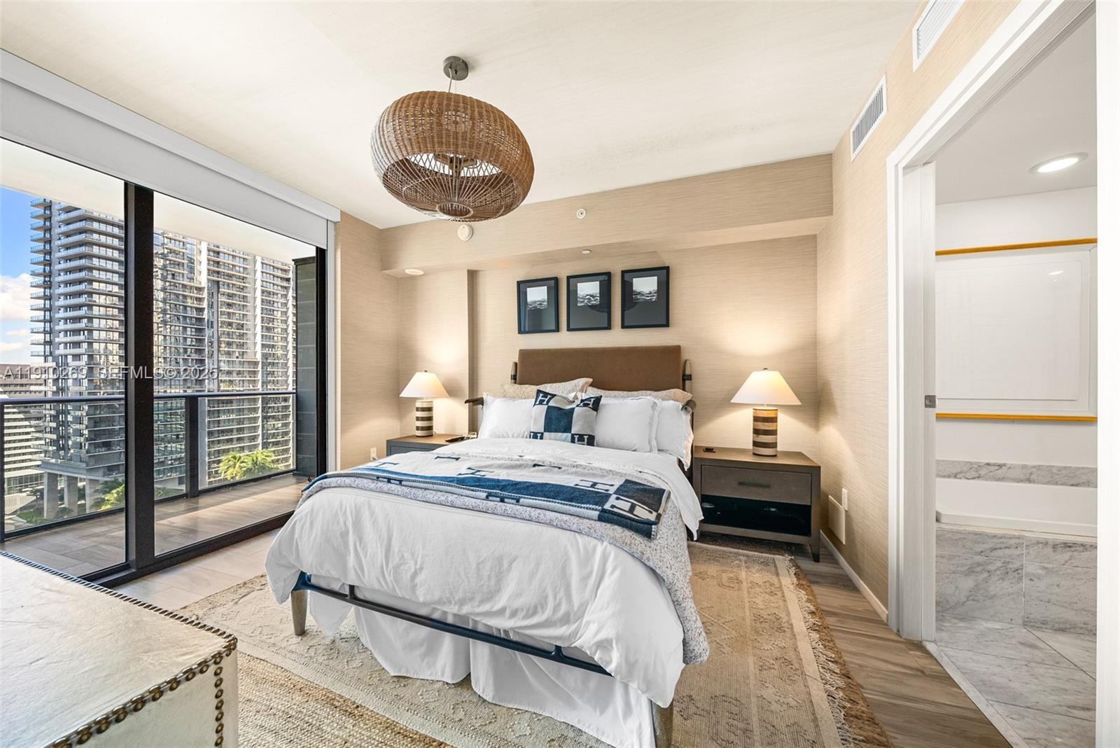 Impeccably designer redone residence at SLS Lux featuring statement Visual Comfort amp ; Kelly Wearstler lighting throughout and sophisticated Thibaut wallpaper.