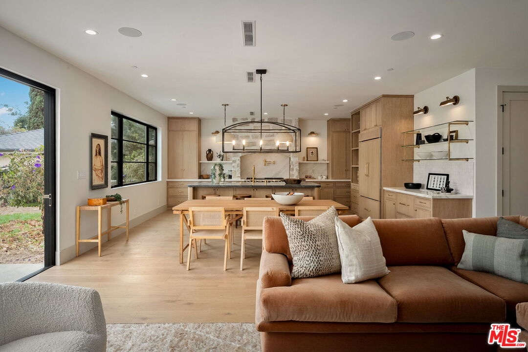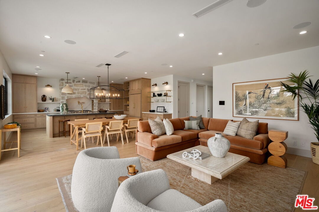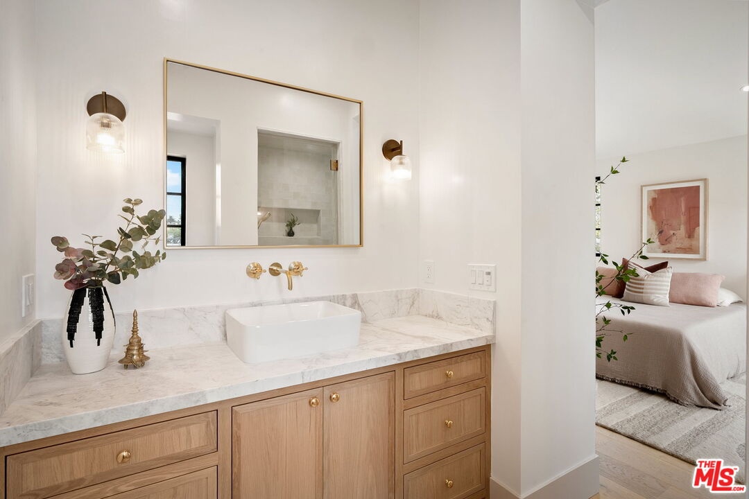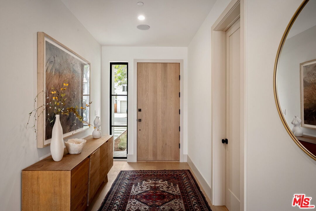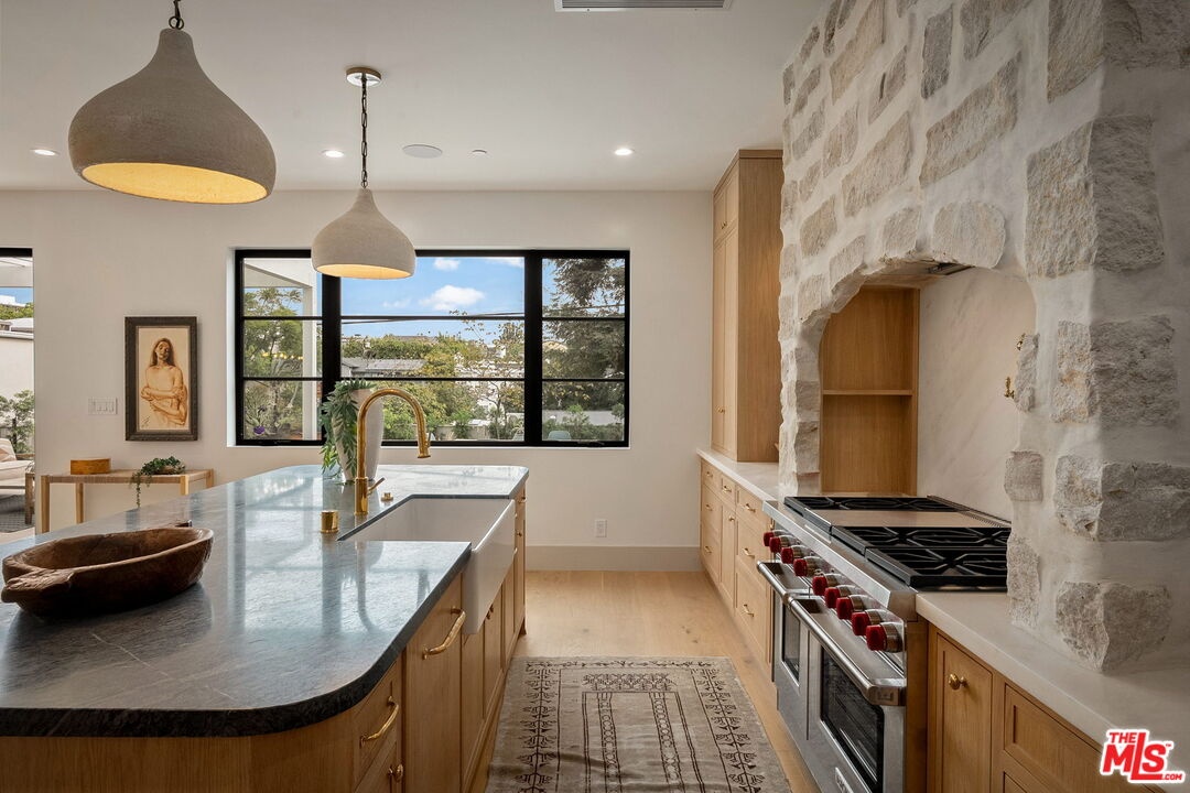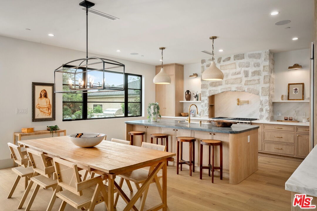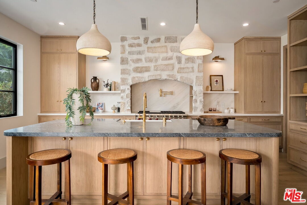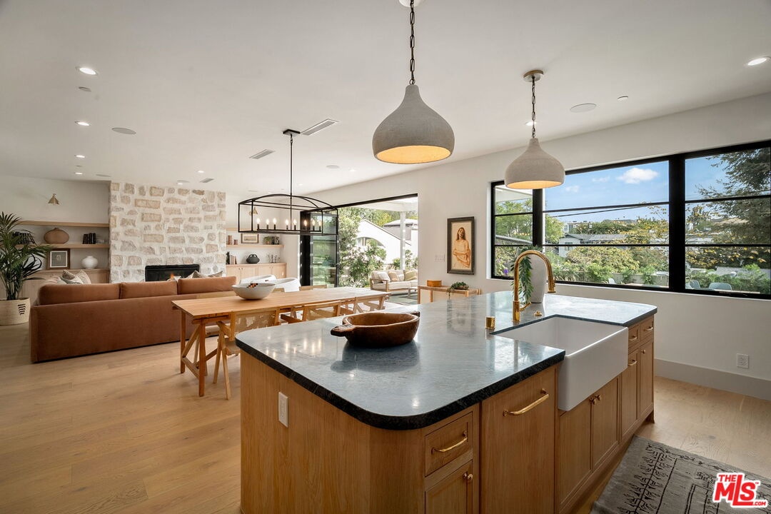 Presenting 3104 Kelton Avenue, a stunning contemporary farmhouse that blends bespoke design with modern luxury in the heart of Westside Village. From the moment you arrive, you're greeted by captivating curb appeal - drought-tolerant landscaping, a custom white oak front door, and a matching white oak garage door that set the tone for the refined craftsmanship found within. Inside, the home's open-concept layout showcases a seamless flow between the chef's kitchen, dining, and living areas. The kitchen is a true showpiece with marble countertops, a soapstone island, Wolf range, Sub-Zero refrigerator, custom walk-in wine room, and a stunning curved white oak island with marble shelving. An adjacent secondary kitchen/pantry adds both function and flexibility. The inviting living room features a stone fireplace, built-ins, and La Cantina accordion doors that open completely to create a true indoor-outdoor living experience - perfect for entertaining. Upstairs, the spacious primary suite offers a private sanctuary with vaulted ceilings, fireplace, balcony, and a custom white oak walk-in closet. The spa-like en suite bath features dual sinks, a makeup vanity, glass shower, and soaker tub. Every detail has been thoughtfully curated - from white oak hardwood floors and Milgard windows to unlacquered brass accents, integrated speakers, security cameras, and fire sprinklers throughout. Well-appointed guest rooms and beautifully designed bathrooms complement the home's refined aesthetic, while a laundry room with sink and built-in cabinetry provides everyday convenience. Outside, an enchanting yard awaits with a large patio ideal for al fresco dining, a built-in BBQ, and grassy lawn. Ideally located just moments from top shopping, dining, and entertainment on the Westside, this home perfectly embodies elevated California living.