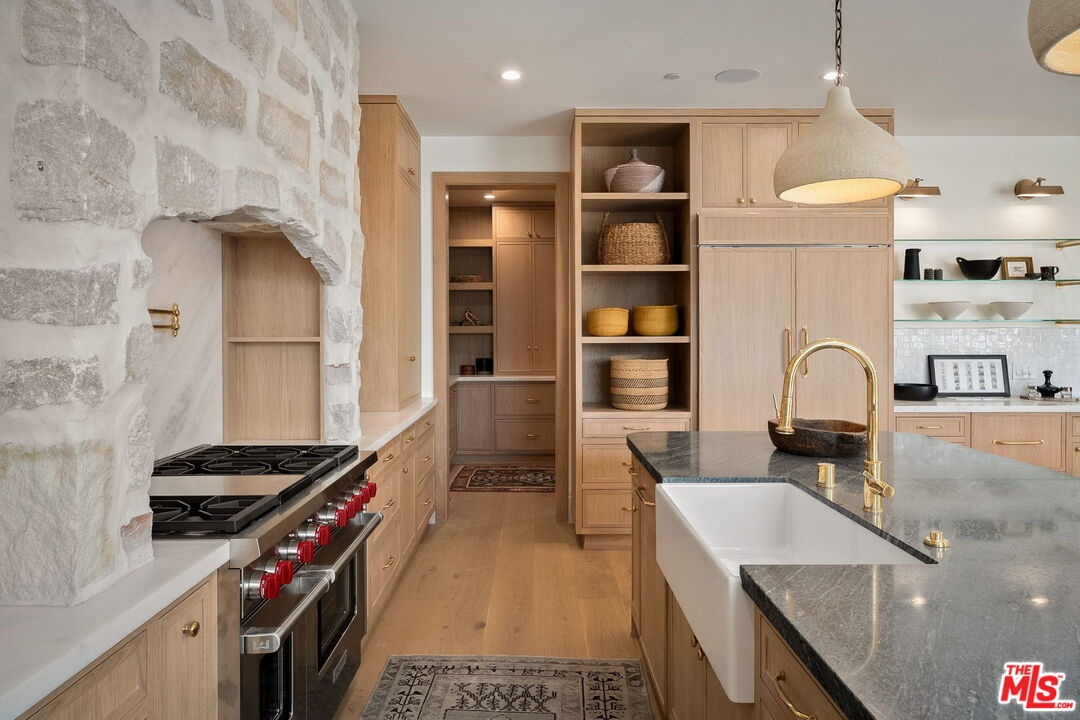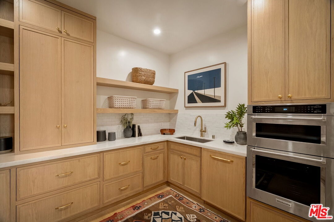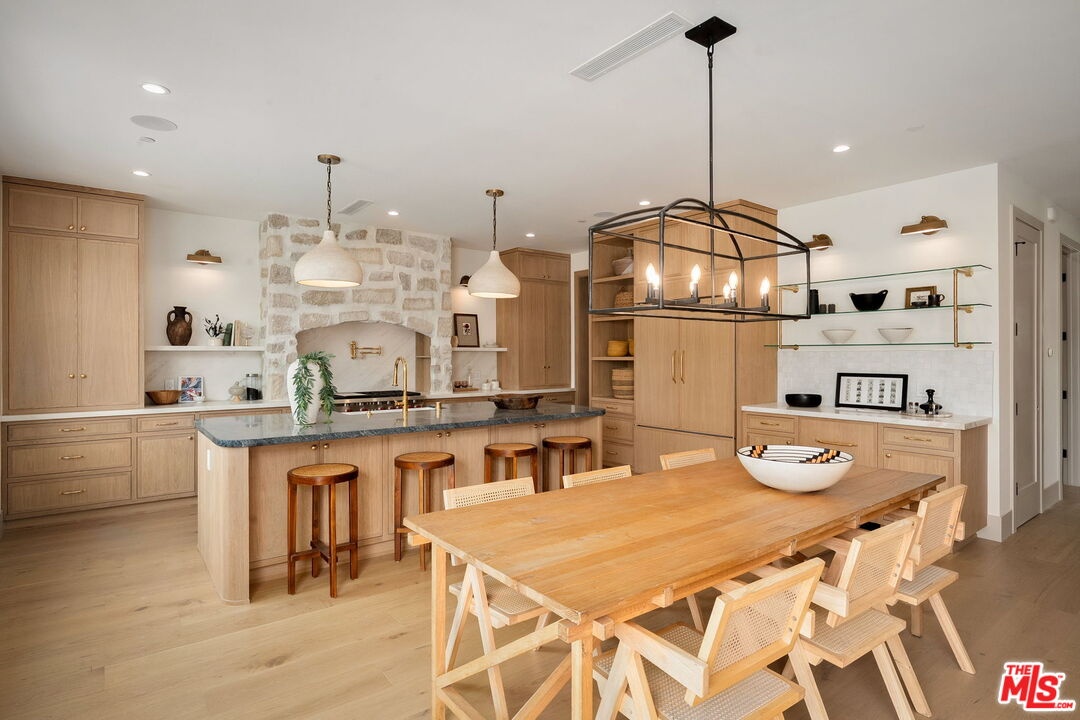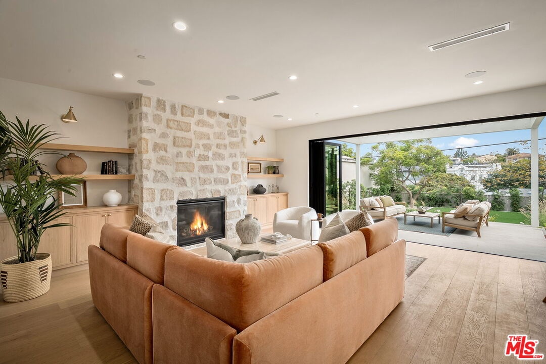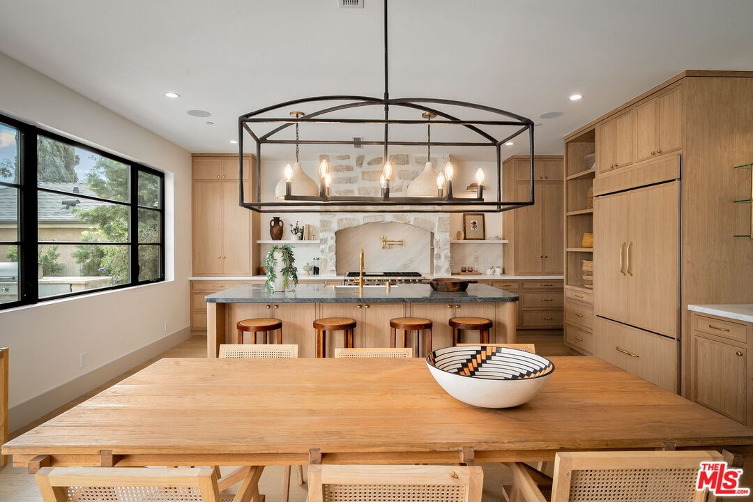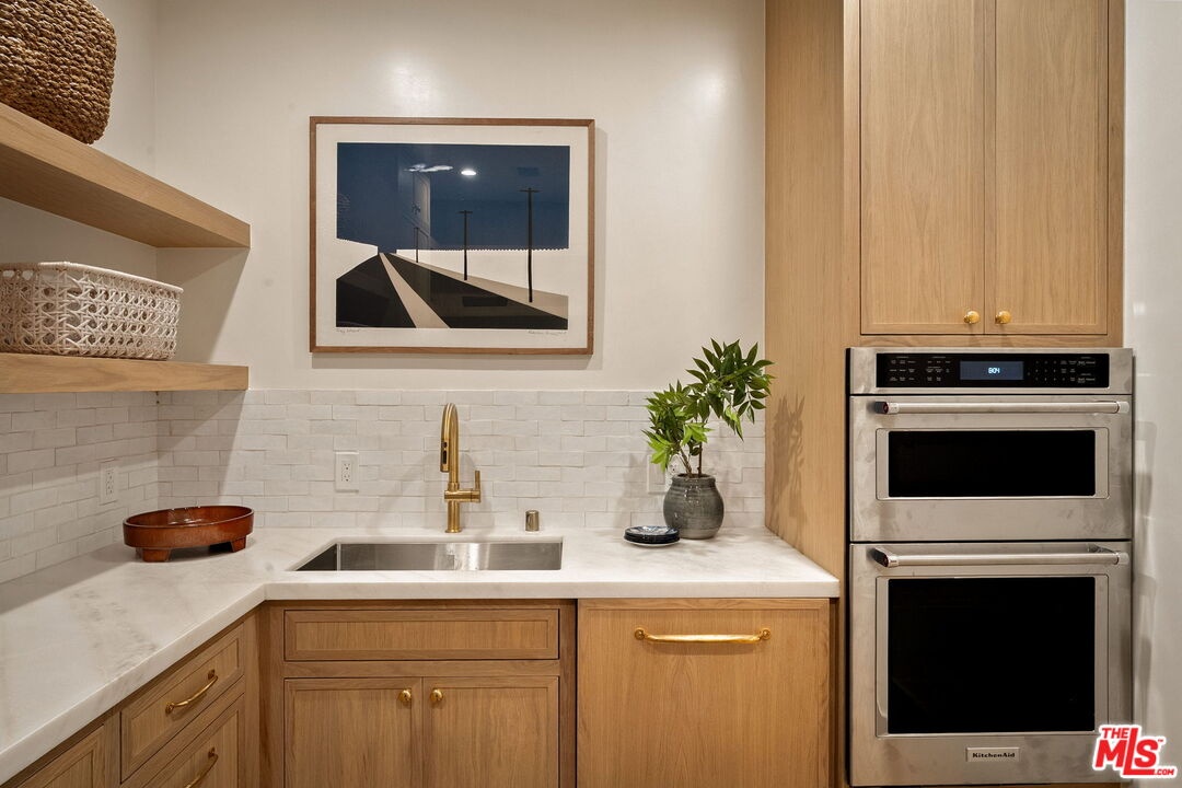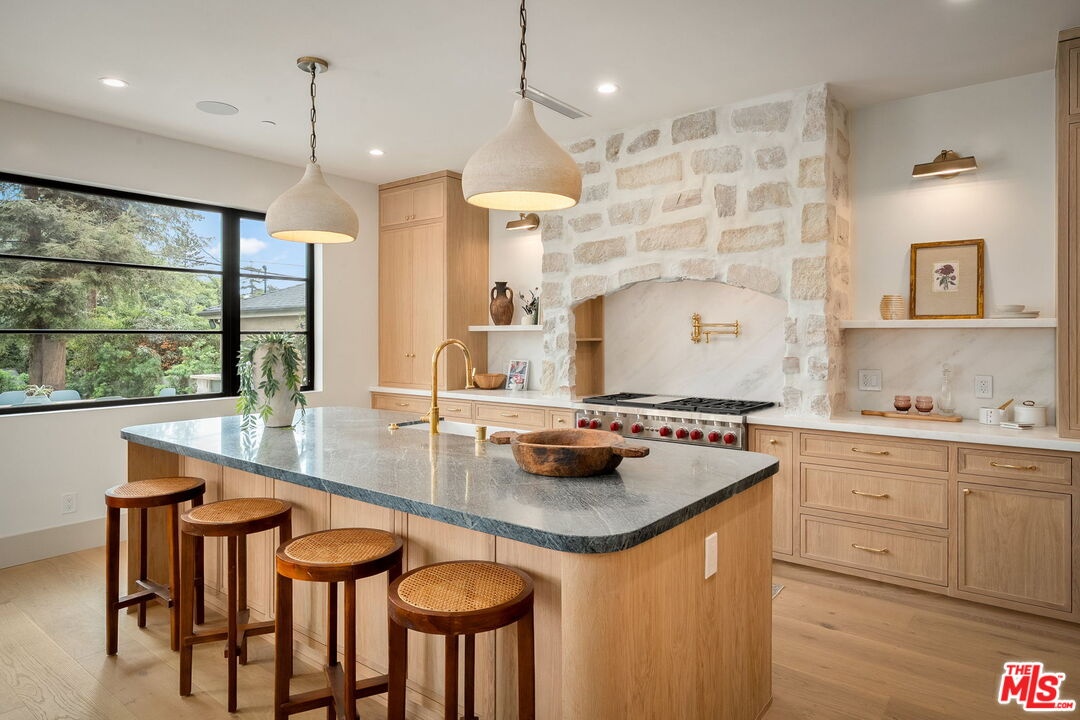 Presenting 3104 Kelton Avenue, a stunning contemporary farmhouse that blends bespoke design with modern luxury in the heart of Westside Village. From the moment you arrive, you're greeted by captivating curb appeal - drought-tolerant landscaping, a custom white oak front door, and a matching white oak garage door that set the tone for the refined craftsmanship found within. Inside, the home's open-concept layout showcases a seamless flow between the chef's kitchen, dining, and living areas. The kitchen is a true showpiece with marble countertops, a soapstone island, Wolf range, Sub-Zero refrigerator, custom walk-in wine room, and a stunning curved white oak island with marble shelving. An adjacent secondary kitchen/pantry adds both function and flexibility. The inviting living room features a stone fireplace, built-ins, and La Cantina accordion doors that open completely to create a true indoor-outdoor living experience - perfect for entertaining. Upstairs, the spacious primary suite offers a private sanctuary with vaulted ceilings, fireplace, balcony, and a custom white oak walk-in closet. The spa-like en suite bath features dual sinks, a makeup vanity, glass shower, and soaker tub. Every detail has been thoughtfully curated - from white oak hardwood floors and Milgard windows to unlacquered brass accents, integrated speakers, security cameras, and fire sprinklers throughout. Well-appointed guest rooms and beautifully designed bathrooms complement the home's refined aesthetic, while a laundry room with sink and built-in cabinetry provides everyday convenience. Outside, an enchanting yard awaits with a large patio ideal for al fresco dining, a built-in BBQ, and grassy lawn. Ideally located just moments from top shopping, dining, and entertainment on the Westside, this home perfectly embodies elevated California living.