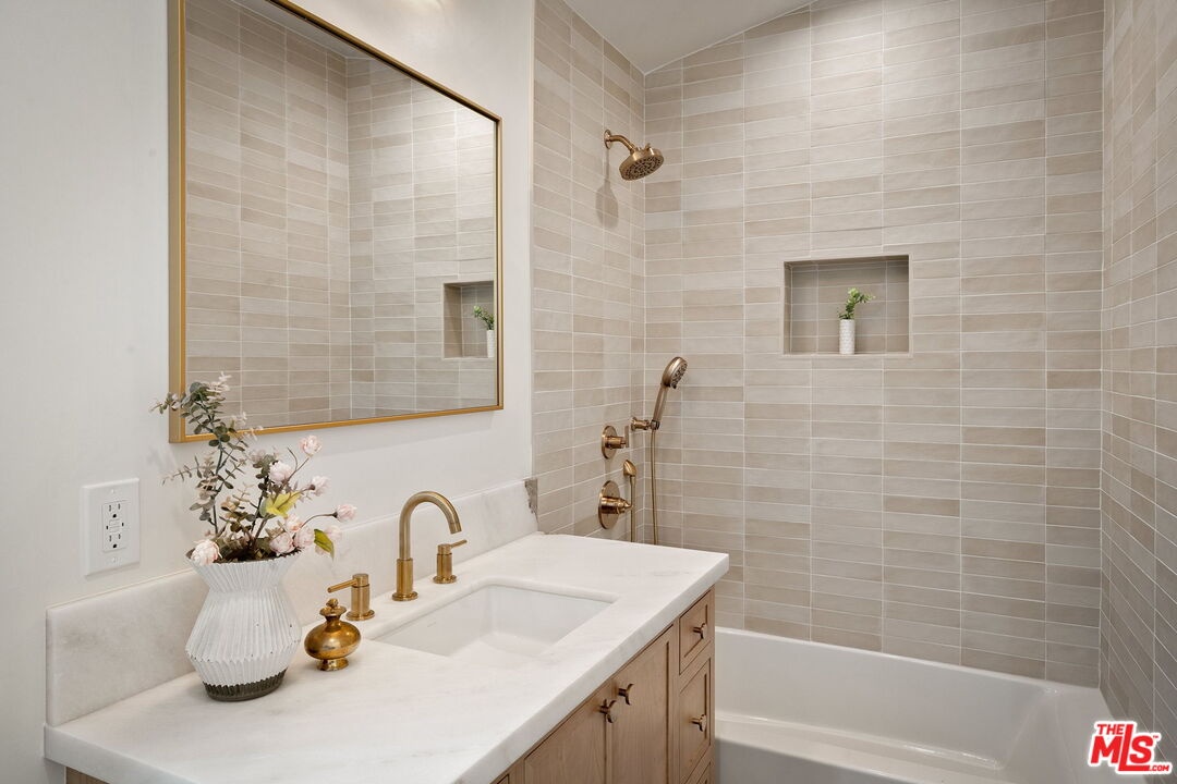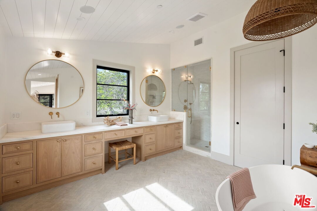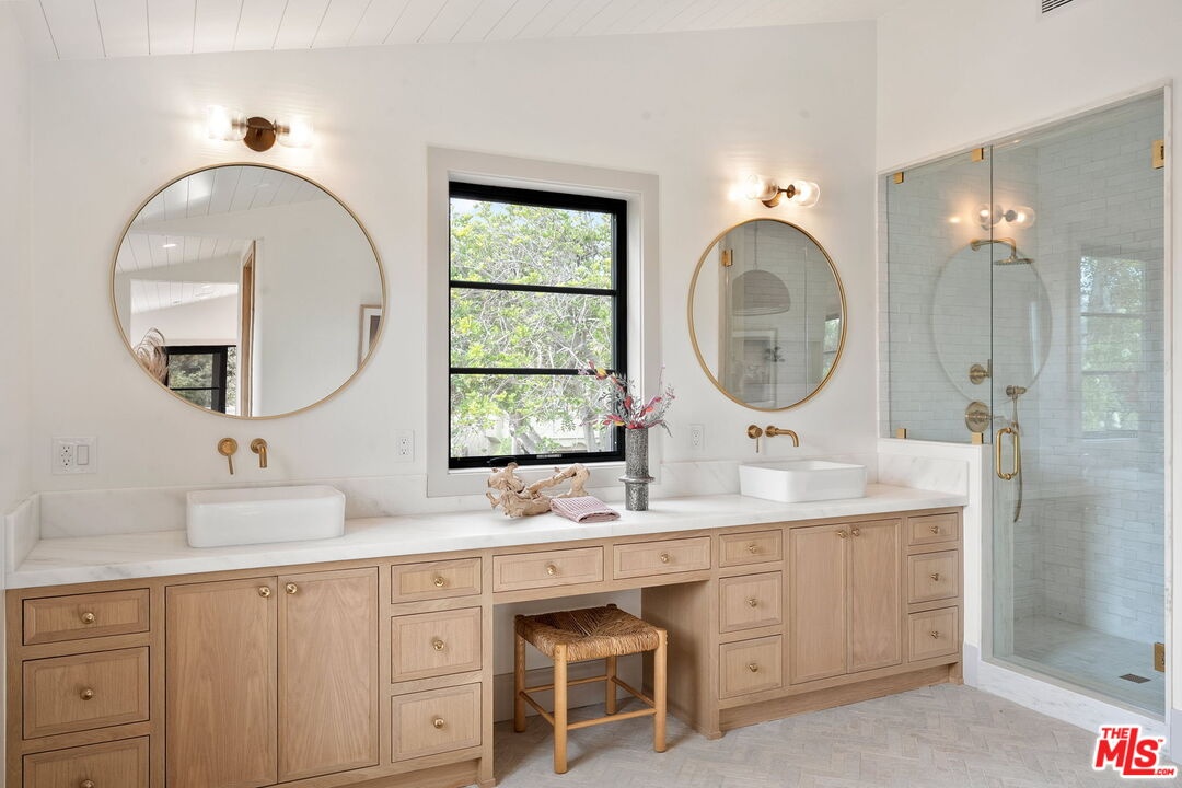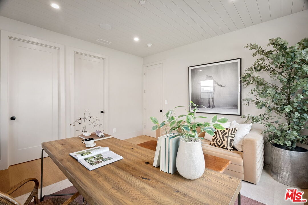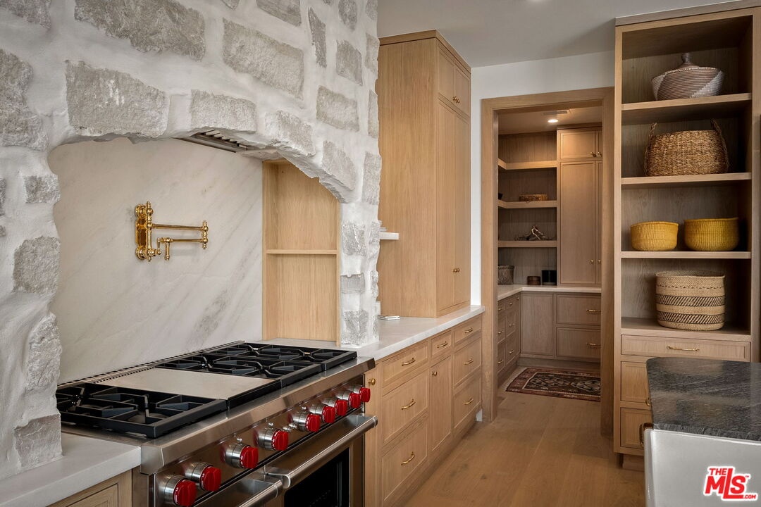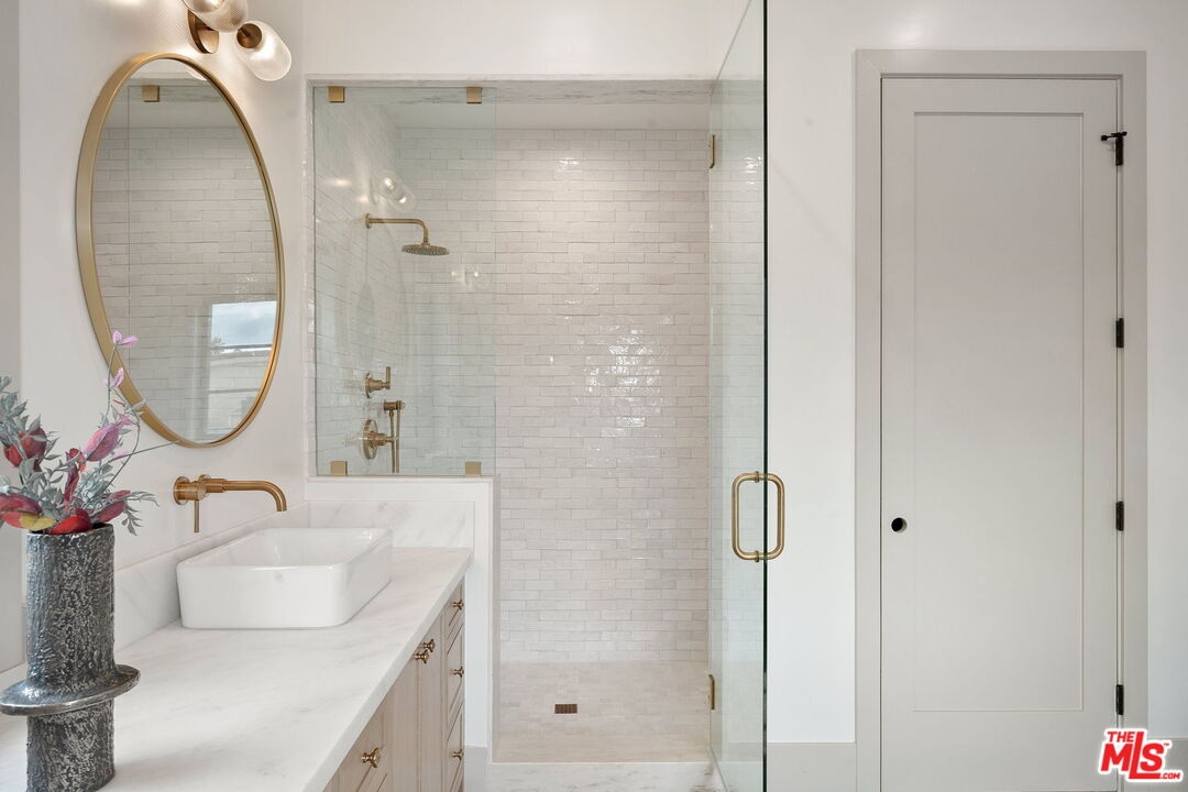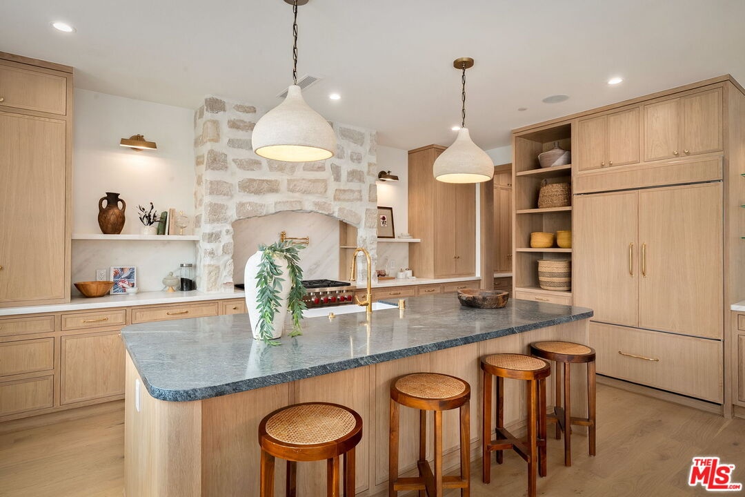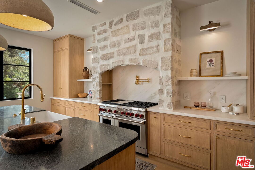 Presenting 3104 Kelton Avenue, a stunning contemporary farmhouse that blends bespoke design with modern luxury in the heart of Westside Village. From the moment you arrive, you're greeted by captivating curb appeal - drought-tolerant landscaping, a custom white oak front door, and a matching white oak garage door that set the tone for the refined craftsmanship found within. Inside, the home's open-concept layout showcases a seamless flow between the chef's kitchen, dining, and living areas. The kitchen is a true showpiece with marble countertops, a soapstone island, Wolf range, Sub-Zero refrigerator, custom walk-in wine room, and a stunning curved white oak island with marble shelving. An adjacent secondary kitchen/pantry adds both function and flexibility. The inviting living room features a stone fireplace, built-ins, and La Cantina accordion doors that open completely to create a true indoor-outdoor living experience - perfect for entertaining. Upstairs, the spacious primary suite offers a private sanctuary with vaulted ceilings, fireplace, balcony, and a custom white oak walk-in closet. The spa-like en suite bath features dual sinks, a makeup vanity, glass shower, and soaker tub. Every detail has been thoughtfully curated - from white oak hardwood floors and Milgard windows to unlacquered brass accents, integrated speakers, security cameras, and fire sprinklers throughout. Well-appointed guest rooms and beautifully designed bathrooms complement the home's refined aesthetic, while a laundry room with sink and built-in cabinetry provides everyday convenience. Outside, an enchanting yard awaits with a large patio ideal for al fresco dining, a built-in BBQ, and grassy lawn. Ideally located just moments from top shopping, dining, and entertainment on the Westside, this home perfectly embodies elevated California living.
