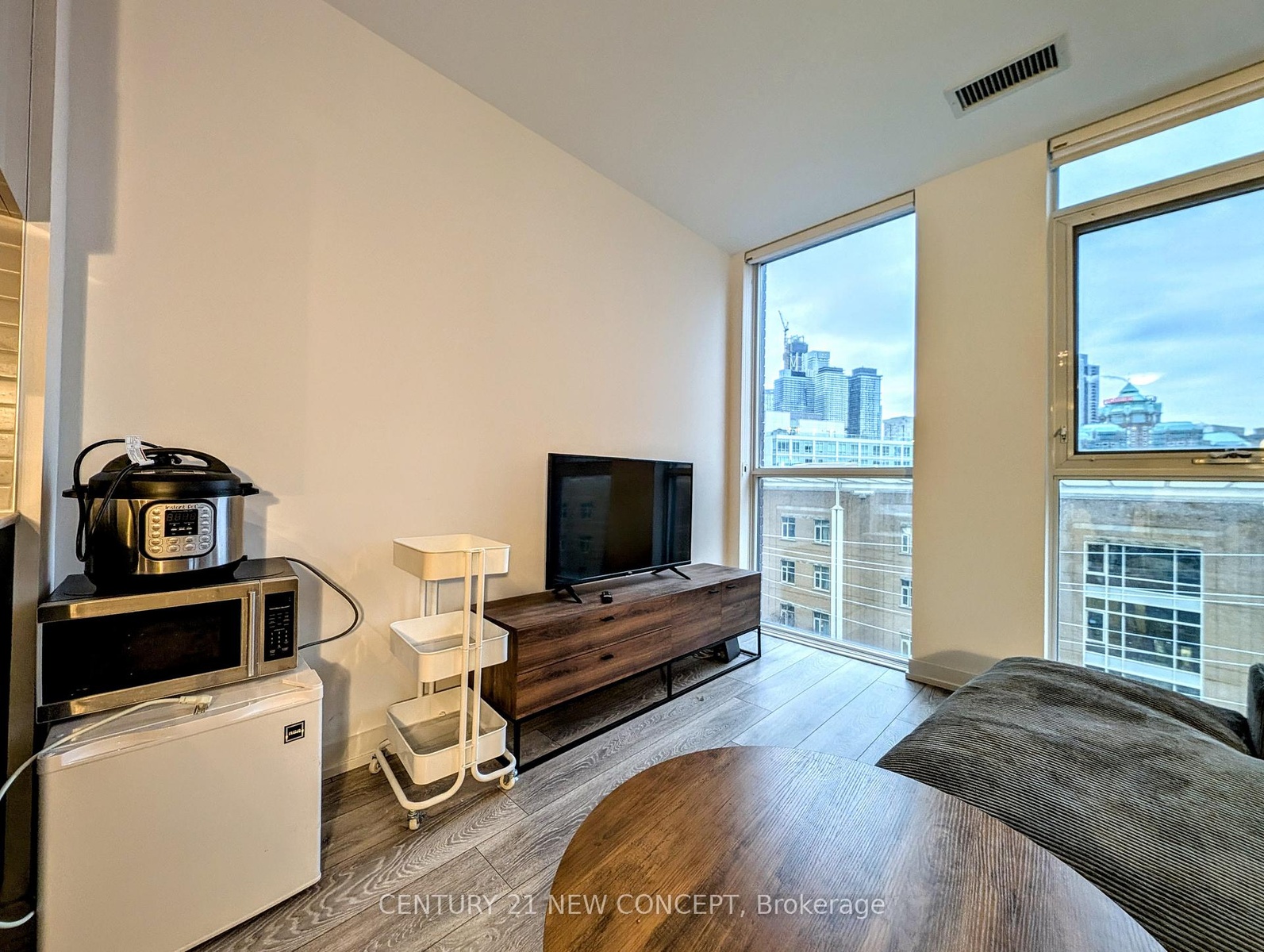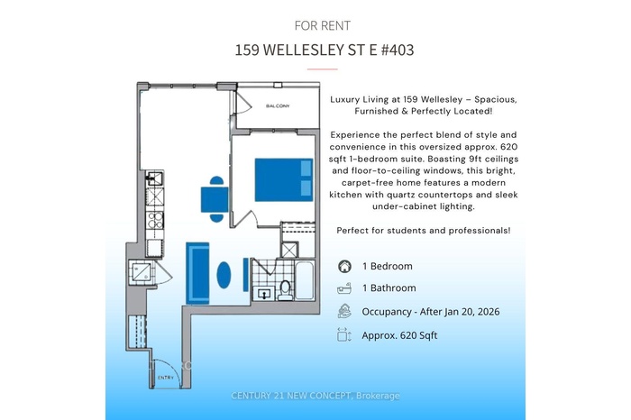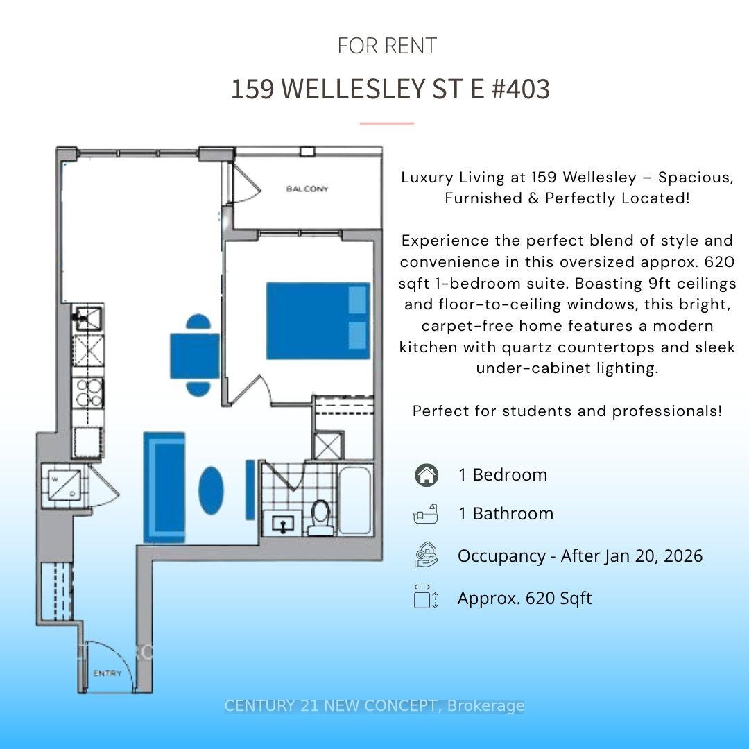 This oversized furnished 1-bedroom unit (approx. 620 sqft) offers a very spacious living area with 9ft ceilings and stunning floor-to-ceiling windows. Rental price includes INTERNET and essential furniture. Perfect for students or professionals. Building features include 24H security, gym, sauna, and a dedicated co-working space for social gatherings. Incredible neighborhood convenience: Wellesley Community Centre (Free swimming/Library) and FreshCo. Easy commute via Sherbourne or Wellesley stations. No carpet throughout.