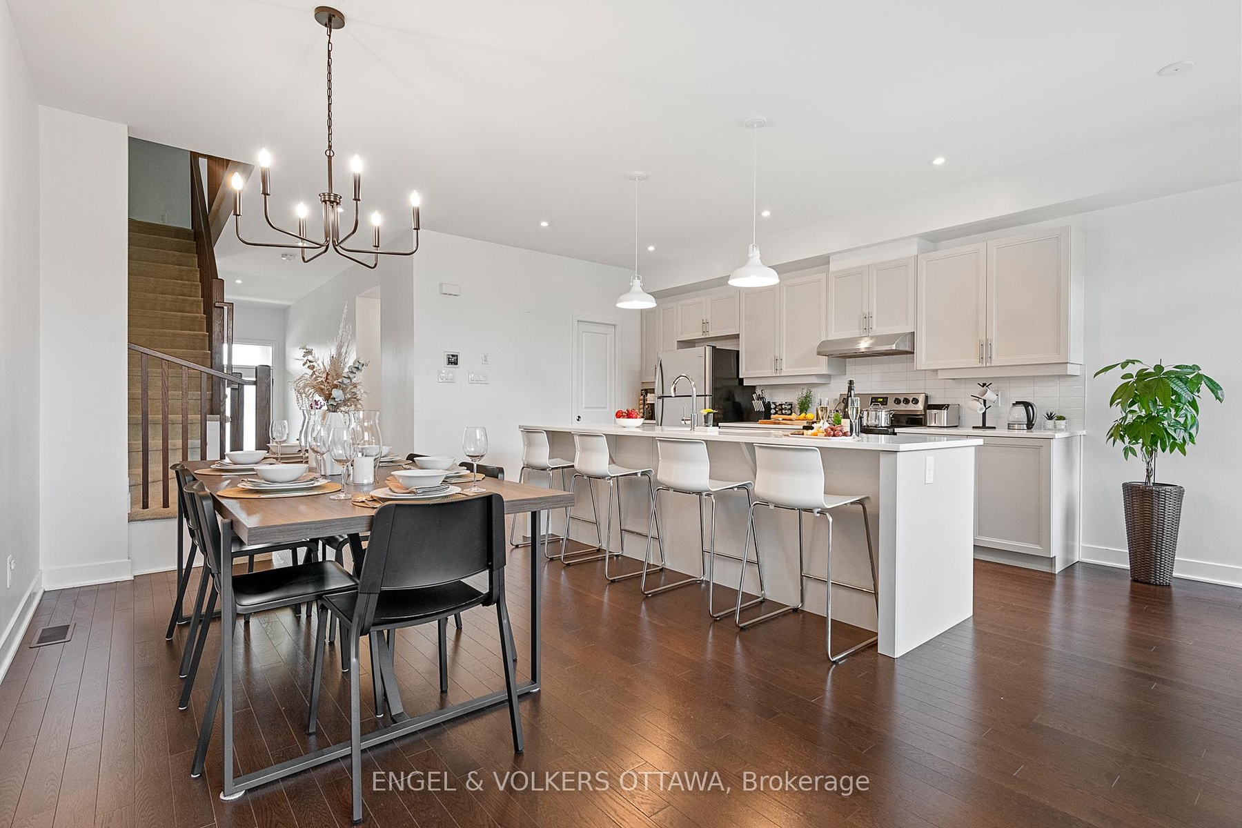 Available FULLY FURNISHED & EQUIPPED at $3,000/month or UNFURNISHED at $2,800/month. Utilities extra. Absolutely stunning Urbandale Endeavour model located in sought-after Riverside South. This 3 bedroom, 2.5 bathroom townhome features a spacious tiled foyer leading to hardwood floors and 9-foot ceilings on the main level, enhancing the open-concept layout. The kitchen is fully equipped with cookware, pots, pans, dishes, and all essential cooking utensils, and offers extended millwork, a large stone island, and overlooks the dining area, ideal for everyday living and entertaining. The bright living room showcases large windows, vaulted ceilings, and a gas fireplace. The second level includes a generous primary bedroom with 3-piece ensuite, two additional bedrooms, a full bathroom, second-floor laundry, and a loft overlooking the living area. A dedicated office workspace is included, ideal for remote or hybrid work. Additional features include a finished basement, fenced backyard, and garage parking. Conveniently located near parks, schools, shopping, and transit.