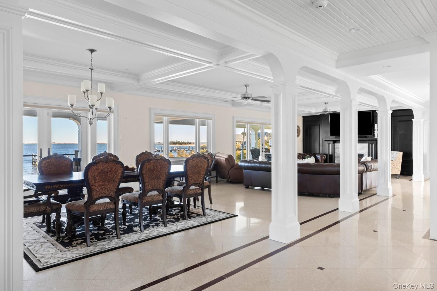 Set on 175 feet of private sandy beachfront with a 136' dock, this Shinnecock Bay waterfront residence is designed to highlight its panoramic setting and create a natural flow between interior spaces and the surrounding landscape. Multiple elevations and extensive glasswork frame open bay views from morning through evening, emphasizing light, orientation, and connection to the water. The open-concept main level includes a chef's kitchen with Wolf appliances, pantry, and a wall of glass doors that transition to the full-length mahogany deck, extending the living area directly toward the bay, infinity-edge pool, and spa. The first-floor waterfront primary suite features two walk-in closets, a spa bath with jacuzzi, and private access to the deck. A separate guest suite with private entrance, powder room, mudroom, and attached two-car garage complete the main level. The second floor offers a junior suite with terrace, a dedicated office, and a secondary living area with direct access to the upper full-length deck. Two additional en-suite bedrooms with walk-in closets, a laundry room, and a second powder room provide flexibility and privacy. Both levels include expansive rear decking, maximizing outdoor circulation and enhancing the home's orientation toward the bay. Situated south of the highway, the home is just minutes to marinas, beaches, and area dining, supporting both seasonal and year-round use. Homes offering this combination of substantial water frontage, docking capability, and modern construction are limited, making it a notable opportunity for buyers seeking direct waterfront access. This residence brings a rare alignment of features together in one setting, providing a practical and well-connected entry point to the Hamptons' coastal lifestyle.