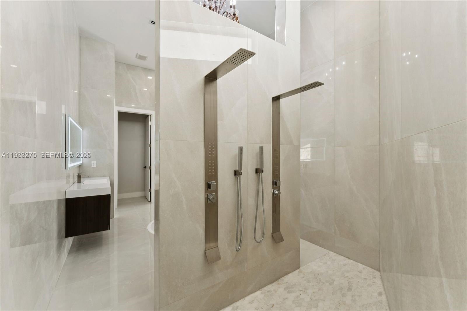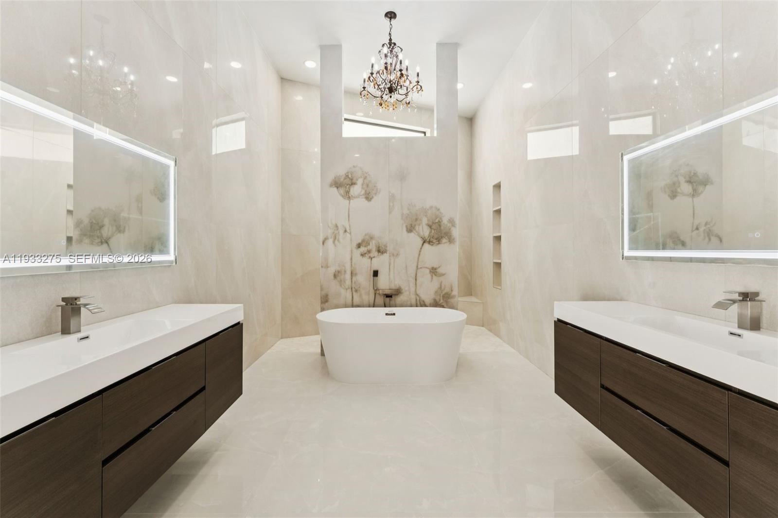 Designed for both entertaining and everyday living, the one-story floor plan showcases soaring 12-foot ceilings, elegant European Padron tile flooring, and an abundance of natural light throughout. The chef’s kitchen is appointed with Thermador stainless steel appliances, custom European-style cabinetry, and sleek modern finishes. Spa-inspired bathrooms feature DAX shower panels, while LED lighting, linear A/C vents, and high-end construction elevate the home’s modern aesthetic.